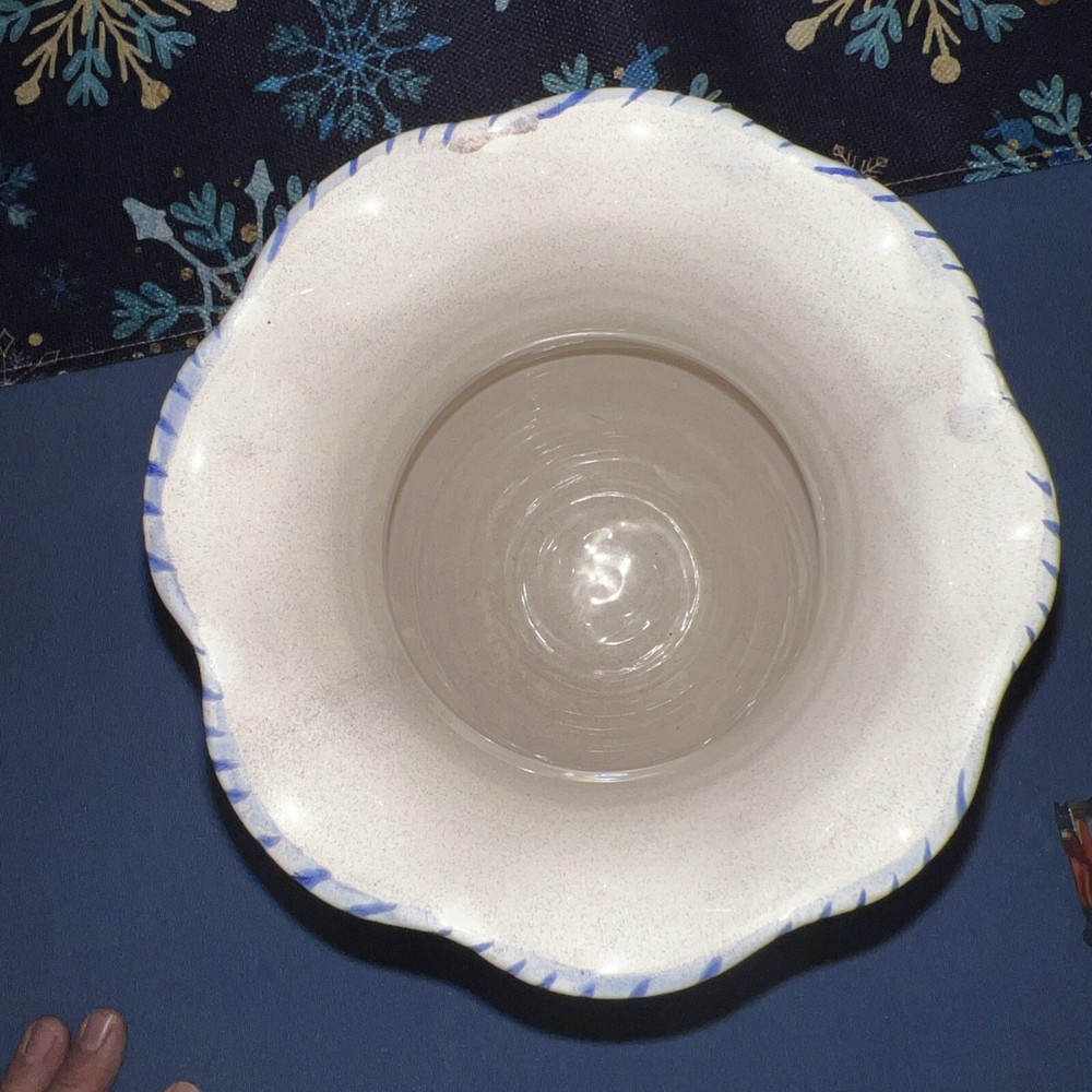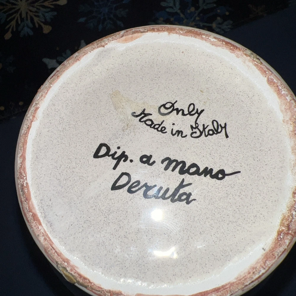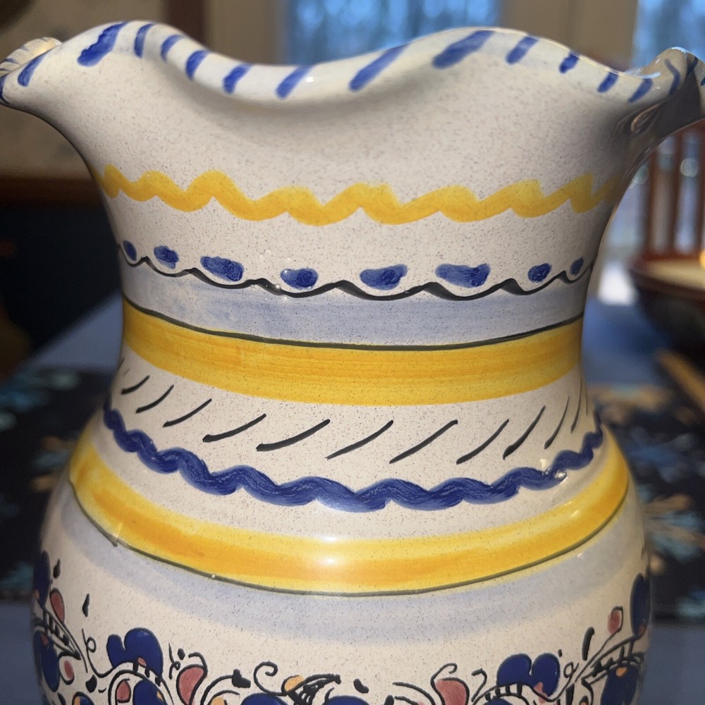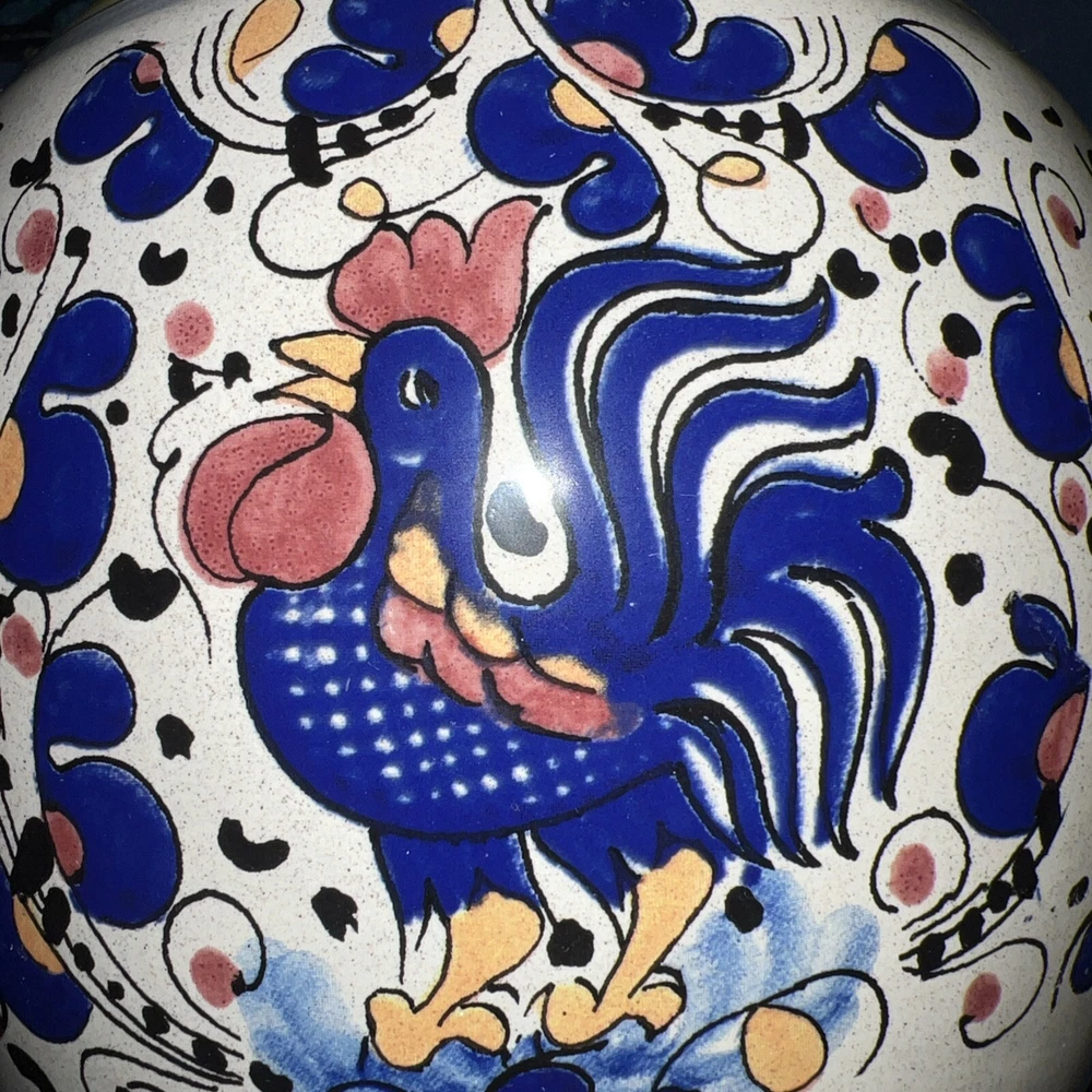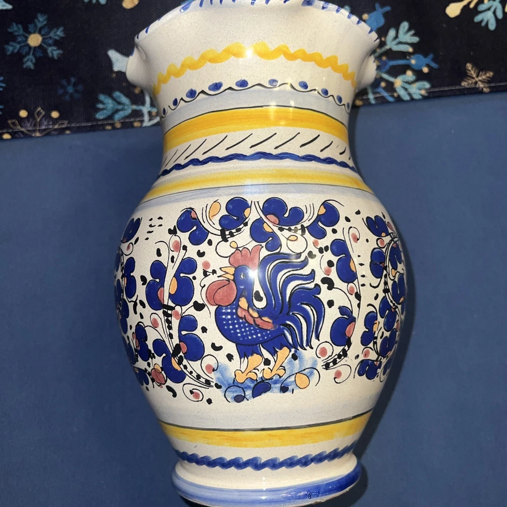This is a large ceramic vase from Deruta, Italy, known for its art pottery production. The vase features a multicolor chicken motif, hand-painted in the traditional Deruta style. Measuring 9 1/2 inches in height with a 6-inch width at the top, this vase showcases the craftsmanship and heritage of Italian pottery. The brand, Deruta, is renowned for its ceramic creations, making this piece a unique and decorative addition to any space. No chips or cracks