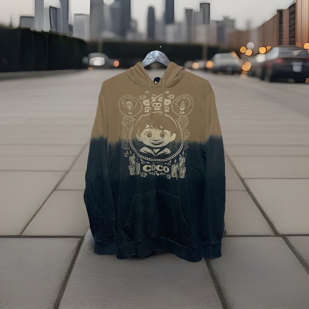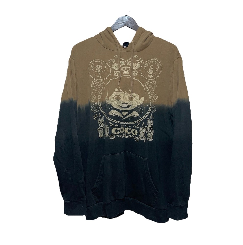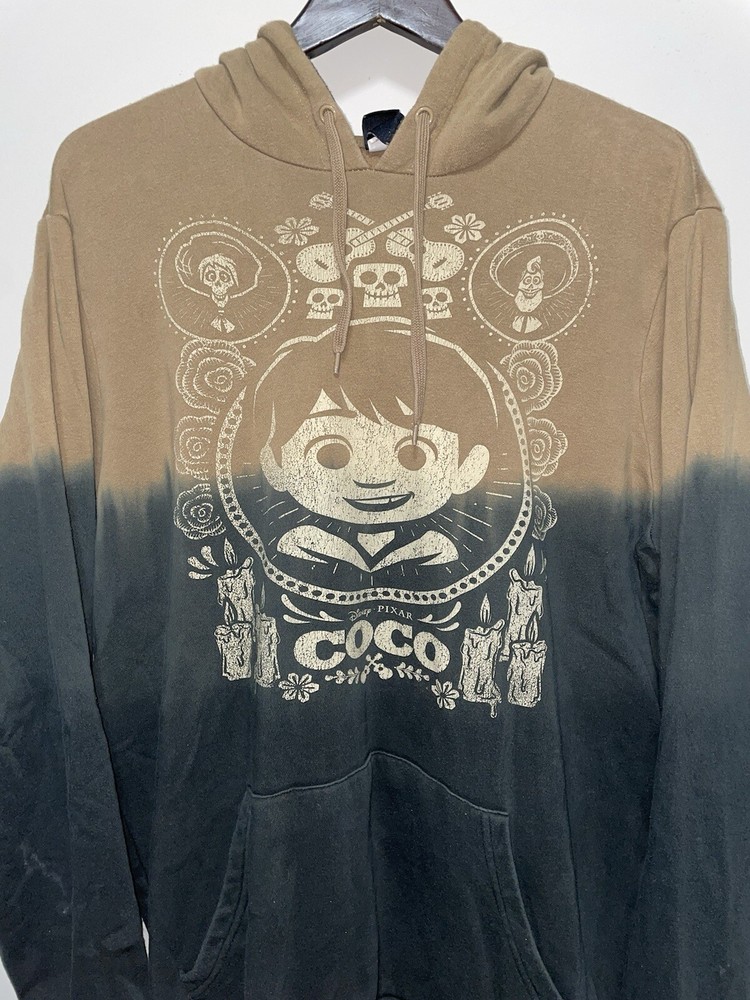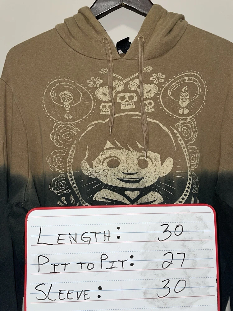 Get ready to show off your love for Disney with this amazing Pixar Coco Dip-Dye Pullover Hoodie. This unisex hooded sweatshirt features a round neckline and long sleeves with drawstring closure. The hoodie is made of a comfortable cotton/polyester blend material with a knit fabric type and features a stylish graphic print of Miguel, the main character from the movie. No rips snags or stains Length 30 in. Pit to pit 27 in. Sleeve 30 in.