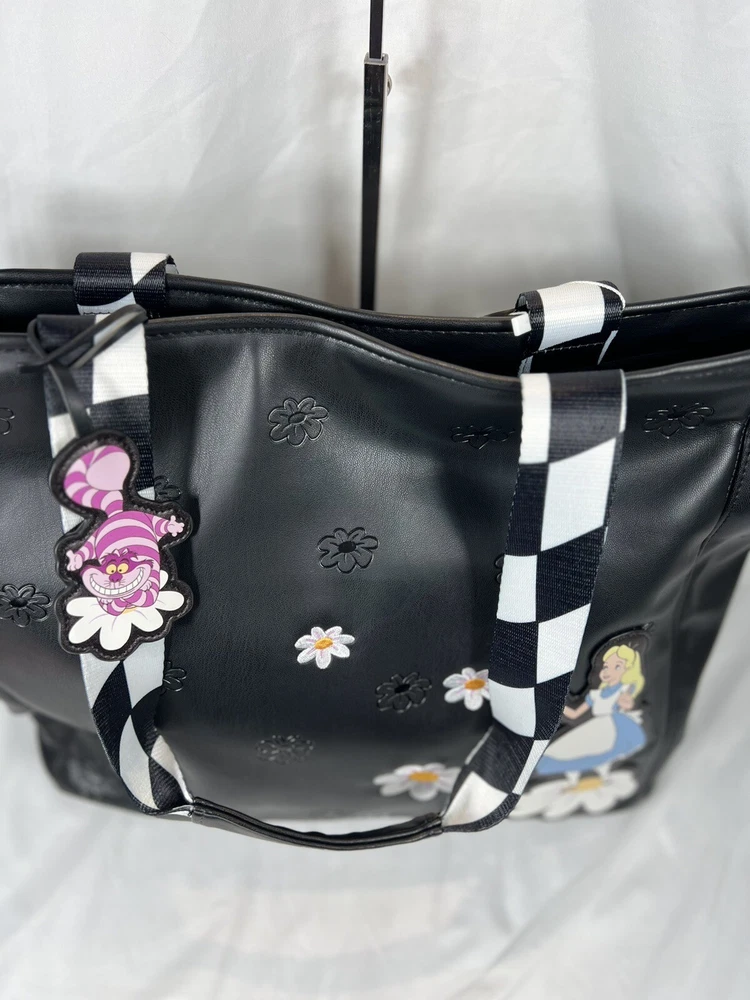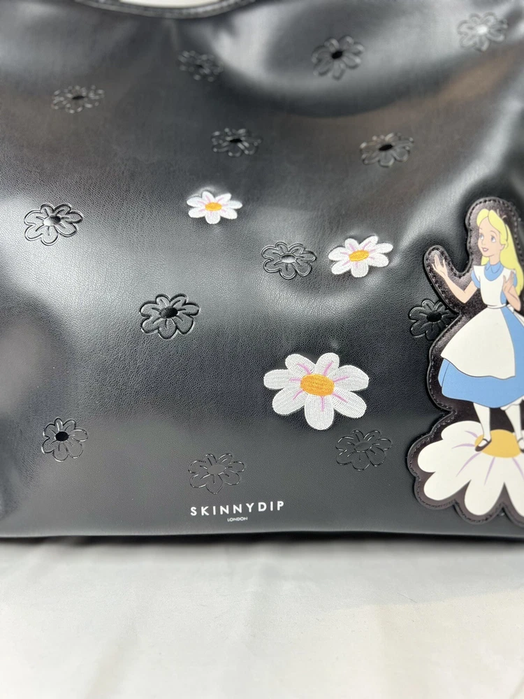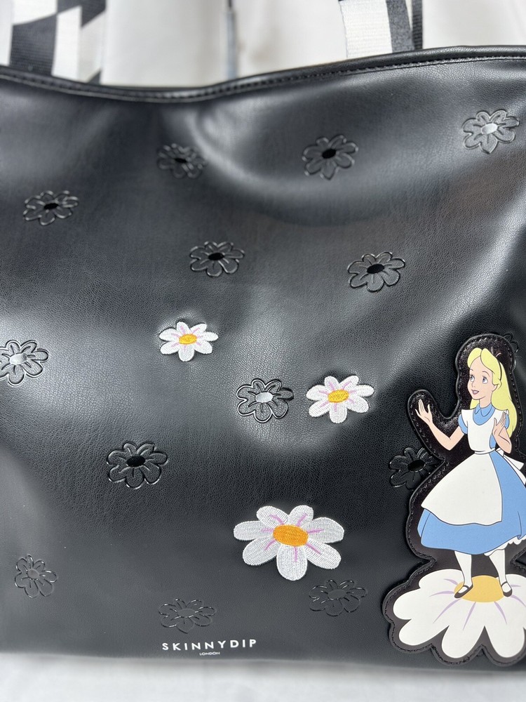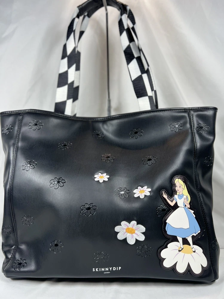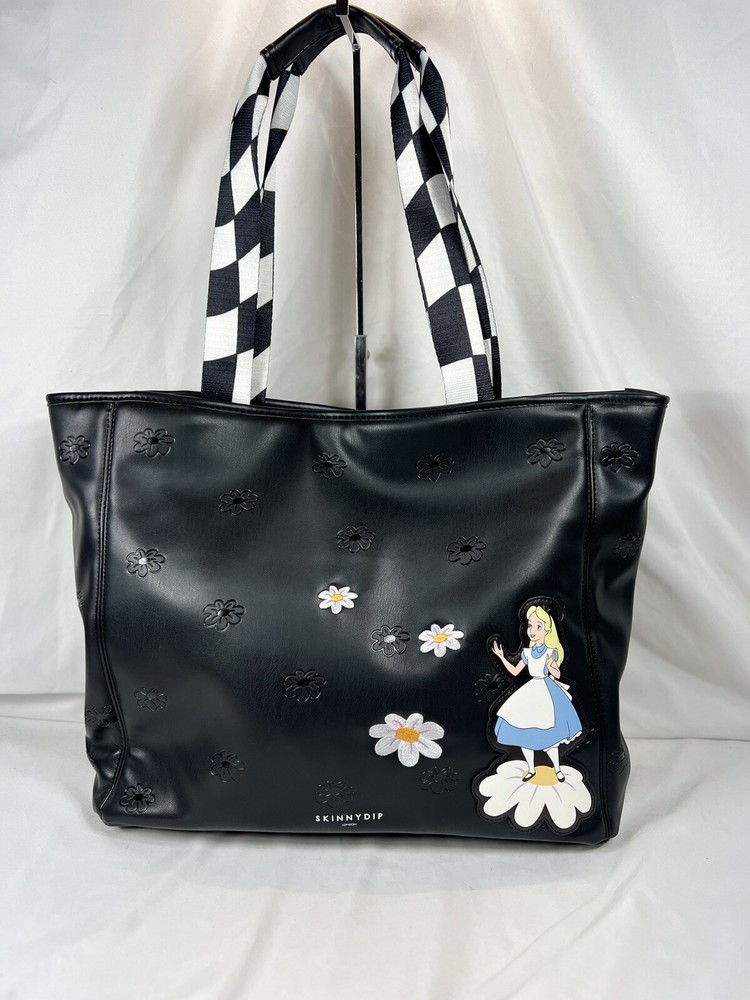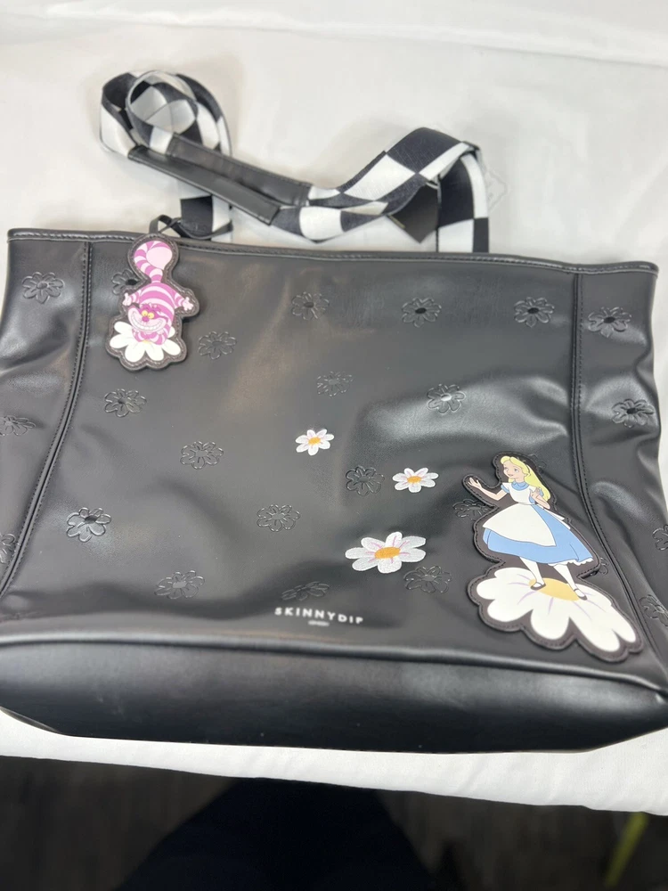 This Disney and Skinny Dip Alice in Wonderland Large Tote is a must-have for any Disney fan! The tote features an imprinted flowers pattern and is made of imitation leather with a multicolor handle/strap. It is perfect for travel, party/cocktail, or casual occasions. The tote has a snap closure and is lined with inner pockets for convenience. The bag charm adds a touch of personality to the tote. This rare tote is brand new with tags and is part of the Skinnydip London product line. It is perfect for any woman who loves Disney and Alice in Wonderland. Get yours today and add a touch of magic to your wardrobe!