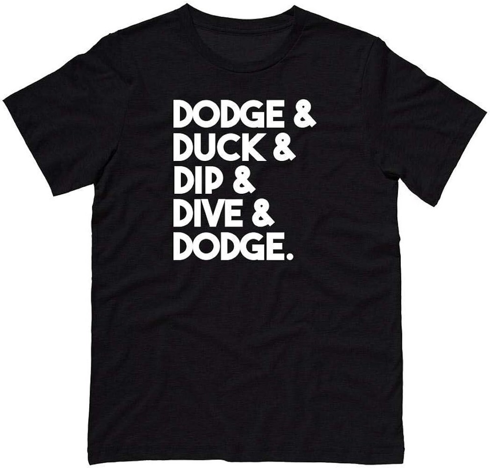 Show off your sense of humor with this black Dodge & Duck & Dip & Dive & Dodge t-shirt. Made of comfortable cotton material, this regular-fit shirt features short sleeves and a crew neck. The shirt is available in sizes S-5XL and has a vintage feel to it. The graphic print of the shirt is sure to catch everyone's attention. It is perfect for men who want to add a touch of fun to their wardrobe. This t-shirt is a great addition to any casual outfit and is sure to turn heads.
