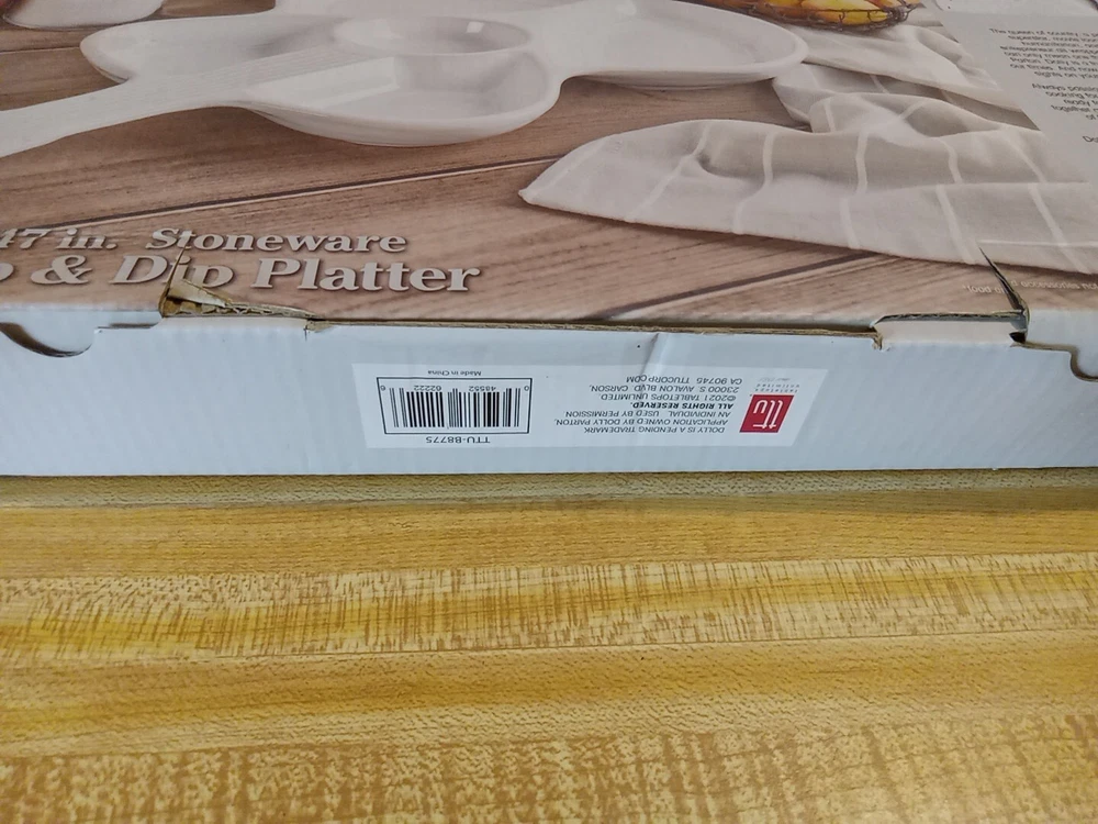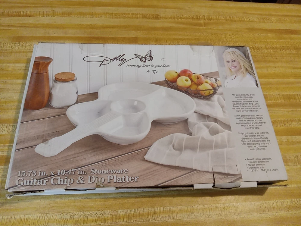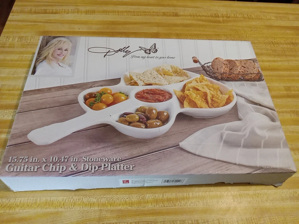 Serve up some Southern-style snacks with this Dolly Parton stoneware guitar chip & dip platter. This large tray features five compartments, perfect for holding a variety of snacks and dips. The glossy white finish and country-style design, featuring guitars, make this platter a great addition to any occasion. Not only is this tray stylish, but it's also practical - it's dishwasher and refrigerator safe for easy cleaning and storage. Measuring at 15.75 inches in length and 10.47 inches in width, this platter weighs 3.75 pounds. It's the perfect serving piece for your next gathering.