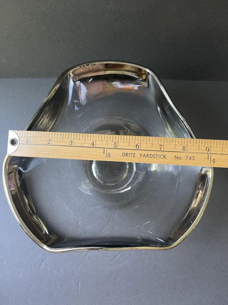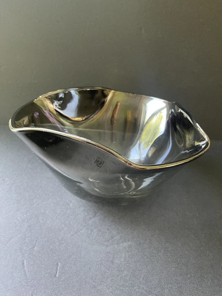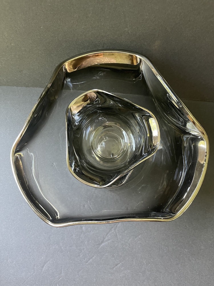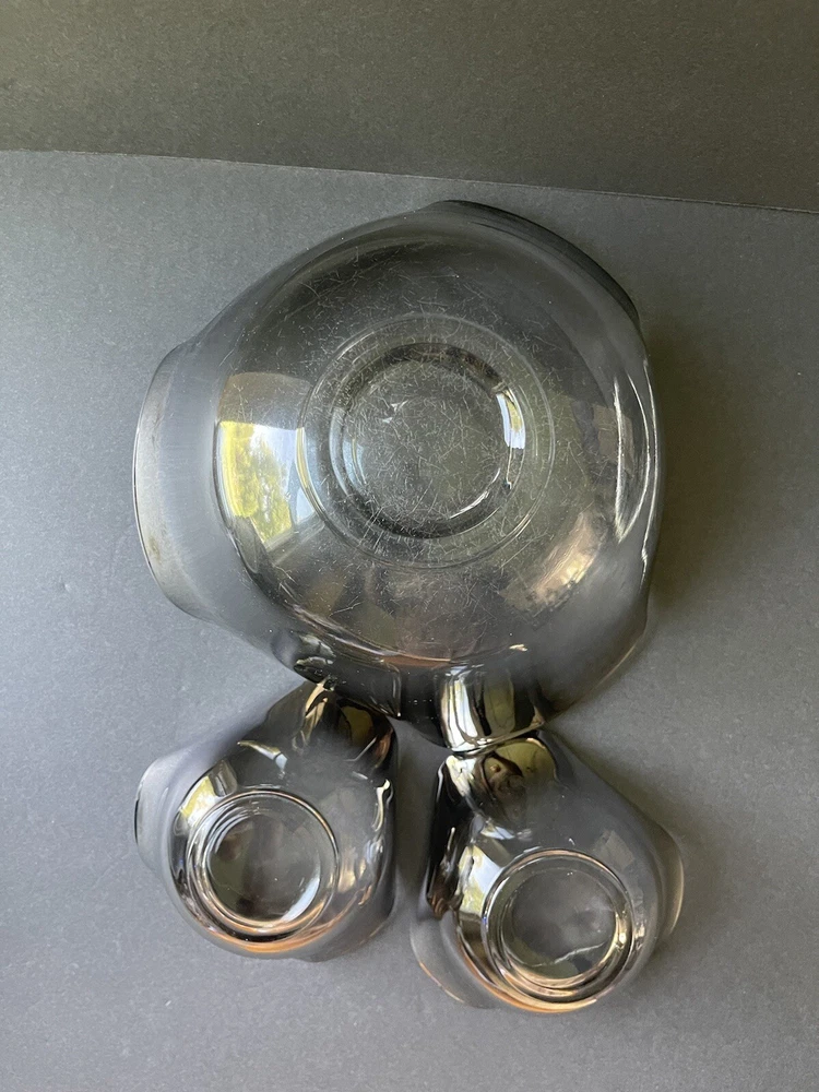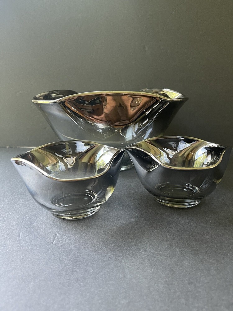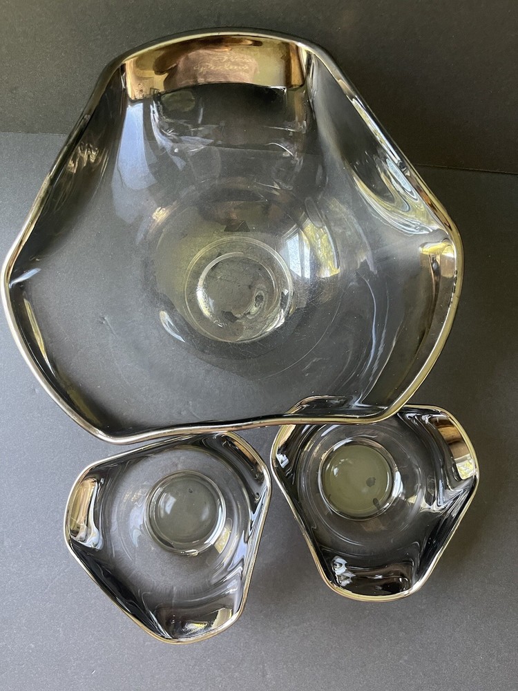 This beautiful three-piece bowl set by Dorothy Thorpe features a vintage silver fade rim that adds a touch of mid-century modern style to any occasion. The bowls are made of high-quality glass, making them both decorative and functional. The set includes a large chip bowl and two smaller dip bowls, perfect for all occasions. The bowls are in excellent condition and have been carefully stored to preserve their vintage charm. Add this stunning Dorothy Thorpe bowl set to your collection today! Larger dip bowl has surface scratches on bottom Minor surface marks on smaller ones See photos for details