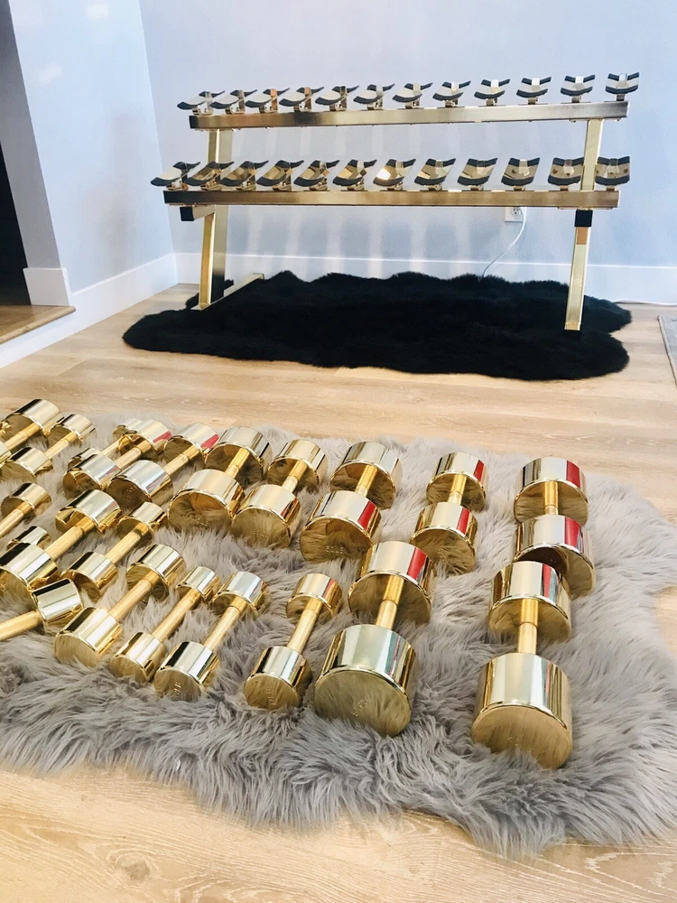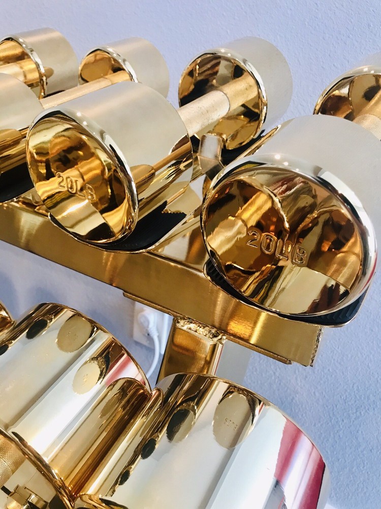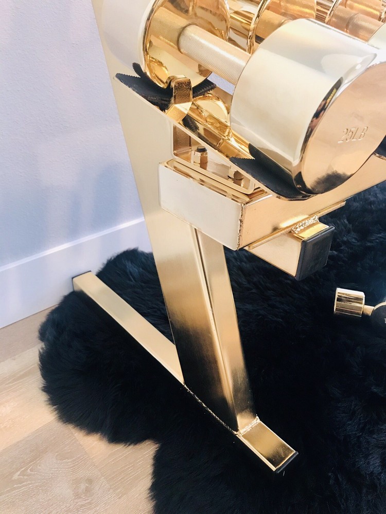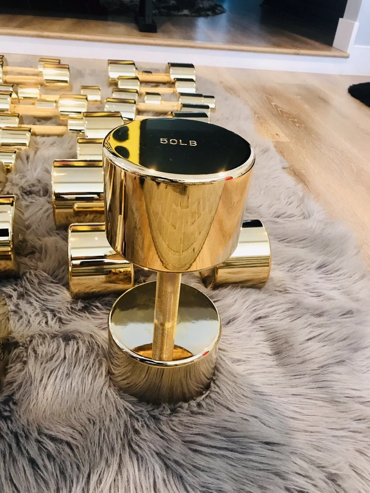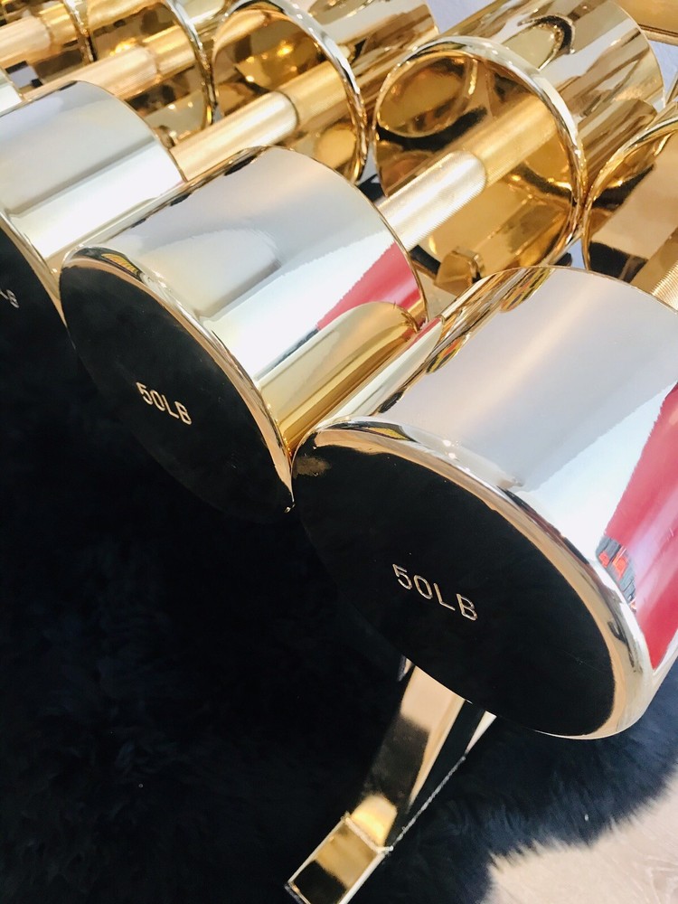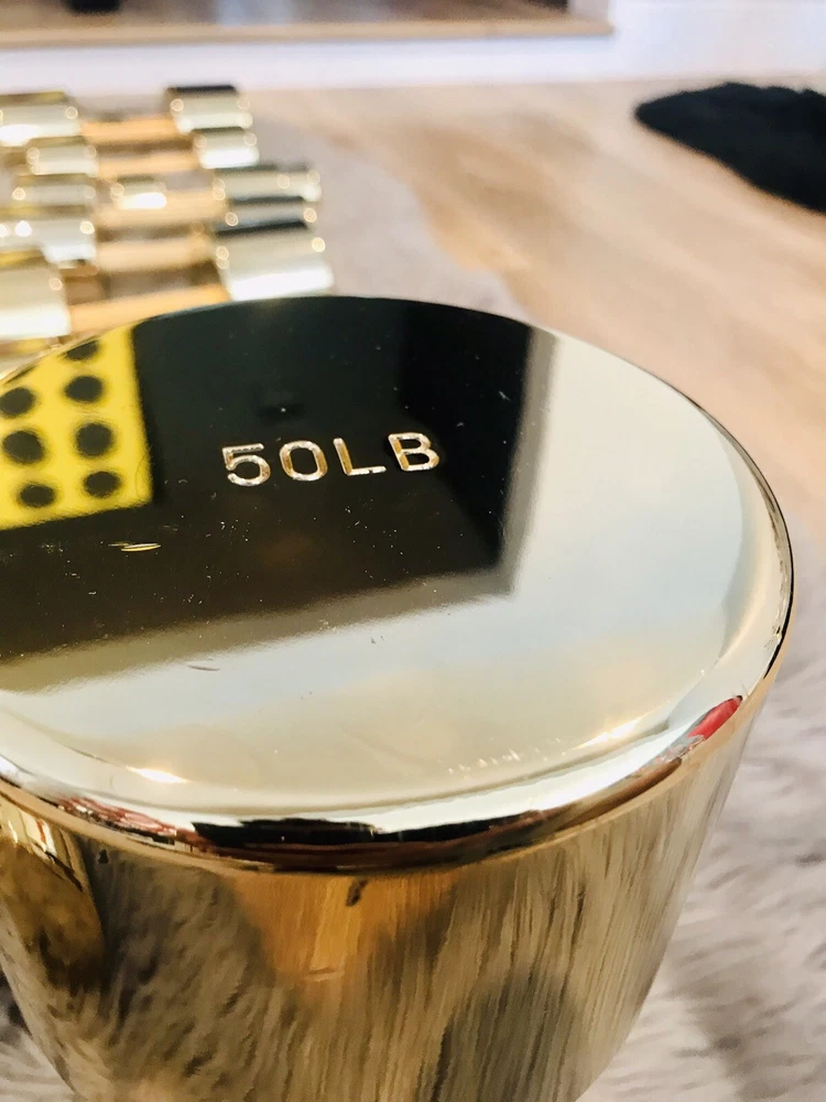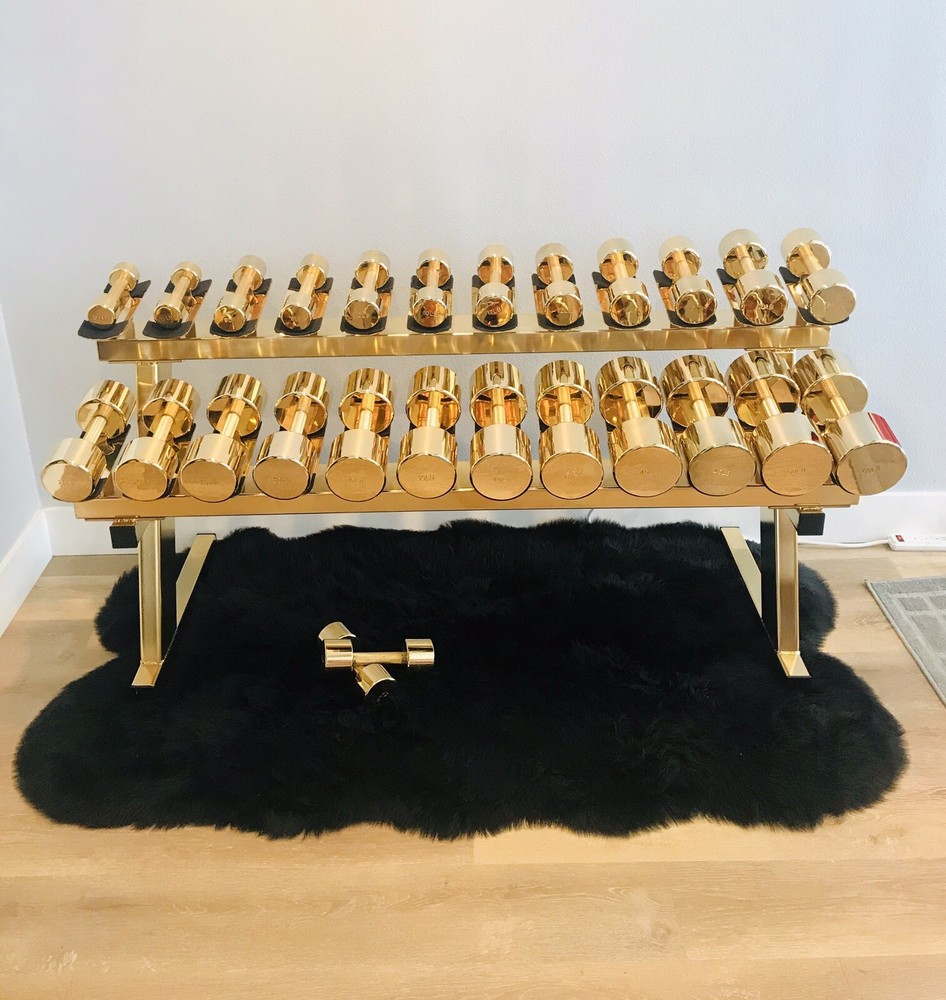 This gold weight set comes with all the weights that you see in the photos plus the weight rack. This set has been dipped in 24k gold. This functional art piece would be a great addition to your home gym, office, man cave, or any other place that needs some cool art. This set includes a pair of dumbbells that weigh 5Lbs 8Lbs 10Lbs 12Lbs 15Lbs 20Lbs 25Lbs 30Lbs 35Lbs 40Lbs 45Lbs 50Lbs More items available on my site: BlueCardiel.com