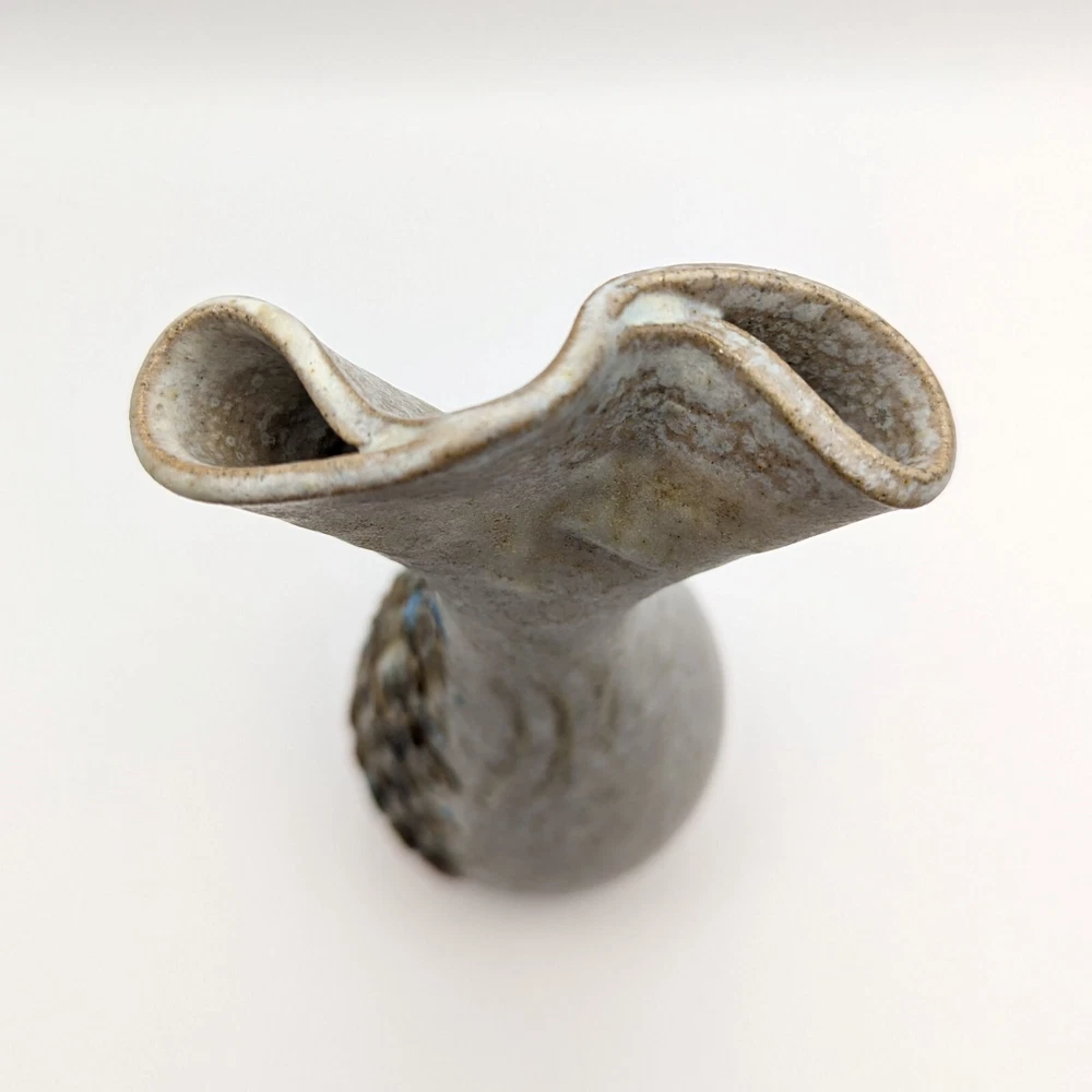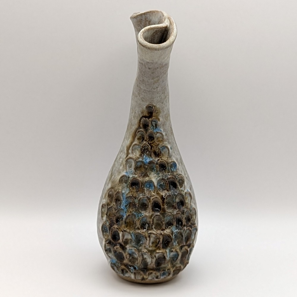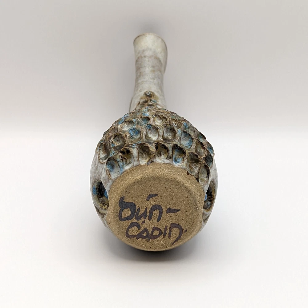 Dunquin Pottery is a small pottery studio located in the village of Dunquin on the Dingle Peninsula in County Kerry, Ireland. The pottery was established in 1975 by Louis Mulcahy, a master potter who had previously worked for the renowned Irish pottery company, Belleek. Dunquin Pottery specializes in creating handcrafted stoneware and porcelain pottery pieces that are known for their quality and unique designs. The studio's products include a wide range of items, including bowls, plates, mugs, vases, and more, all made with the same level of attention to detail and quality craftsmanship. Dunquin Pottery's designs are often inspired by the natural beauty of the surrounding landscape, and many of the pieces feature motifs and patterns that reflect traditional Irish culture and heritage. Condition: Like new, no damage noted. Dimensions: 6" height, 3" diameter top, 2.25" diameter body, approx.