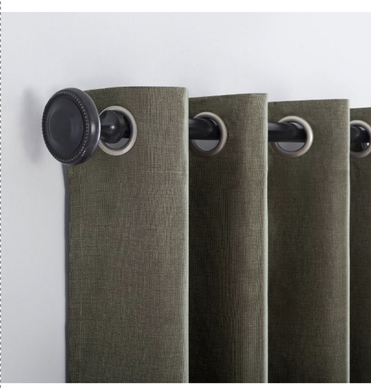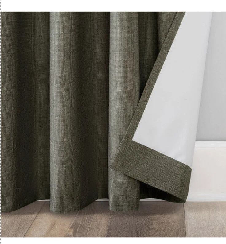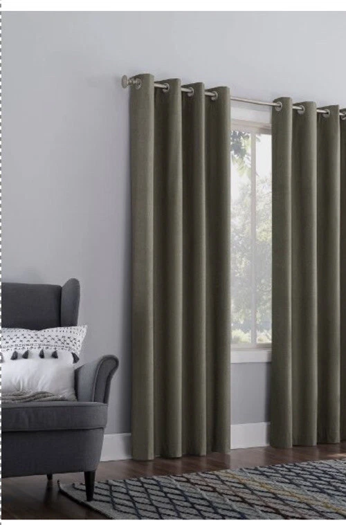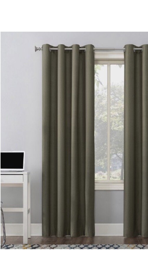 Duran Thermal Insulated Blackout Grommet Curtain, Sun Zero, 108" Olive Green New This item is new. Includes one panel. Total Blackout technology blocks out 100% of outside light while enhancing privacy Thermal insulation helps keep summer heat and winter chill out of your home Energy efficient design reduces energy lost through your windows by up to 35% Noise reduction up to 35% helps you get a sounder, more uninterrupted sleep Built-in metal grommets fit curtain rods up to 1.5" in diameter Each panel sold separately. Sun Zero Duran Curtain Panels provide the ultimate in light blocking technology to keep out even the harshest of light while bringing a subtle texture to any room of your home. Sun Zero Total Blackout technology is laboratory tested to block out 100% of light, reduce outside noise by up to 35%, and decrease energy lost through your windows by up to 35%. Comfort is optimized with thermal insulation that helps keep summer heat and winter chill out of your home. Equipped with built-in metal grommets for easy hanging on standard curtain rods up to 1.5" in diameter. Hang in your entertainment room to eliminate screen glare and reduce distracting outside noise, or in your bedroom for enhanced privacy and a sounder, more uninterrupted sleep. Sold as individual panels. Measure carefully before selecting your desired size and quantity. Rod not included. Machine wash cold on gentle cycle. Use non-chlorine bleach when needed. Tumble dry on low heat, using a cool iron as needed.