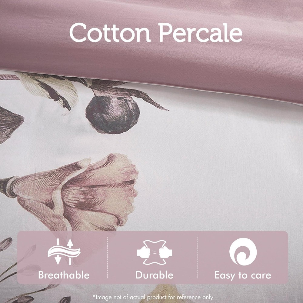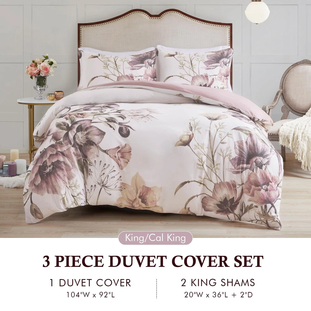 Modern shabby chic cozy duvet cover set to update your bedroom decor with a charming farmhouse cottage décor or a country living lifestyle. Cotton percale, this duvet cover and matching shams feature a large floral print in soft blush hues to create a gorgeous look Naturally breathable and lightweight cotton poly blend fabric equipped with 4 corner ties and button closure to secure the filled insert from shifting Set includes: 1 Duvet Cover: 104"W x 92"L, 2 King Shams: 20"W x 36"L + 2"D Care instructions: machine washable