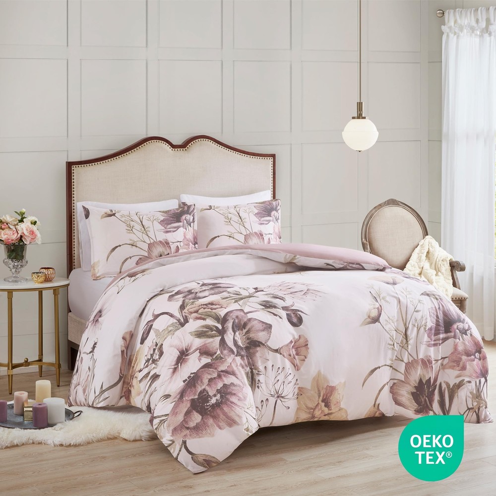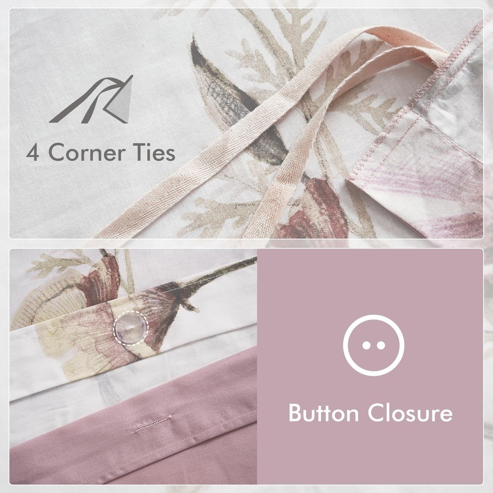 This duvet set instantly transforms my bedroom into a cozy retreat! The soft blush floral pattern gives it such a charming farmhouse vibe, and the cotton-poly blend feels breathable yet luxurious. Love how the ties keep my comforter perfectly in place, and the button closure is so secure. The shams complete the look—so elegant and comfortable. Washes beautifully, too! Highly recommend for anyone wanting a stylish and comfy upgrade.