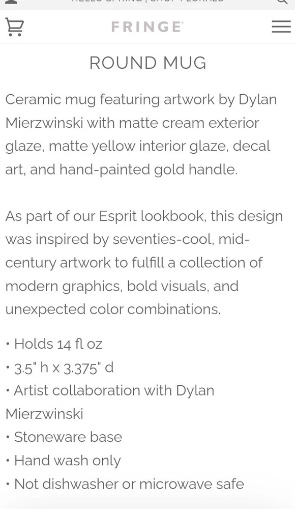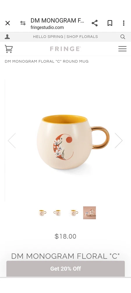 This exceptional mug from Fringe Studio's Dylan collection is perfect for all occasions. The globe-shaped letter C floral monogram mug features a beautiful floral pattern with multicolor hues, making it an ideal addition to your dinnerware and serveware collection. ***Great Condition*** Small dark dot that is part of the manufacturing process. Please see pics