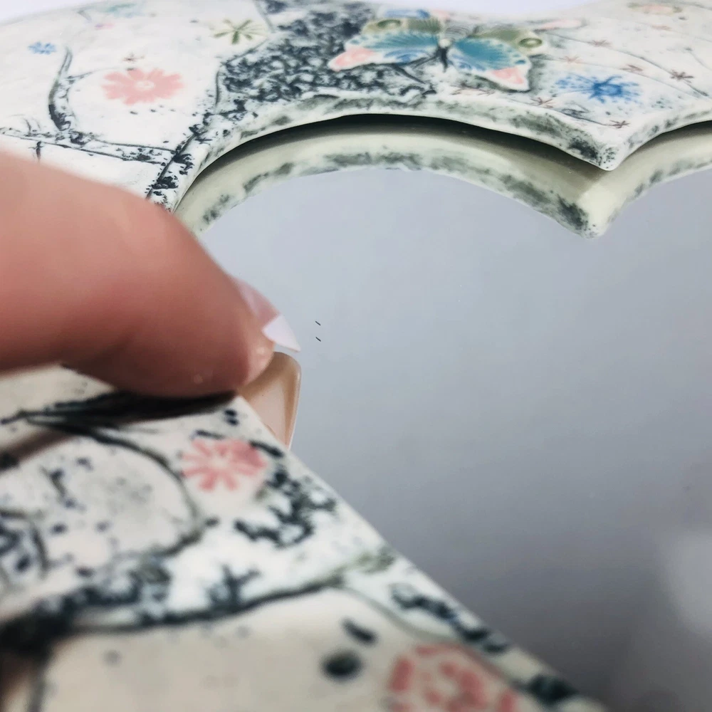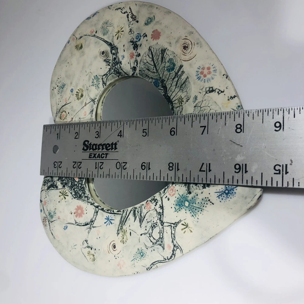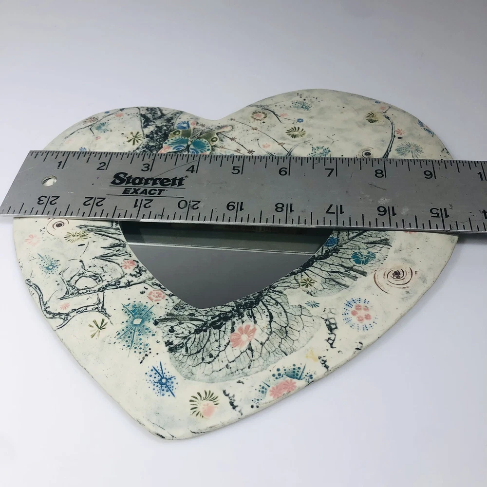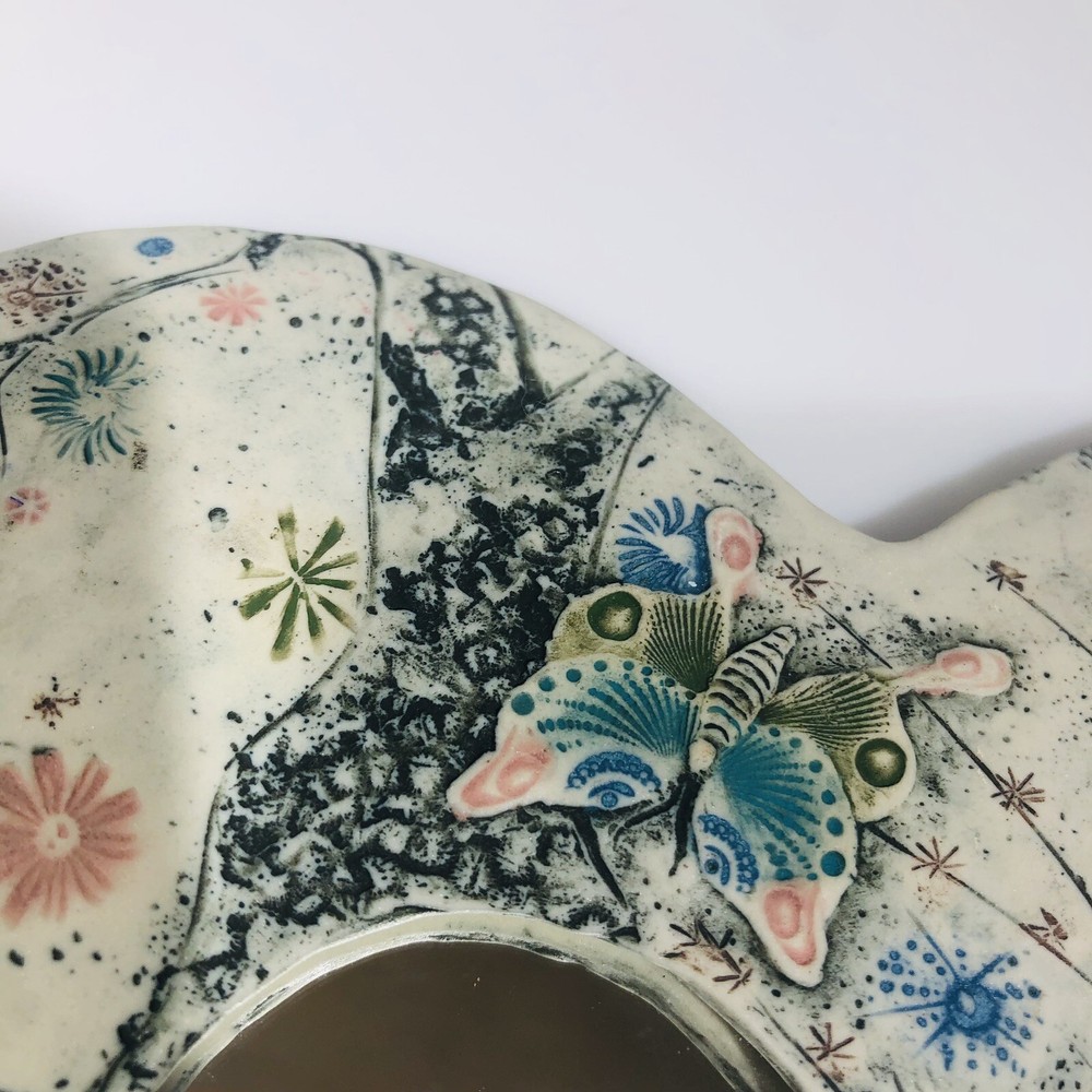 This beautiful wall mirror is a stunning piece of art pottery that will add a touch of elegance to any room. Crafted by EC Brinkman Studio, this porcelain mirror features a heart-shaped design with a butterfly theme in blues and pinks. It is signed by the artist and is a handmade piece from the Art Studio product line. The mirror is perfect for those who appreciate arts & crafts/mission style decor and features a mirrored design. It is ideal for use as a wall mirror and will add a unique touch to any space. Whether you are looking for a decorative item for your home or a gift for a loved one, this EC Brinkman Studio pottery piece is sure to impress. Has a very tiny scratch on mirror, see pictures. Not very noticeable.