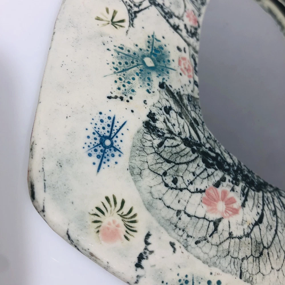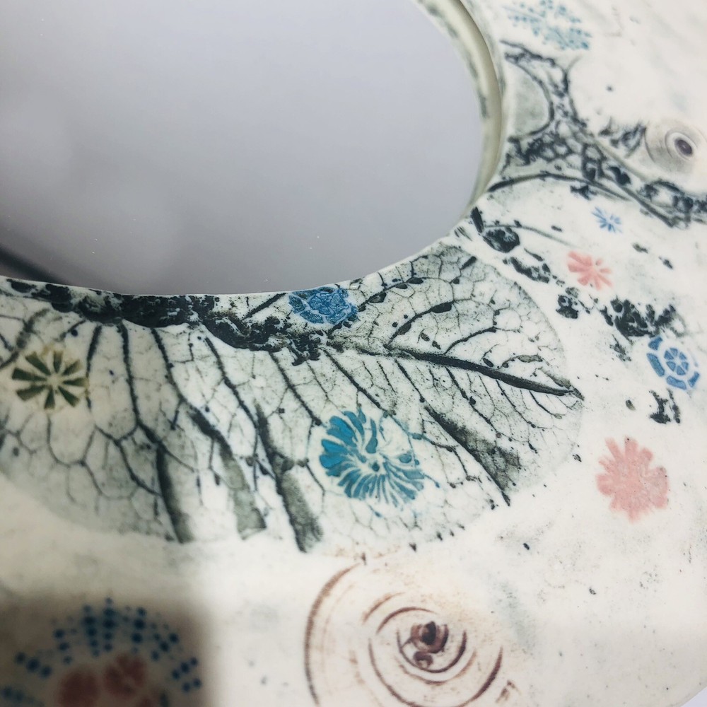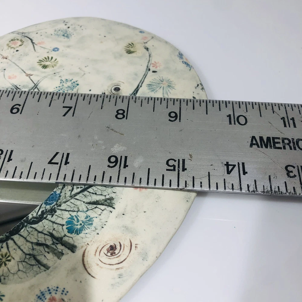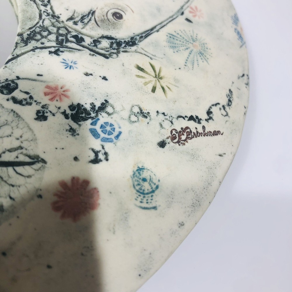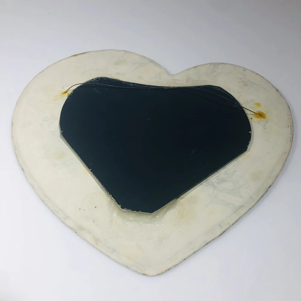 This beautiful wall mirror is a stunning piece of art pottery that will add a touch of elegance to any room. Crafted by EC Brinkman Studio, this porcelain mirror features a heart-shaped design with a butterfly theme in blues and pinks. It is signed by the artist and is a handmade piece from the Art Studio product line. The mirror is perfect for those who appreciate arts & crafts/mission style decor and features a mirrored design. It is ideal for use as a wall mirror and will add a unique touch to any space. Whether you are looking for a decorative item for your home or a gift for a loved one, this EC Brinkman Studio pottery piece is sure to impress. Has a very tiny scratch on mirror, see pictures. Not very noticeable.
