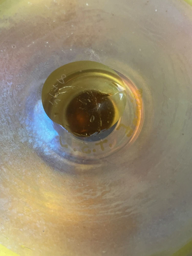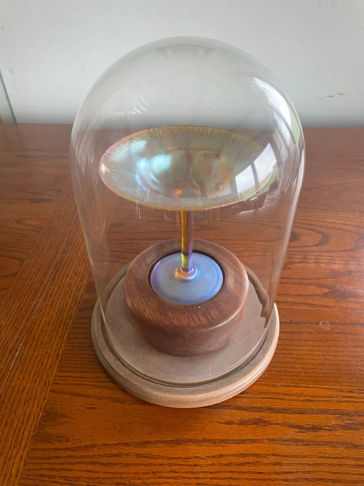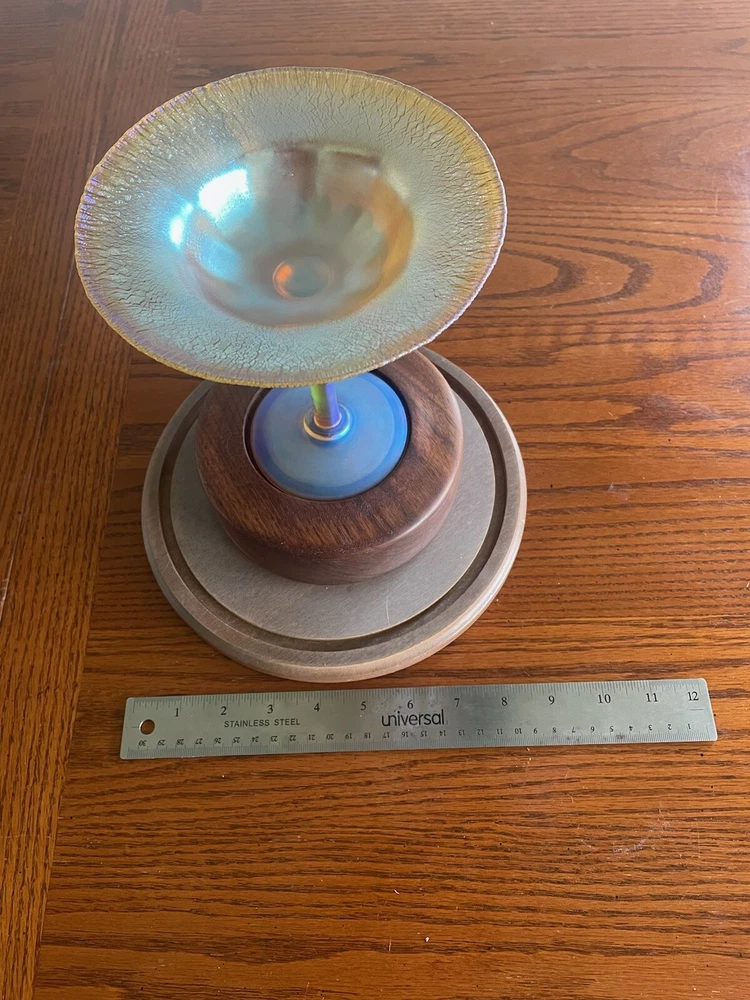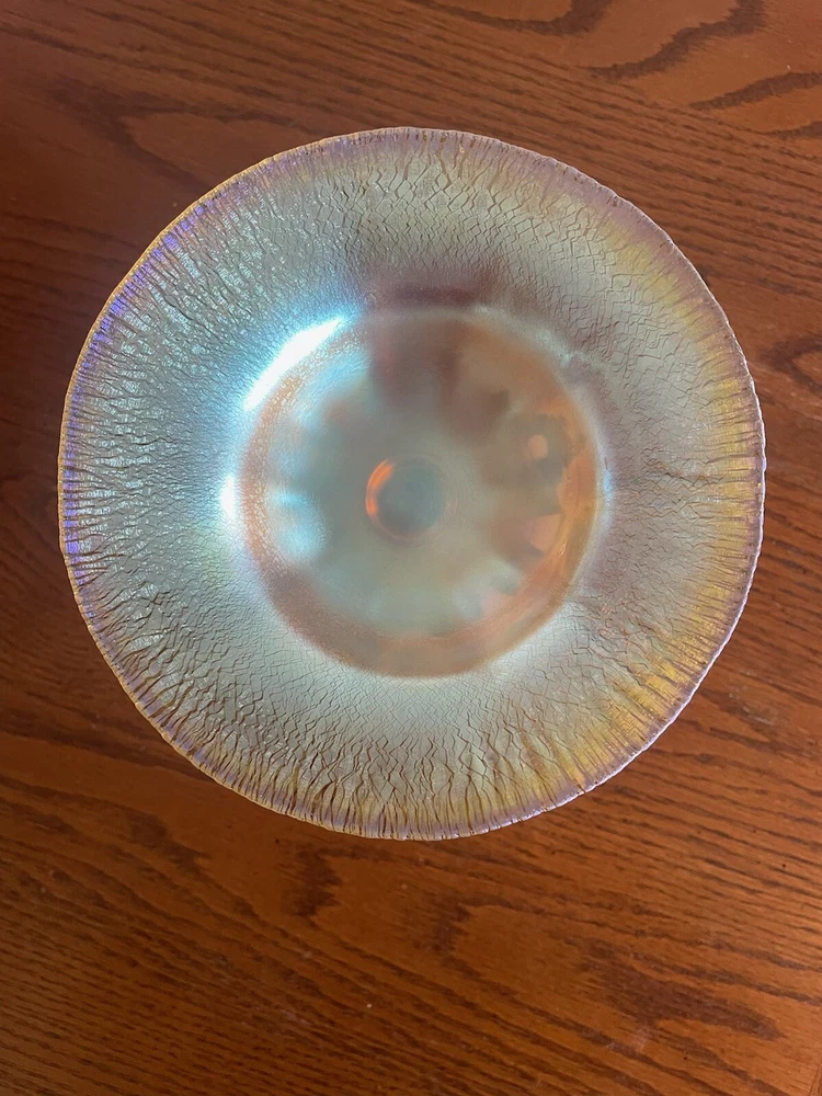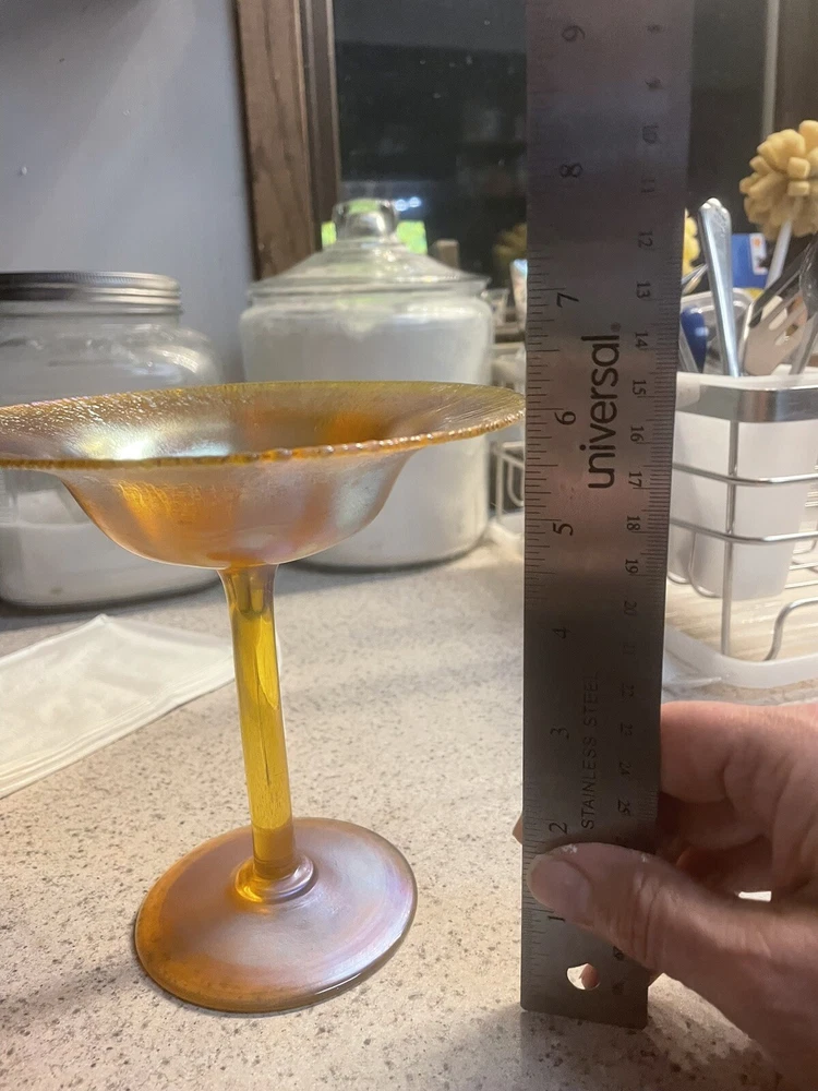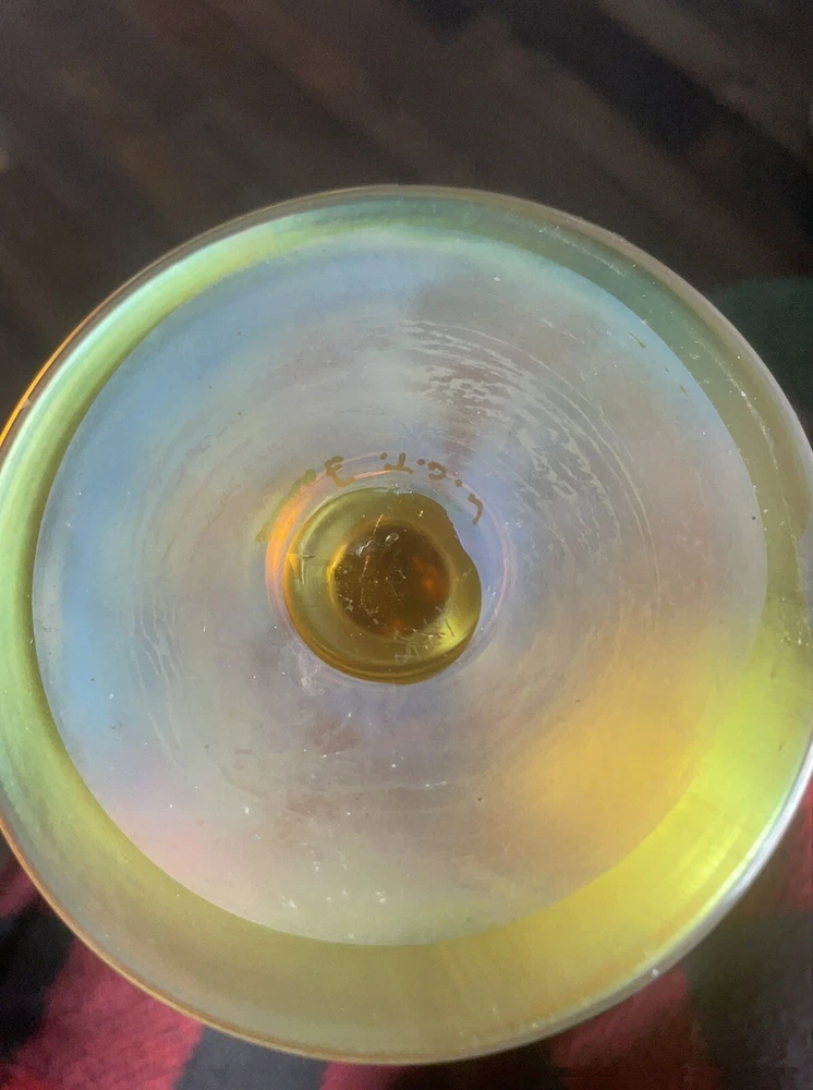 This exquisite Tiffany & Co. Favrile trumpet vase compote from 1916 is a rare find for any collector. The handmade art glass piece features a stunning finish that is characteristic of the Favrile pattern. It is signed by Tiffany and is in excellent condition, with no chips or cracks. The vase is a vintage piece and has a unique theme that is perfect for any studio or decorative setting. Don't miss out on the chance to add this beautiful and highly sought-after item to your collection. 6 inches tall. Signed and numbered.