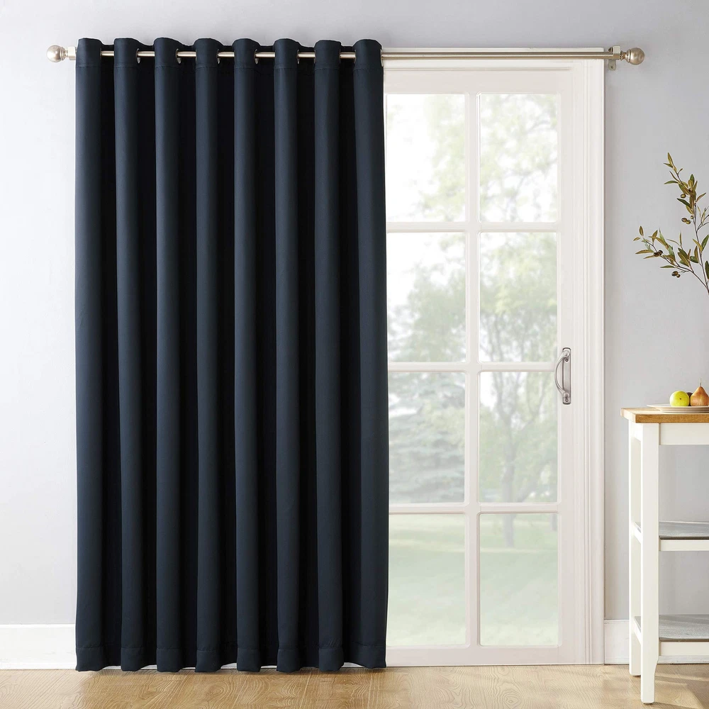 Sun Zero Easton Extra Wide Blackout Sliding Patio Door Grommet Curtain Panel is perfect for large windows and patio doors. The woven solid design with an easy to hang grommet-top offers a classic style that fits in with any room decor while blocking light and noise for better sleep; help keep your home cooler in the summer and warmer in the winter. This panel gives complete privacy. Easily open and close with the attached wand. Sold individually. Hang on a rod up to 1.5" in diameter. Machine wash cold on gentle cycle. Use non-chlorine bleach when needed. Tumble dry on low heat, using a cool iron as needed. These are not 100% blackout curtains. They block out most light but light blocked varies by base color. Detachable pull wand ideal for sliding glass doors and large windows Blackout technology blocks out most unwanted light while enhancing privacy Energy efficient design reduces energy lost through your windows by up to 40% Thermal properties help keep summer heat and winter chill out of your home Noise Reduces outside noise by up to 30%. They will help you get a sounder, better, more uninterrupted sleep. Built-in metal grommets fit curtain rods up to 1.5" in diameter Panels sold individually. Measure carefully prior to purchase. Performance varies by product color; darker the base color the more light blocked