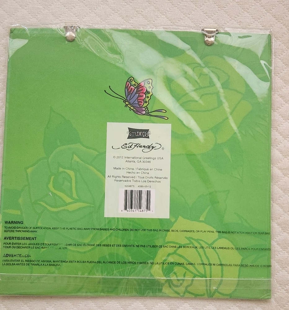 New, sealed 2012 Studio 18 Ed Hardy Magnetic board with 6 magnets. Bright green with butterflies. Great for kitchens, dorms, anywhere!! 10"x10"