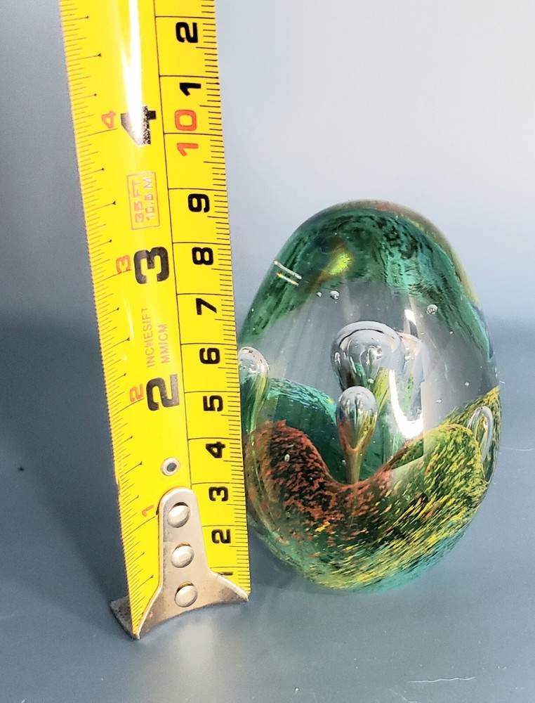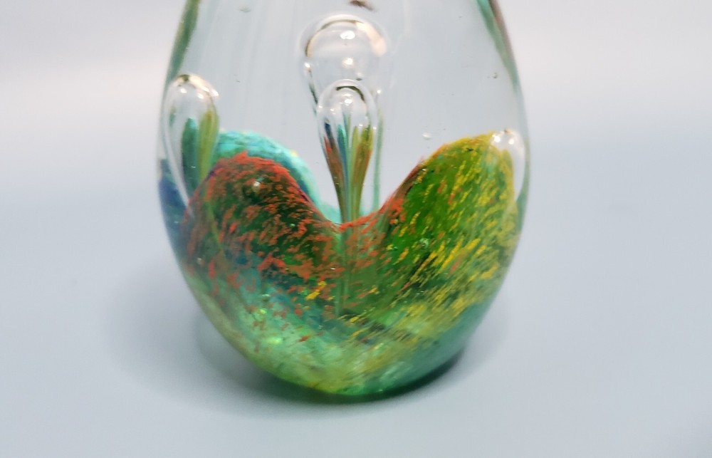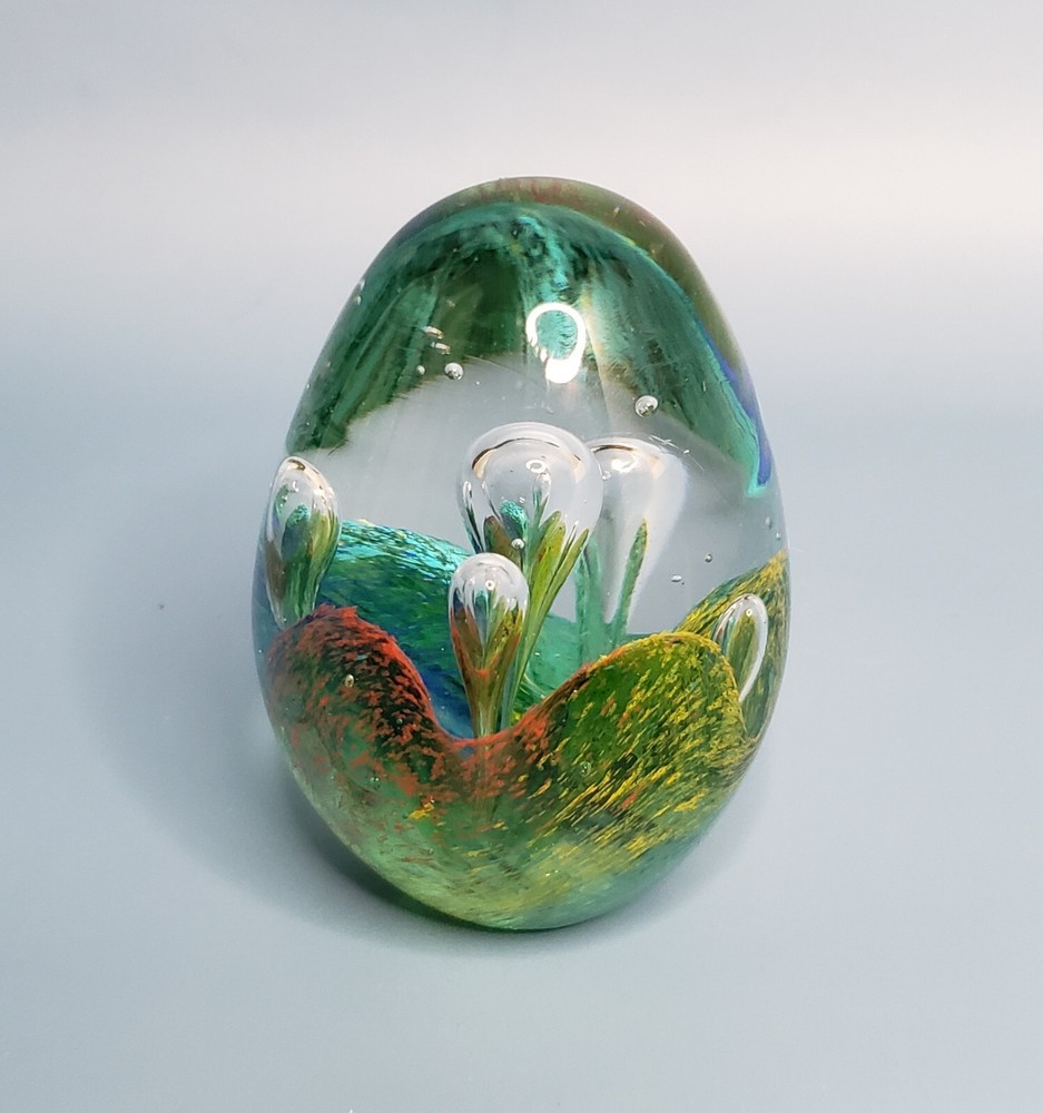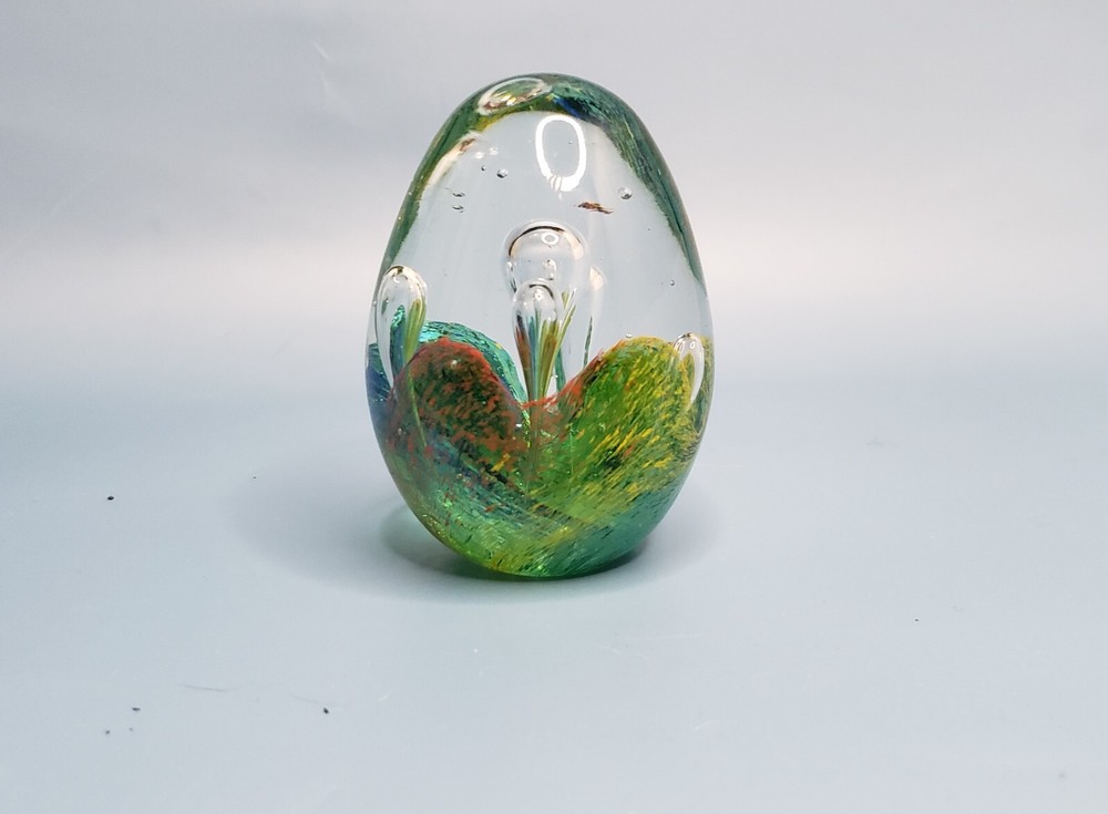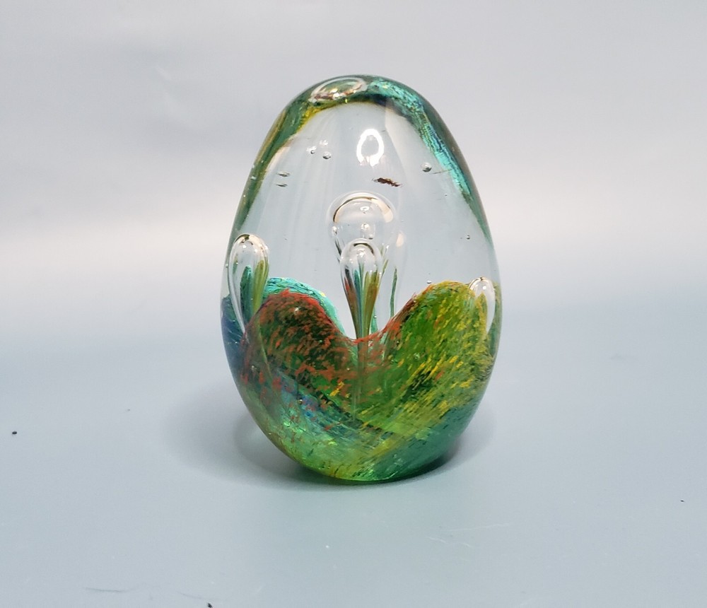This unique studio art glass paperweight is a beautiful addition to any collection. The egg shape and hand blown glass production technique make it a one-of-a-kind piece. The clear glass and multicolored design add a touch of elegance to any room. Measuring 3.5" x 2.5", this original paperweight is perfect for display or as a thoughtful gift. L2