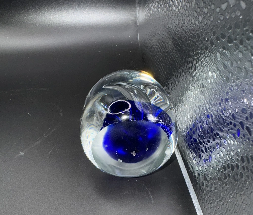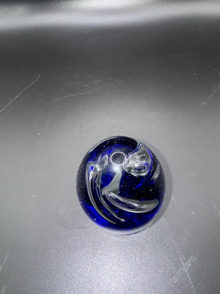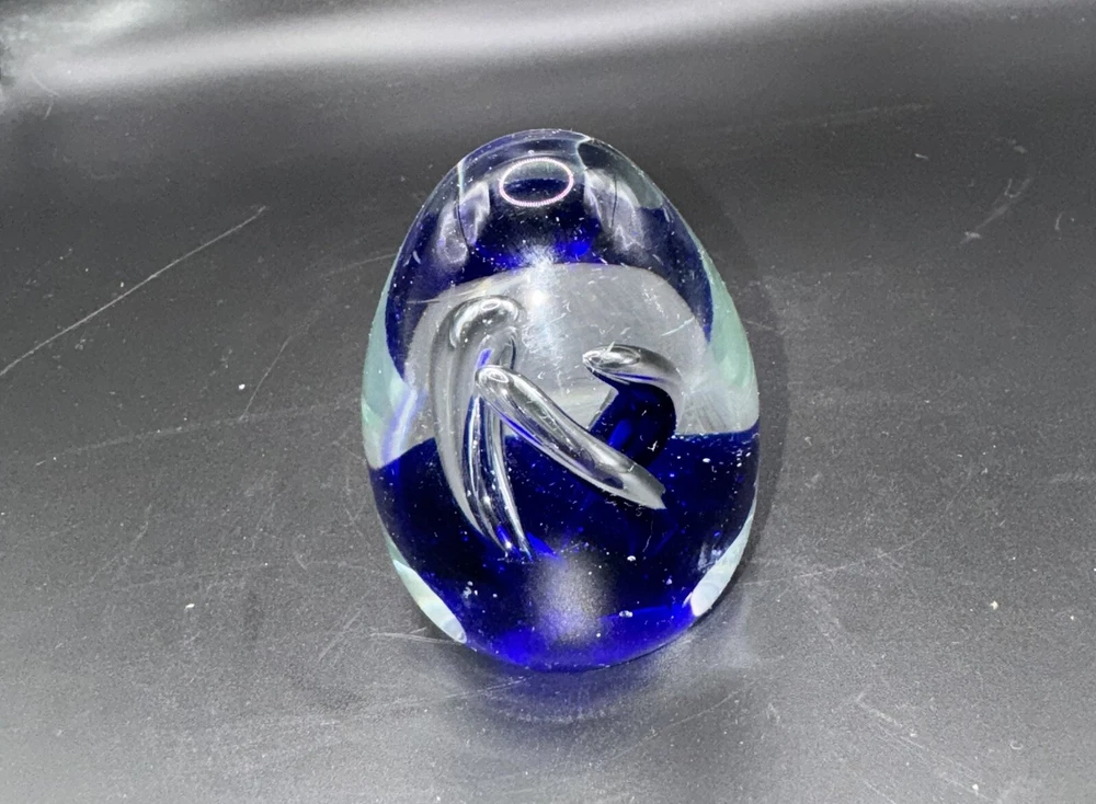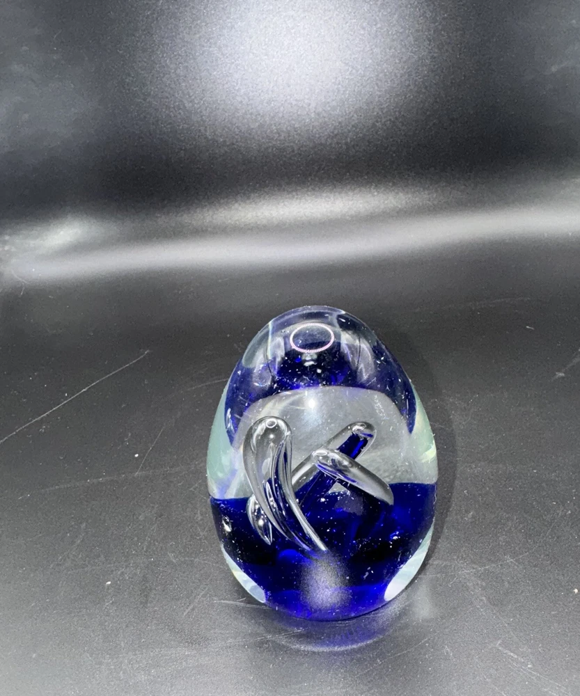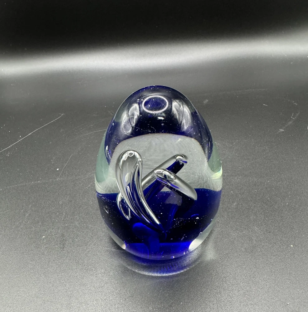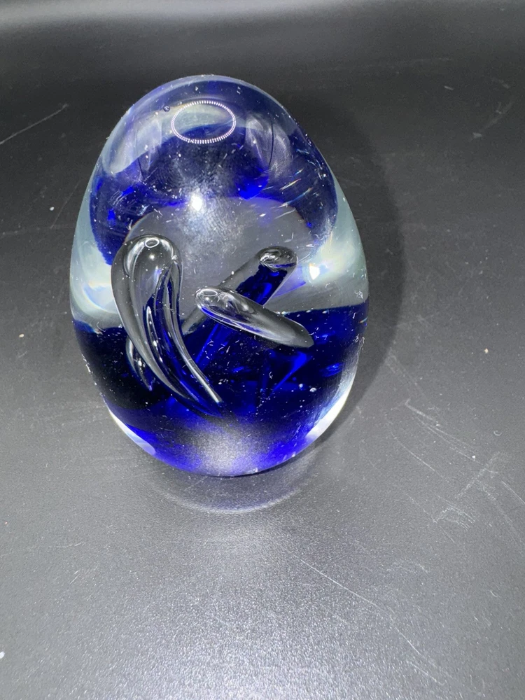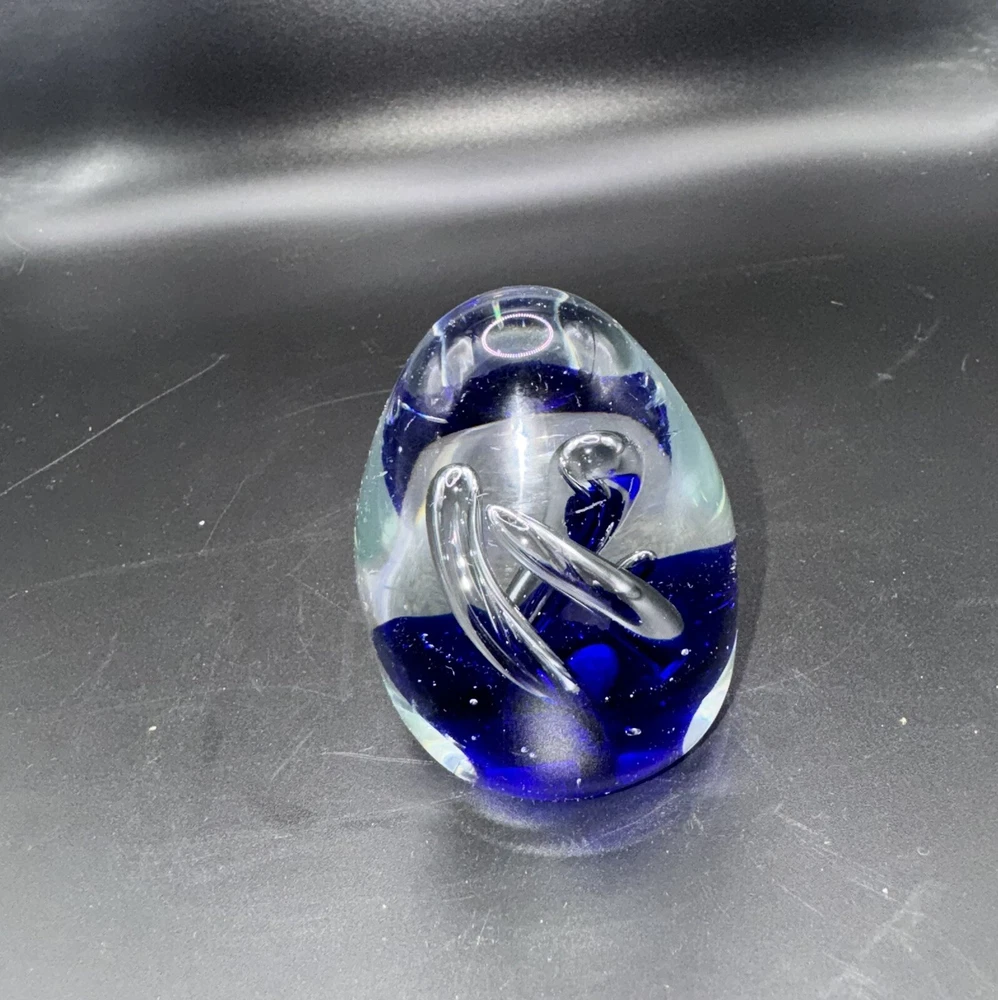 This stunning studio art glass paperweight is a must-have for any collector. Its egg shape and glossy finish make it a unique and eye-catching decorative piece. The clear glass and cobalt blue color combination adds a touch of elegance to any room. Crafted in the late 20th century, this original piece is handmade and features a beautiful egg pattern. The paperweight measures 3.5" x 2.5" and is made of high-quality glass. Its production style is art glass and it is a licensed reproduction. This paperweight is perfect for anyone who loves unique, vintage, and handmade decorative items. “Used” **Please see photos for condition** Let us know if you need any more photos or have any questions. If you are not satisfied for any reason, please contact us so we can work it out. We follow all of eBay's policies and procedures. We want your positive feedback on all transactions.