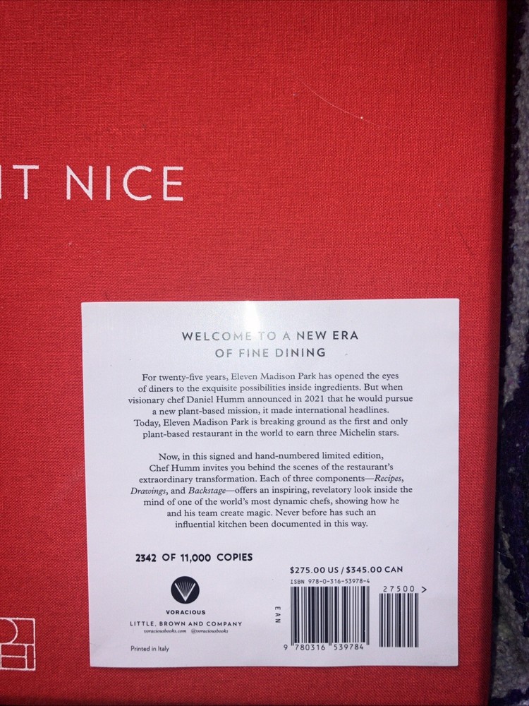 "Eleven Madison Park: The Plant-Based Chapter: A Cookbook" by Daniel Humm is a signed hardcover book published by Little Brown & Company. It features 400 pages with illustrations and is written in English. The cookbook, focusing on vegan recipes, has a publication date of November 19, 2024, and measures 12.5 inches in length, 2.9 inches in height, and 11.2 inches in width.