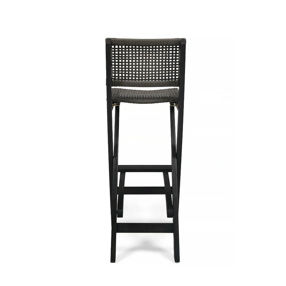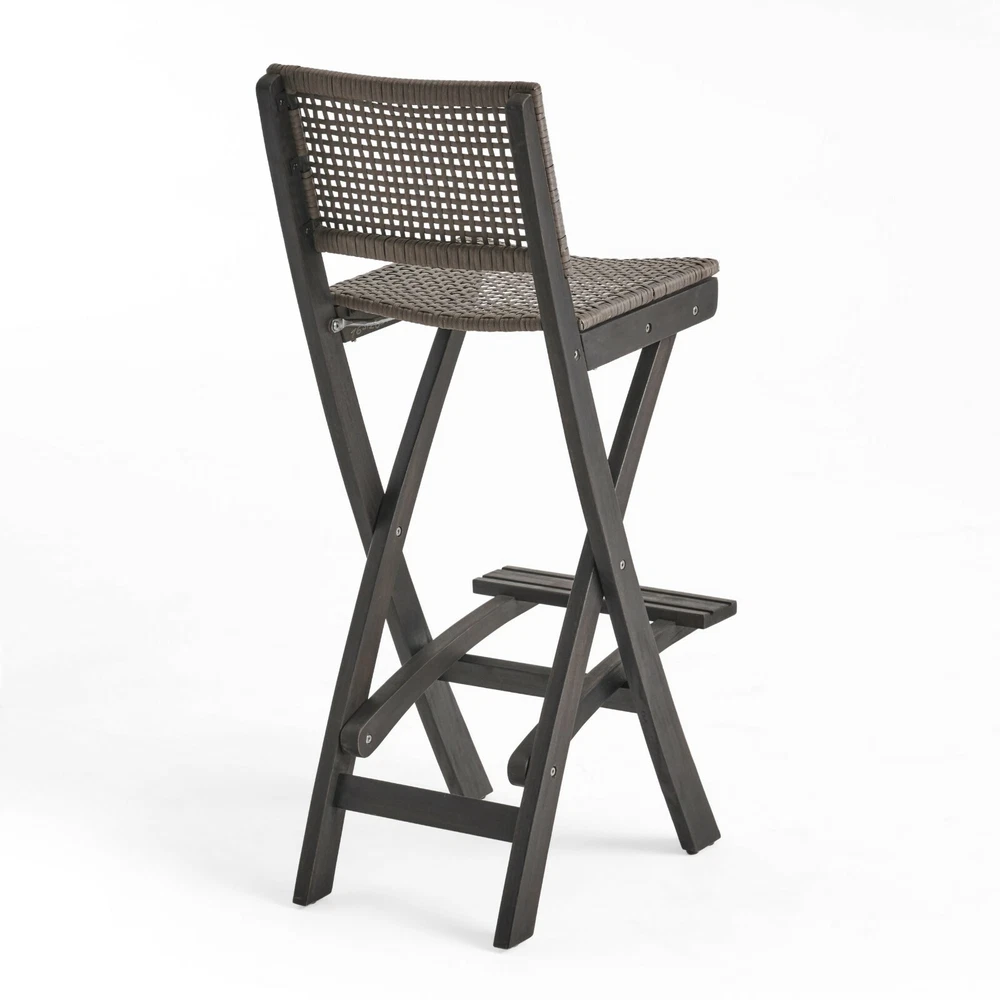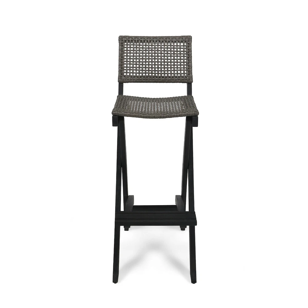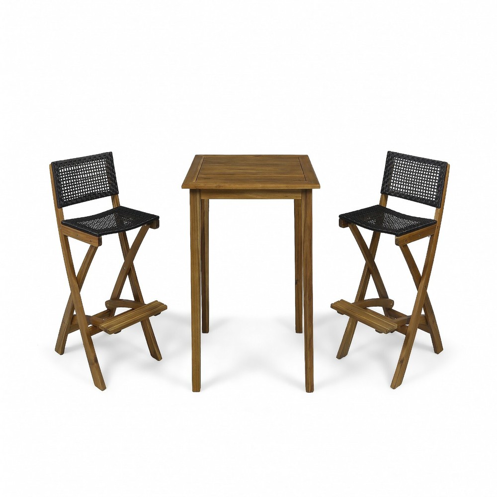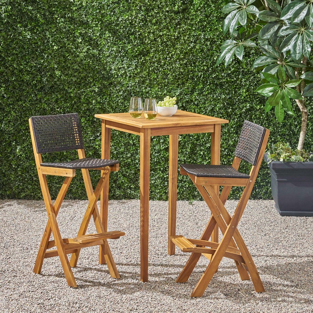 Enjoy a summer brunch or intimate conversation over a bar set that gives your outdoor space a natural touch. This set provides compact convenience with its foldable barstools and also features a stunning woven look that instantly upgrades any existing decor. Constructed with acacia wood and featuring a slatted tabletop, this set offers reliable durability that naturally withstands most weather conditions. Its seating is finished with traditional hole-to-hole wicker caning that provides our set with impeccable comfort and style that will last you for many years to come. ACACIA WOOD WITH FINISH: Made with acacia wood that brings a sleek and exotic look to your space, this durable hardwood naturally withstands outdoor elements and will not darken over time. Acacia wood is perfect as a solid, heavy frame that resists wear and tear. This is finished with a complementing wash for a refined look. WICKER SEATING: Featuring a long-lasting woven finish, this versatile style is perfect for a natural outdoor look with its hole-to-hole strand caning. The intricate details of the wicker bring a homemade, classic feel to your patio or backyard. FOLDABLE BARSTOOLS: Designed to be compact, the barstools of this set can fold for easy storage or transport. Simply pull the chair seat up and fold the leg frame flush against the backrest. BARSTOOL HEIGHT: The table of this set has a height of 40.00” and the stools have a seat height of 31.50 inches and overall height of 41.75”. ASSEMBLY REQUIRED: Some assembly is required for this barstool set. All of the instructions and tools needed for assembly are included. The barstools are foldable and come ready to use. This set includes two barstools and one table. Includes: One (1) Table, Two (2) Barstools Material: Acacia Wood Barstool Material: Faux Rattan Multiple Color Options Assembly Required Table Dimensions: 26.00 inches deep x 26.00 inches wide x 40.00 inches high Table Weight Capacity: 187.75 lbs Barstool Dimensions: 22.00 inches deep x 15.00 inches wide x 41.75 inches high Barstool Seat Dimensions: 13.00 inches deep x 15.00 inches wide x 31.50 inches high Footrail Height: 12.50 inches Barstool Weight Capacity: 400 lbs