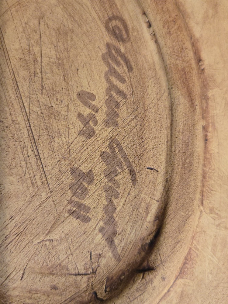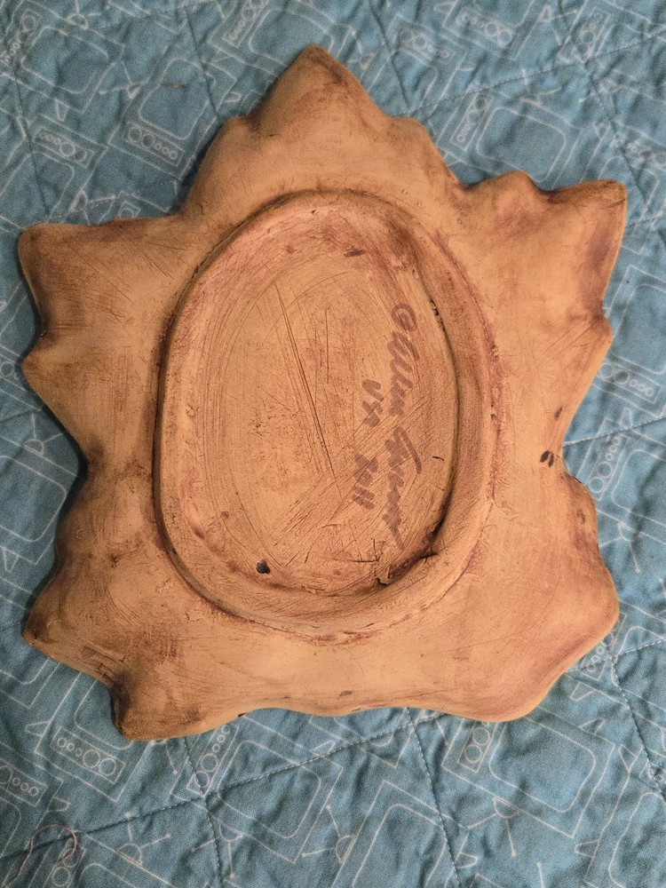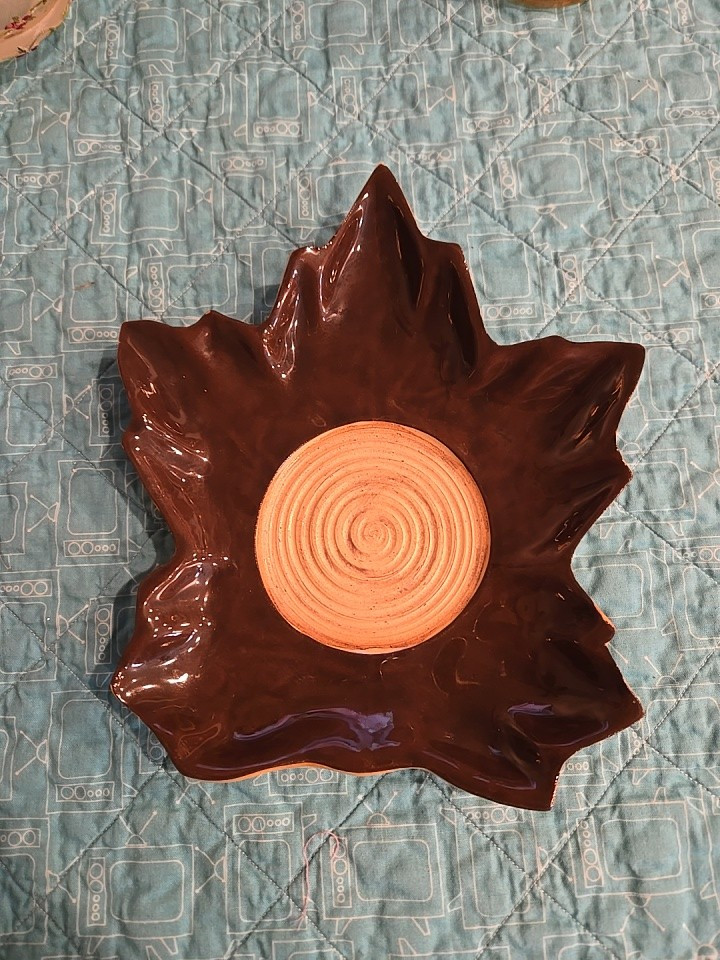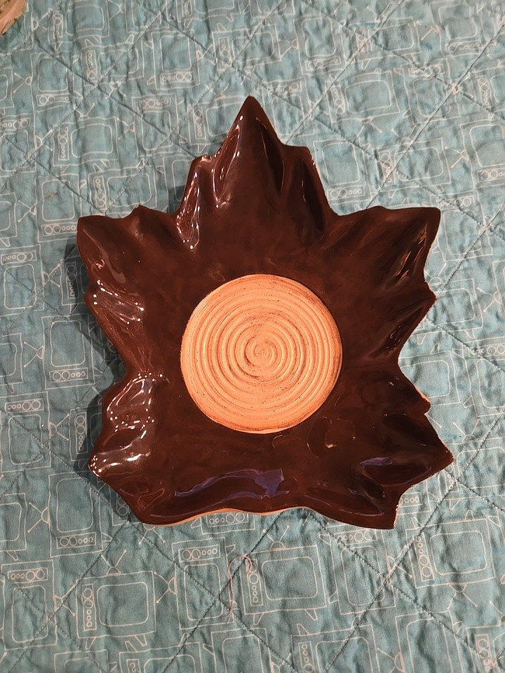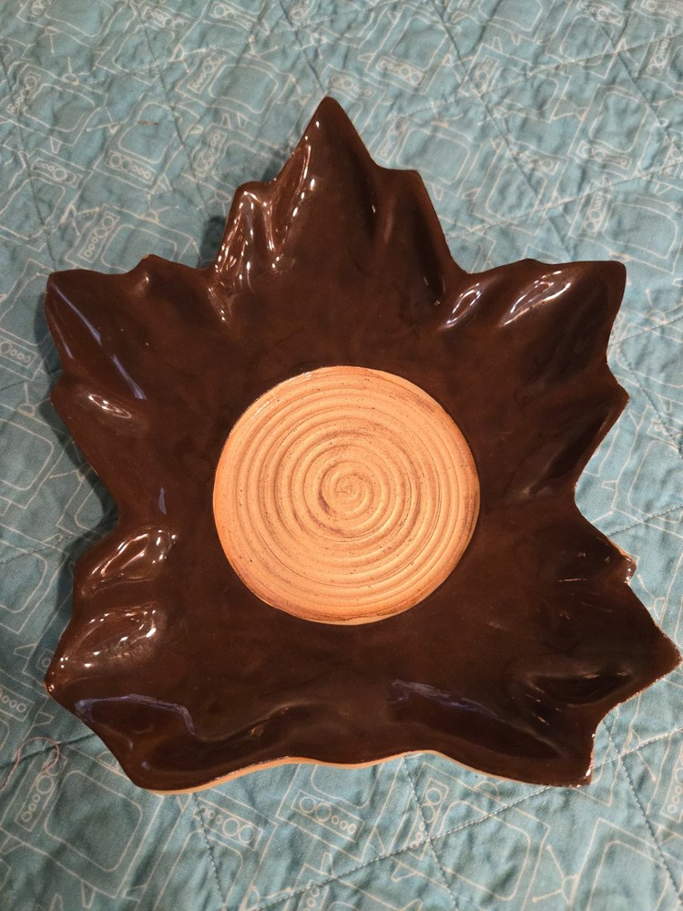 Shiny maple leaf glazed studio pottery circa 2011. Unglazed circle in the center will hold a glass candle jar. The piece is signed on the back by Ellen Evans....