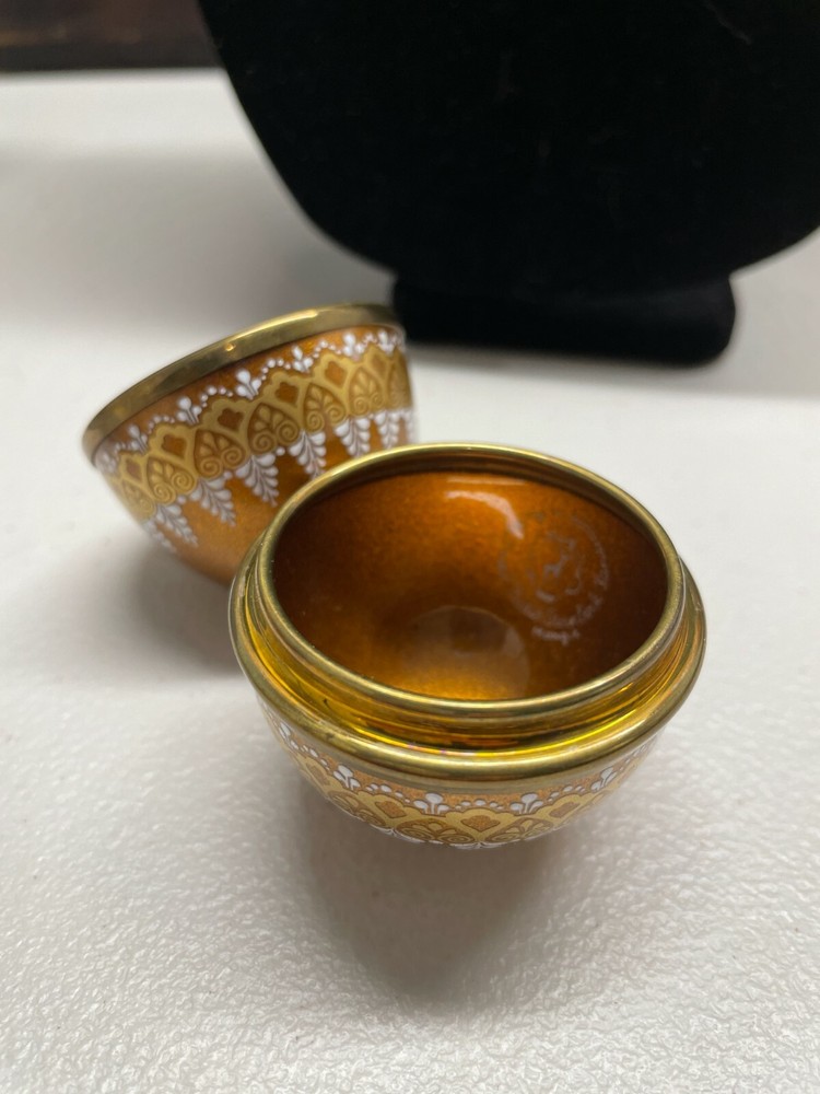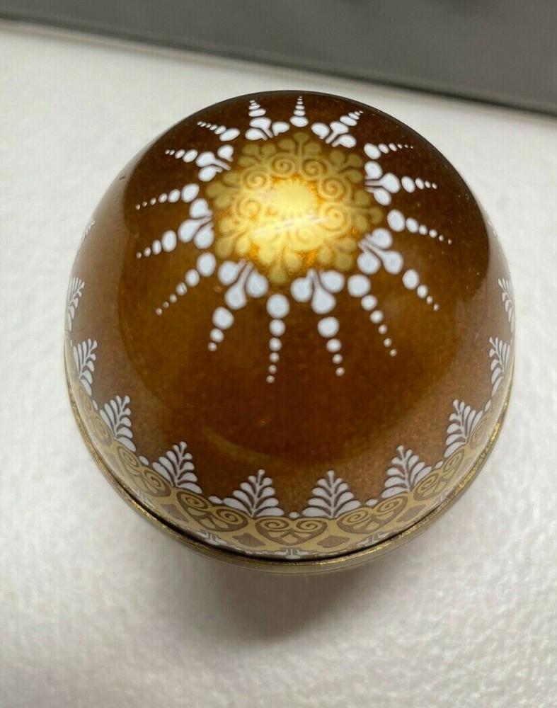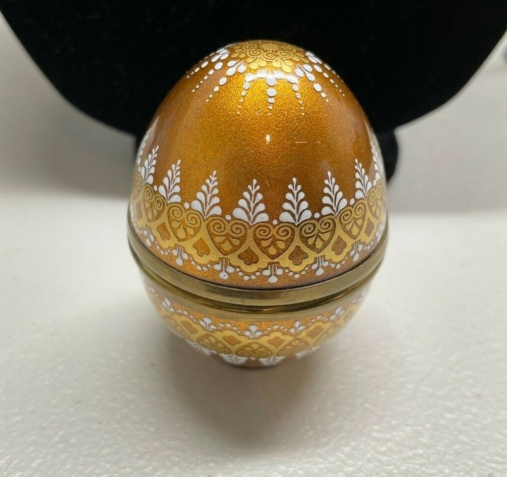 Gold and white-colored enamel decorative egg box from the Email Studio Steinbock, Handmade in Austria by Margit. The egg has intricate white and gold patterns and stands about 2.5" tall. A really nice...