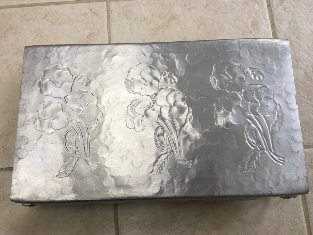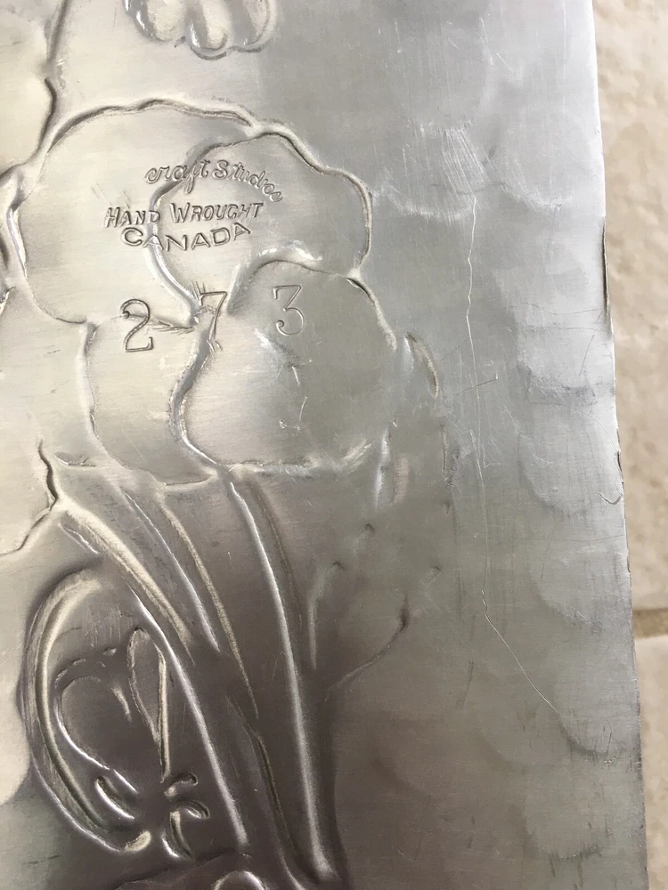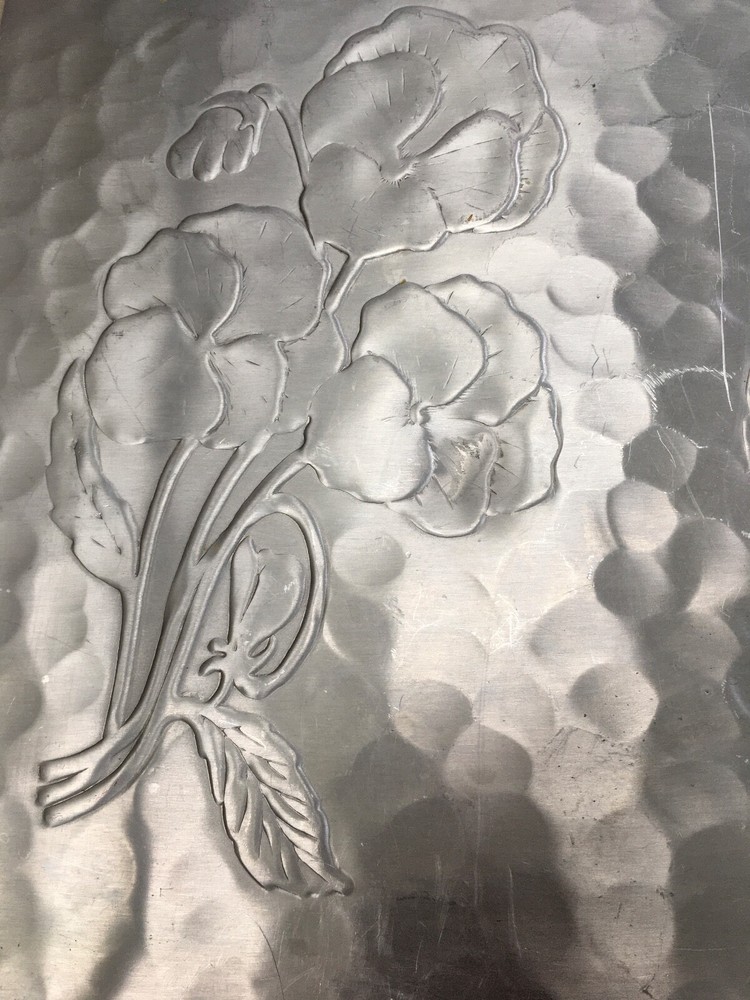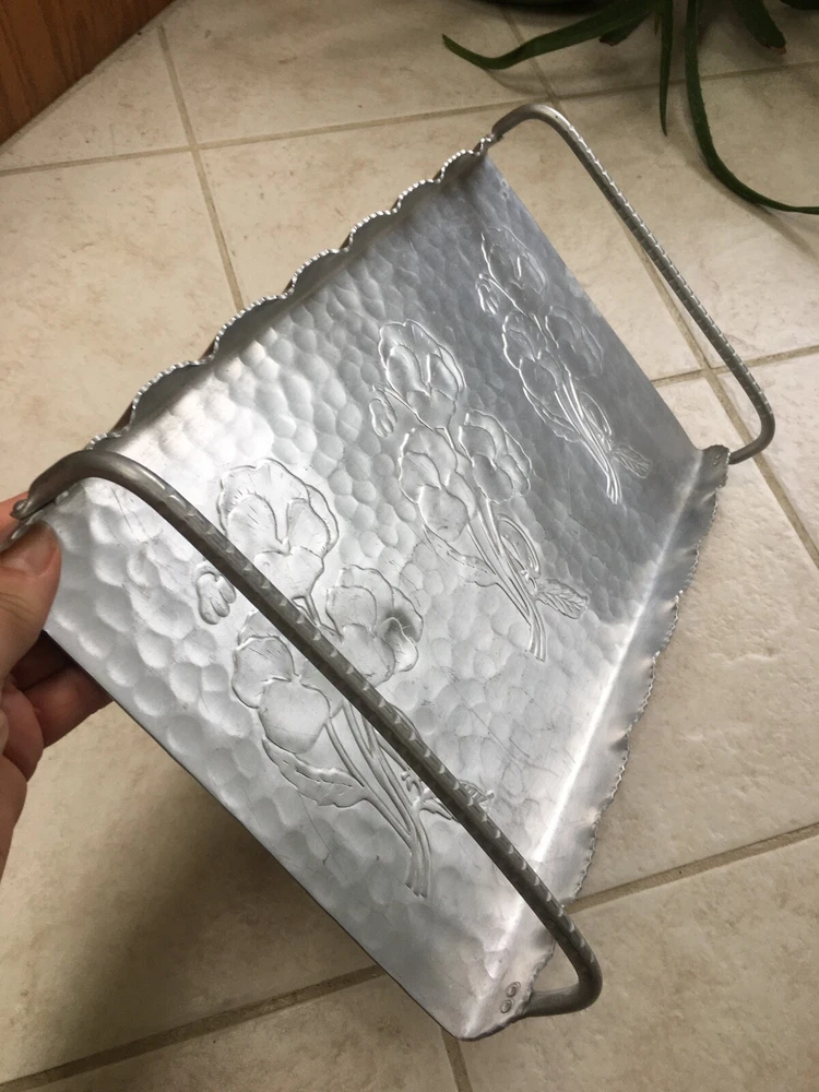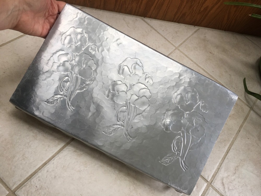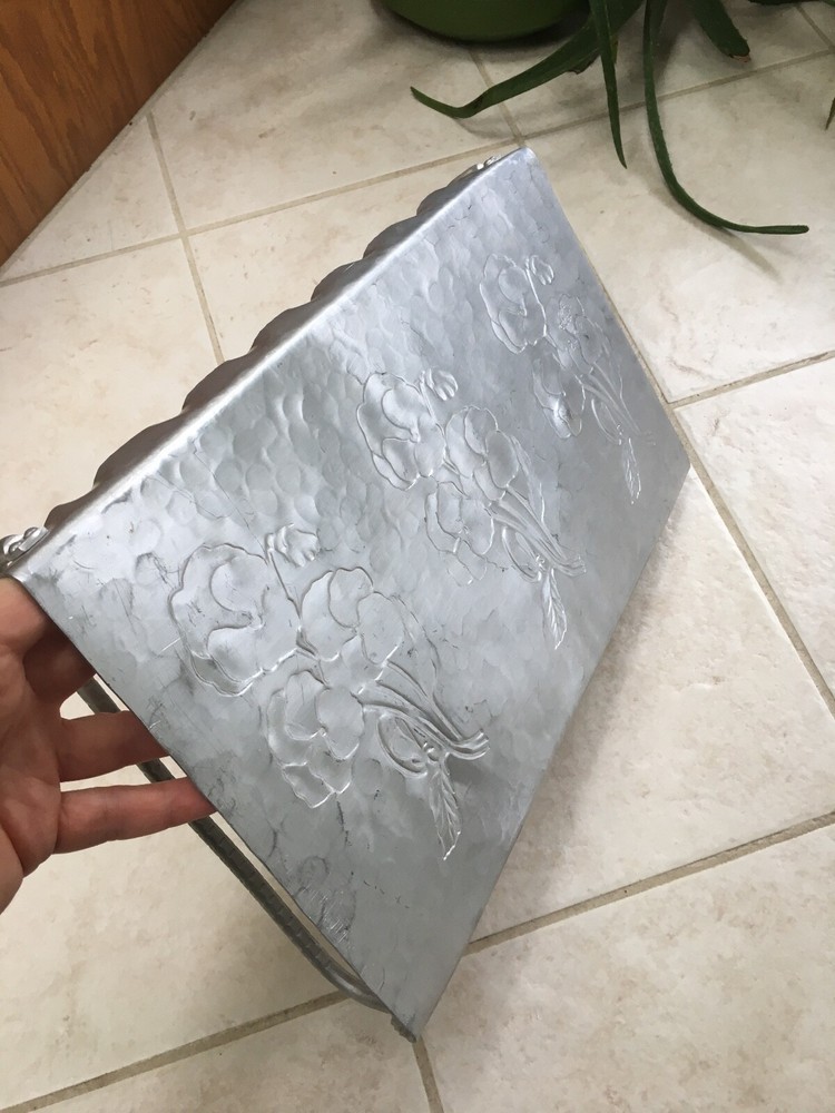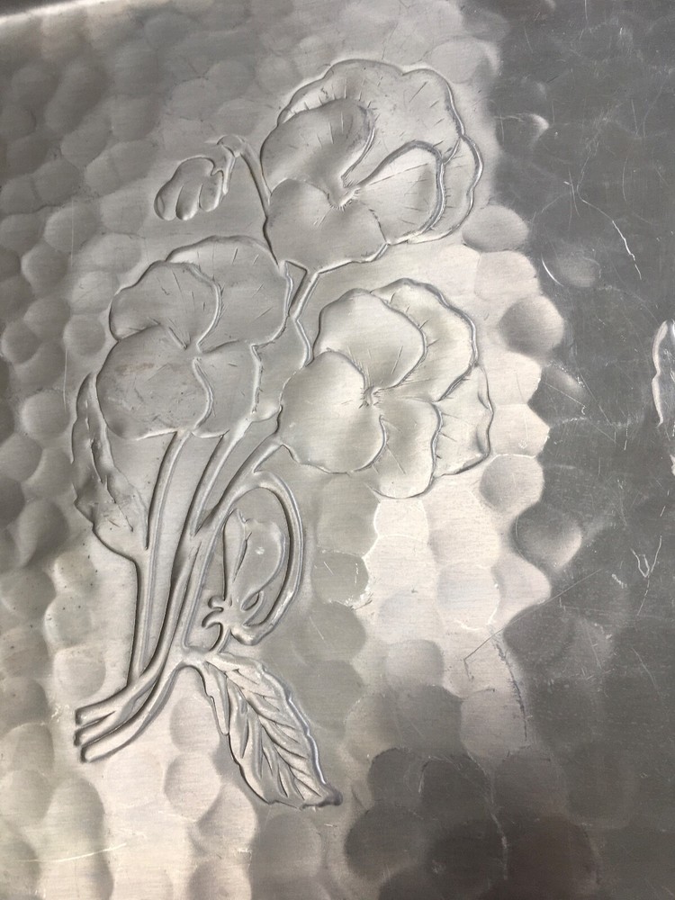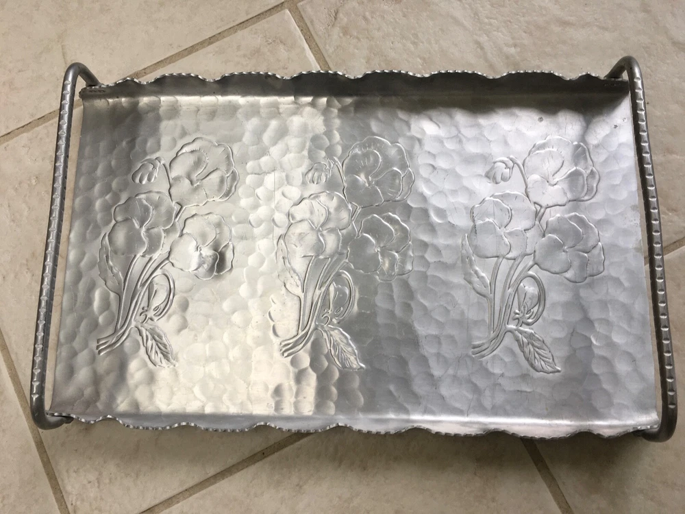 Embossed Pansies Craft Studios Vintage Hand Wrought Aluminum Tray with Handles, Made in Canada Rare find Vintage from the 1950s 1950's Aluminum Hand Wrought Sandwich Serving Tray. Stamped "Craft Studios Hand Wrough Canada". It is embossed with pansies and has handles. Light surface wear. 16.25 inch x 9.5 inch x 3" carry bar handles See photos for actual product. Thanks for looking!