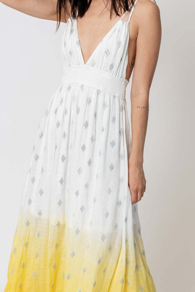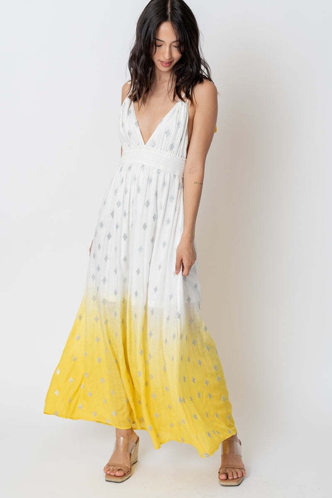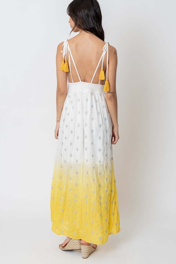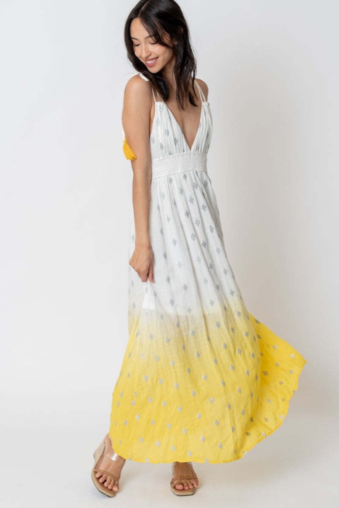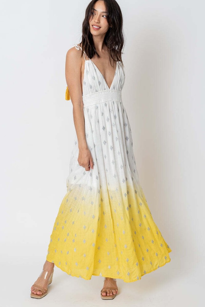 This gorgeous deep v-neck maxi dress has a dip dye effect, embroidered diamond shapes throughout, smocked waist, tassel ties at shoulders, fully lined, and pull on style. Woven 100% Viscose | Lining: Woven 100% Polyester Model's Height is 5'8" and is wearing a Small. Note: This guide provides general sizing information only, and fit can vary depending on style and brand. For more specific sizing information on the product, please feel free to contact us with any questions. Measurements: Bust - Fullest part of bust with arms at sides. Waist - Circumference of natural waist: above belly button, below rib cage. Hips - Standing with feet together, fullest part of hips. DRESSES SIZE US/CAN BUST WAIST HIPS XS 0 31"-32" 24"-25" 34"-35" S 2-4 33"-34" 26"-27" 36"-37" M 6-8 35"-36" 28"-29" 38"-39" L 10-12 37"-39" 30"-32" 40"-42" XL 14 40"-42" 33"-35" 43"-45"