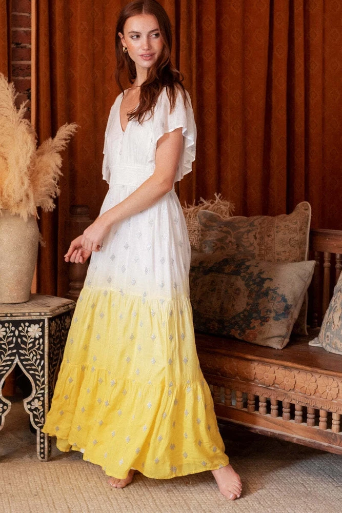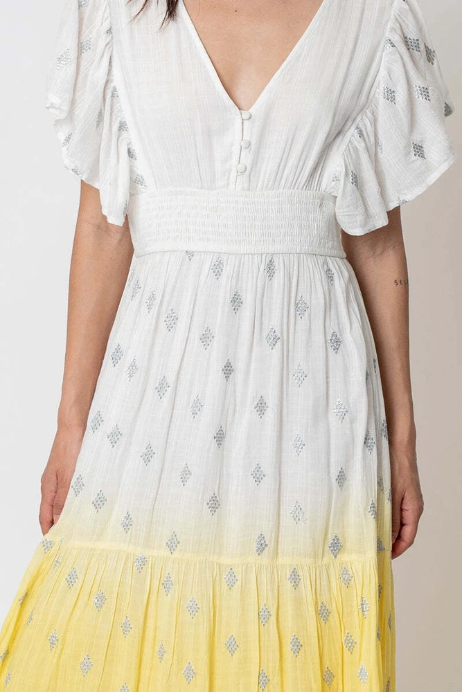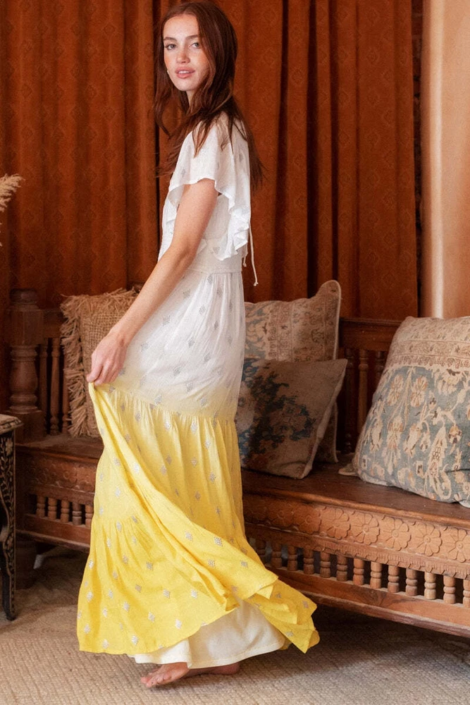 Boho dip dye maxi dress with ruffle sleeves, diamond embroidery throughout, smocked waist, button front closure, tiered skirt, and fully lined. Fabric Content: 100% Viscose | Lining: 100% Polyester Model's Height is 5'8" and is wearing a Small. Note: This guide provides general sizing information only, and fit can vary depending on style and brand. For more specific sizing information on the product, please feel free to contact us with any questions. Measurements: Bust - Fullest part of bust with arms at sides. Waist - Circumference of natural waist: above belly button, below rib cage. Hips - Standing with feet together, fullest part of hips. DRESSES SIZE US/CAN BUST WAIST HIPS XS 0 31"-32" 24"-25" 34"-35" S 2-4 33"-34" 26"-27" 36"-37" M 6-8 35"-36" 28"-29" 38"-39" L 10-12 37"-39" 30"-32" 40"-42" XL 14 40"-42" 33"-35" 43"-45"