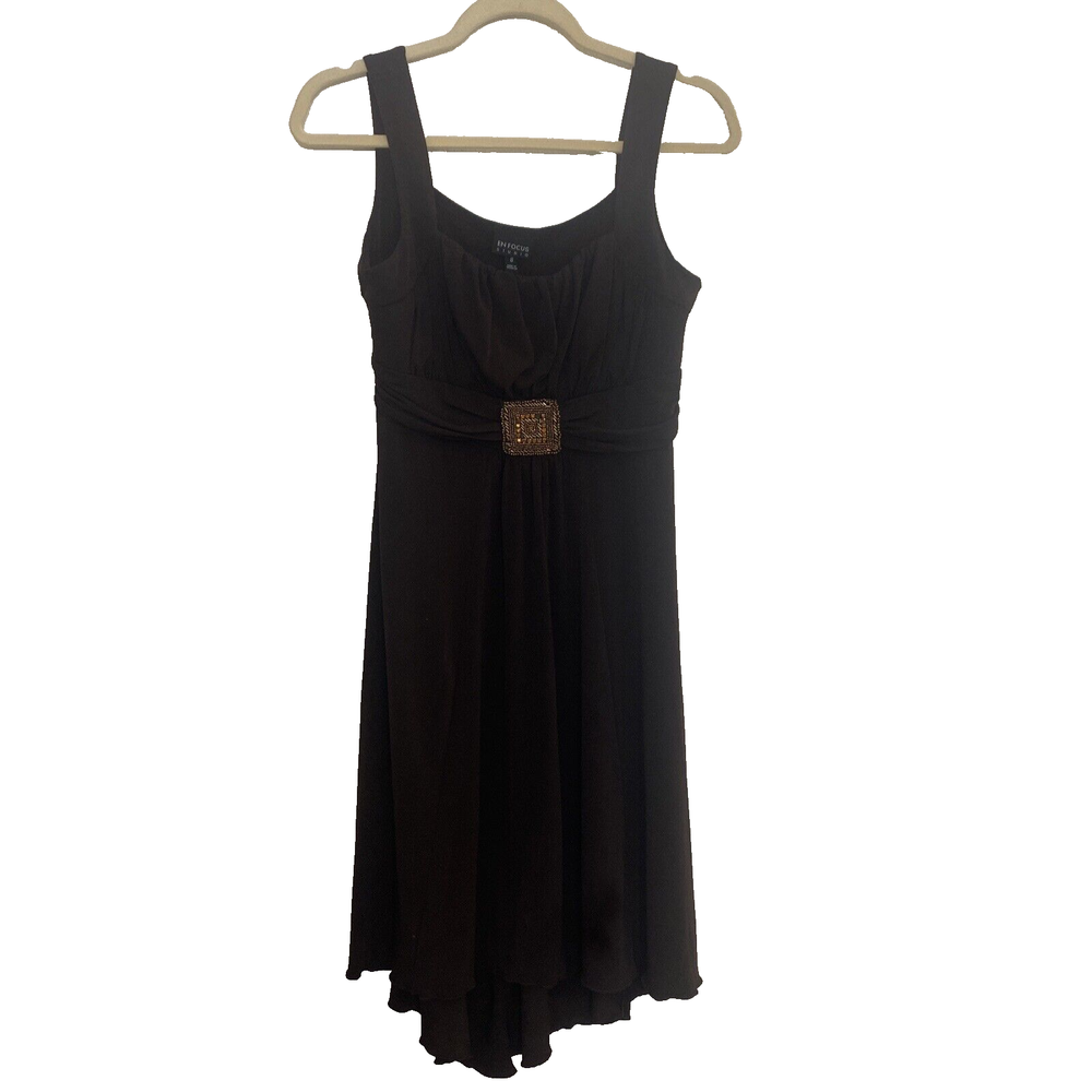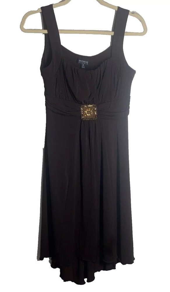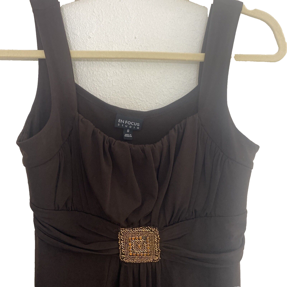***Price reflects missing stone, flaw. See photos with red arrow***** Elevate your formal attire with this En Focus Studio women's dress. The dress features a sweetheart neckline and 2" straps, with a sleeveless design that is perfect for any summer or spring occasion. The chocolate brown color and solid pattern give a classic and timeless look, while the fit and flare style creates a flattering silhouette. Made with a polyester material and rayon fabric type, this dress is machine washable for easy care. The dress length falls to a midi length with a belt detail that accentuates your waistline. Perfect for a party or cocktail event, this dress is a must-have for any fashion-forward woman's wardrobe.