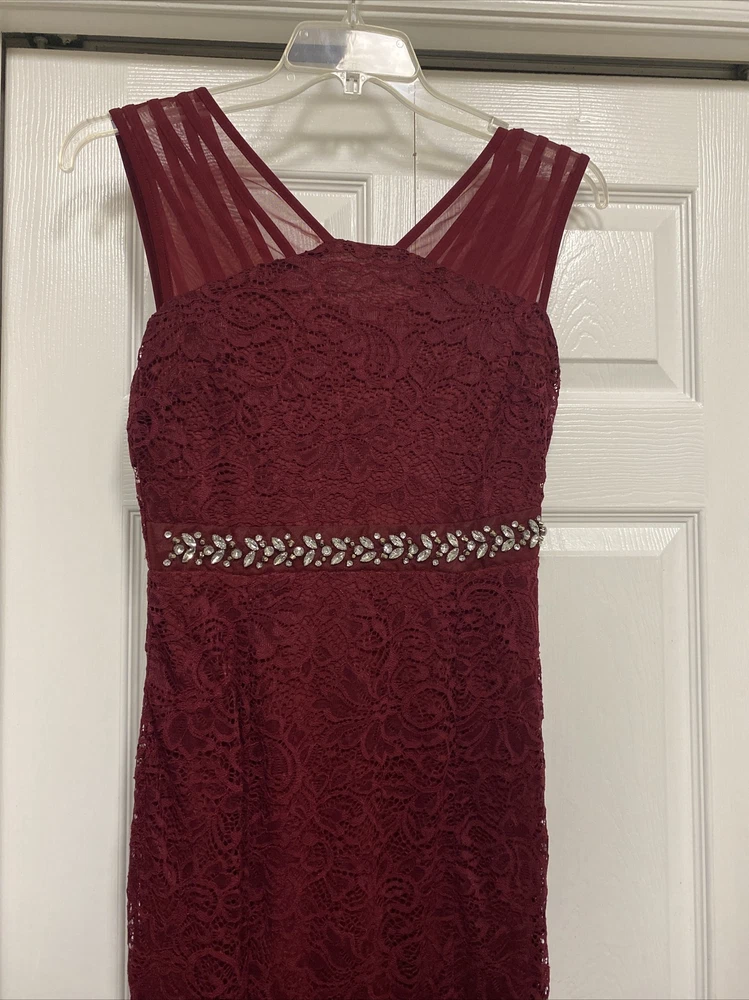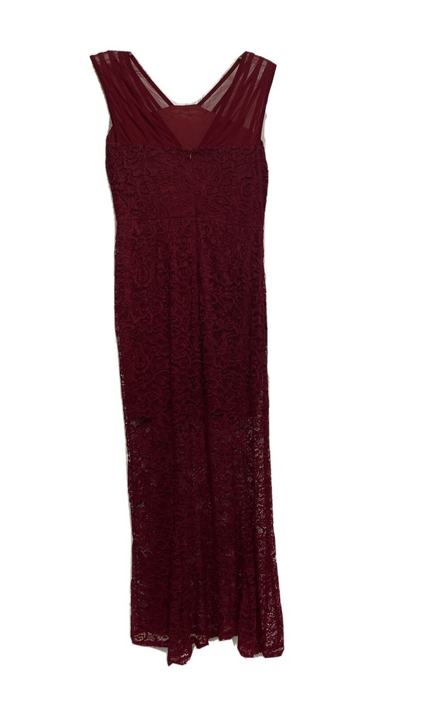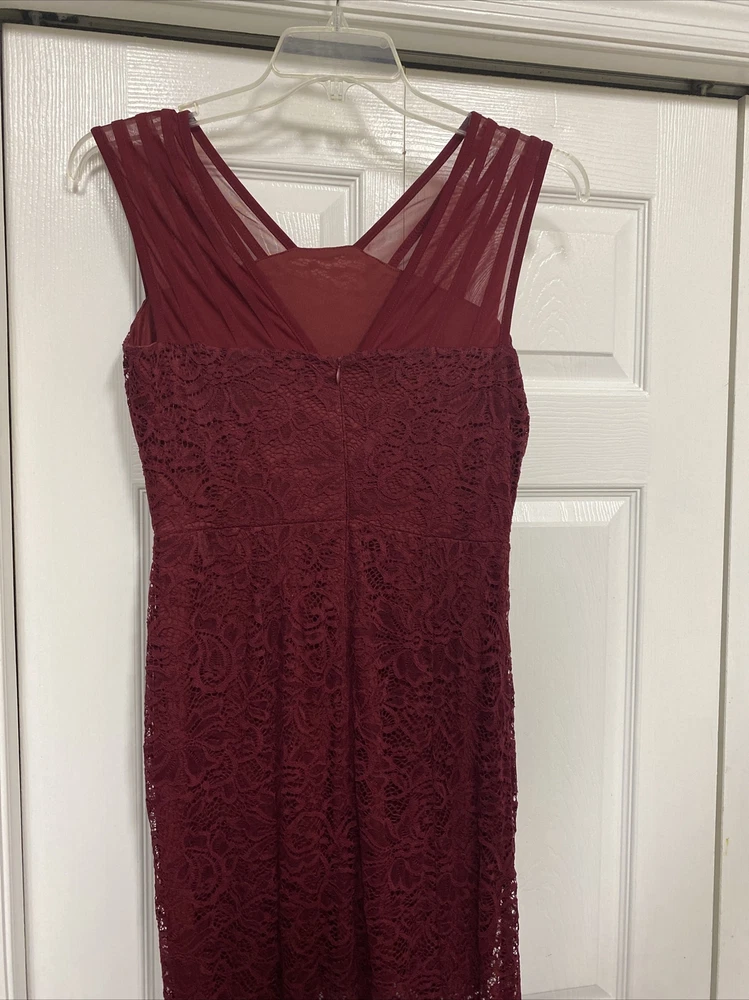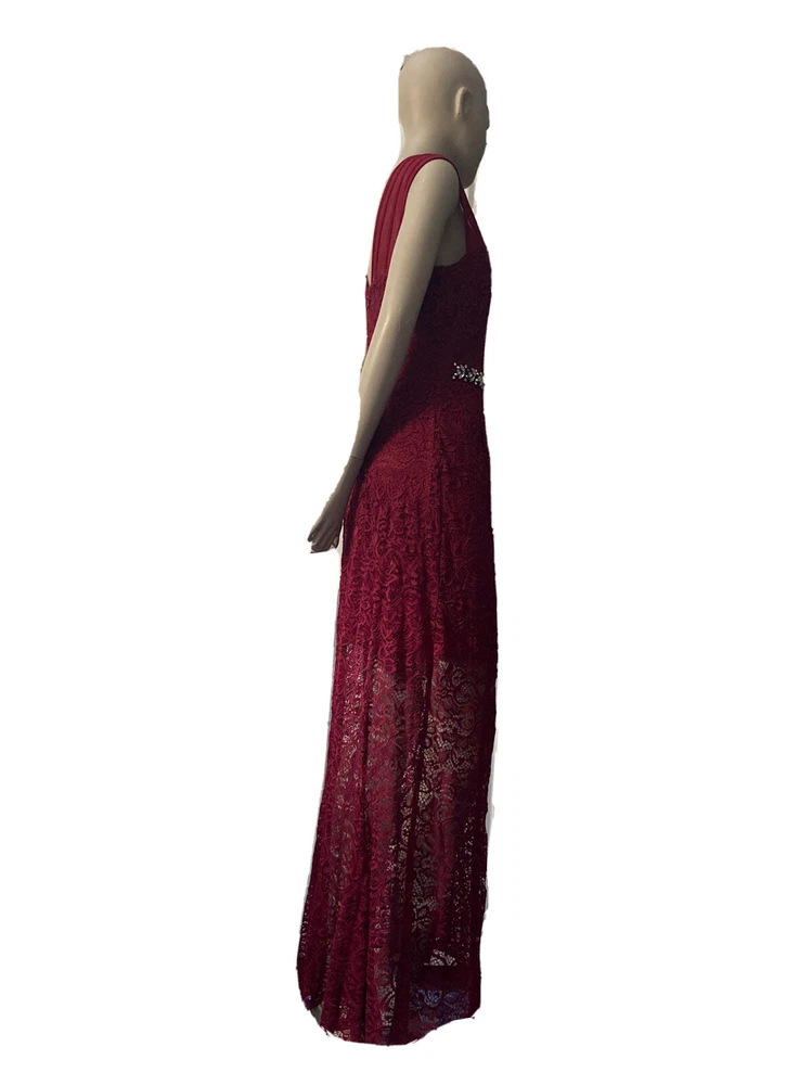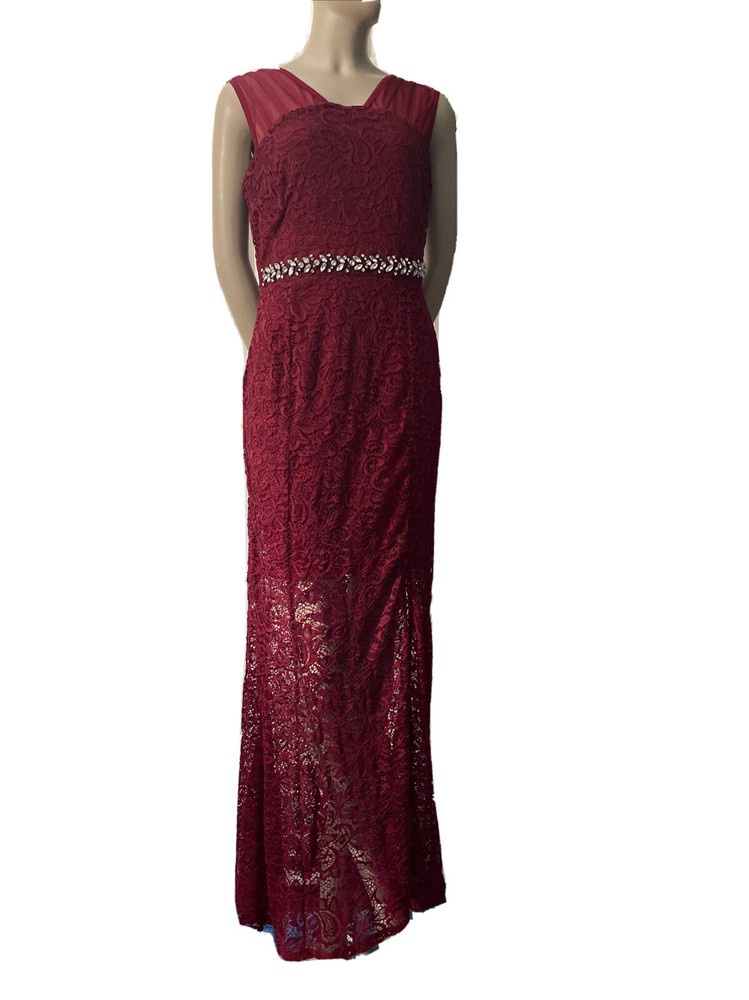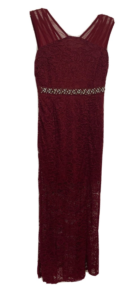 Enfocus Studio Burgundy Lace Underlay Empire Waist Embellished long Dress Size 8. Brand: Enfocus Studio Size: 8 Color: Burgundy(BRY) IDC175609RS style no. 60714 RN#74299 Lace Empire waist Rhinestone details at waist Slit Neckline: Scoop Sleeve: Cap lined Zip closure Made in: Indonesia Care: Hand wash Cold. Inside out. Hang to Dry Materials: Shell: 95% Nylon, 5% Spandex. contrast 1 and lining 100% Polyester. PLEASE REFER TO THE MEASUREMENTS PROVIDED BELOW FOR PROPER FIT. Approx. Measurements lay flat. Length: 53" Inches Bust: 17"inches Waist: 14"inches Hip:19.5" Inches Condition: Pre-owned in very good condition. part of the hem thread at the slit is missing it could be a easy fix. view pictures Please look at allthe Pictures carefully for more details. contact me with any questions about this listing or any of my other listings.