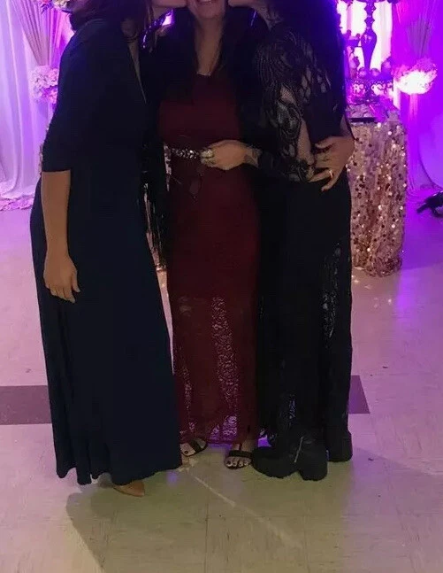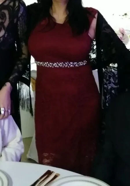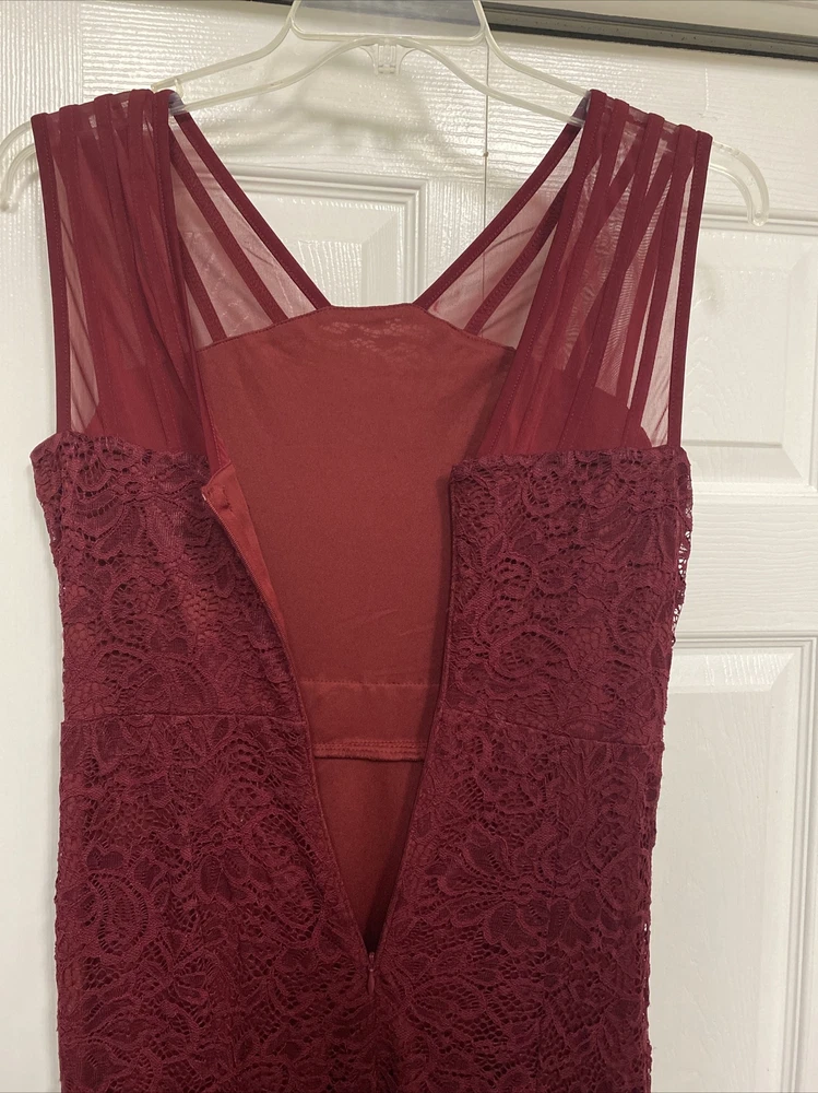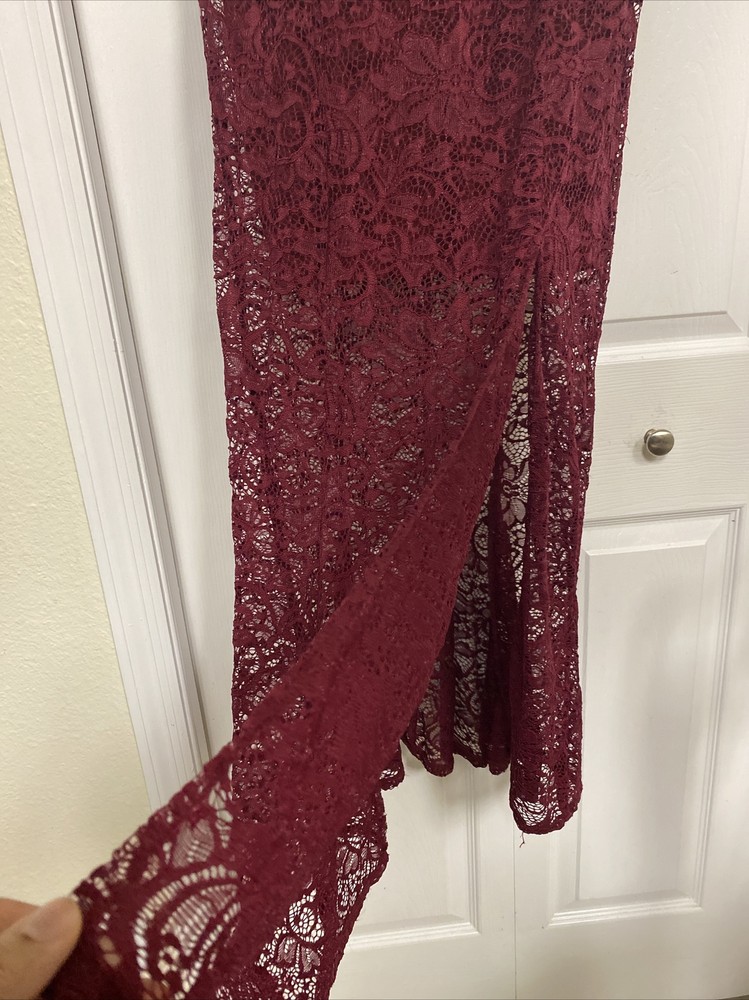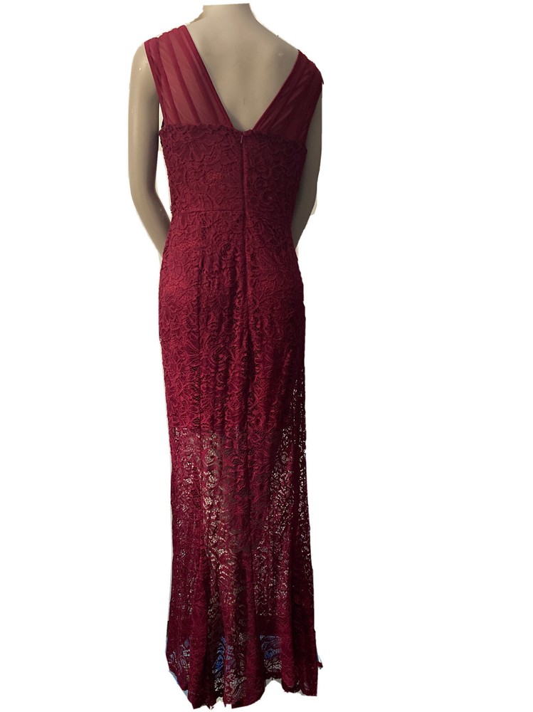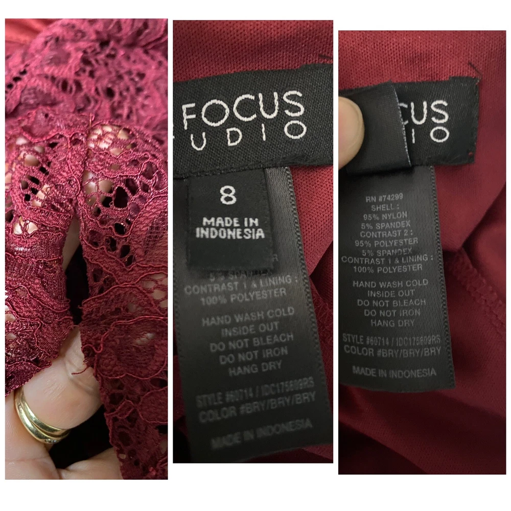 Enfocus Studio Burgundy Lace Underlay Empire Waist Embellished long Dress Size 8. Brand: Enfocus Studio Size: 8 Color: Burgundy(BRY) IDC175609RS style no. 60714 RN#74299 Lace Empire waist Rhinestone details at waist Slit Neckline: Scoop Sleeve: Cap lined Zip closure Made in: Indonesia Care: Hand wash Cold. Inside out. Hang to Dry Materials: Shell: 95% Nylon, 5% Spandex. contrast 1 and lining 100% Polyester. PLEASE REFER TO THE MEASUREMENTS PROVIDED BELOW FOR PROPER FIT. Approx. Measurements lay flat. Length: 53" Inches Bust: 17"inches Waist: 14"inches Hip:19.5" Inches Condition: Pre-owned in very good condition. part of the hem thread at the slit is missing it could be a easy fix. view pictures Please look at allthe Pictures carefully for more details. contact me with any questions about this listing or any of my other listings.