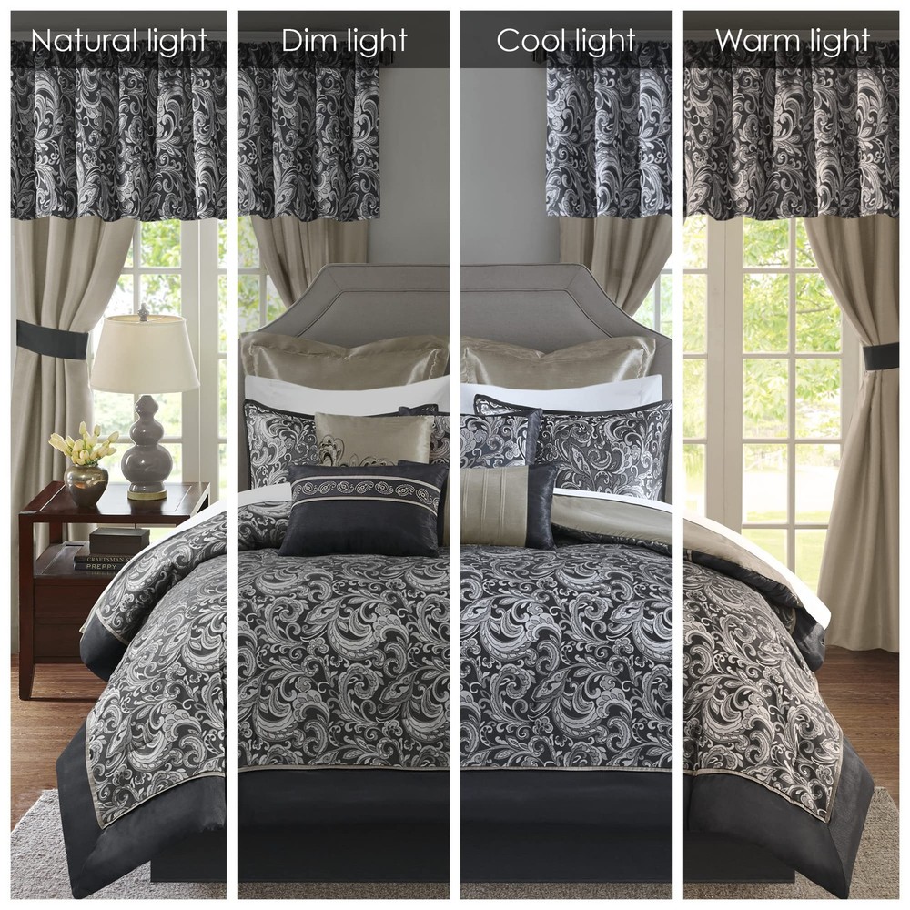 STYLE - Modern traditional elegant style cozy comforter set, so you can update your bedroom decor with a luxurious room décor. Faux silk with jacquard paisley design added luxurious fabric texture complement this classic traditional styling comforter. The matching ensembles for the entire bedroom mirror the design of the comforter, while the solid color reverse balances the look. 4 decorative pillows in embroidery design and pleating details complete the look of this classic traditional style comforter set MATERIAL - Feel the gentle faux silk comforter set which offers ultra soft feel and luxurious jacquard texture bedding cover. The faux silk fabric will also make you feel extra cozy giving you a better quality rest every night ALL SEASON - Our all season comforter sets offers a soft fabric reverse. Essentials bedding collection aims to offer you a better quality sleeping experience, perfect for year round use Set include: 1 Comforter: 104"W x 92"L, 2 King Shams: 20"W x 36"L, 1 Bedskirt: 72"W x 84"L + 15"D, 1 Decorative Pillow: 16"W x 16"L, 1 Decorative Pillow: 12"W x 18"L, 2 Decorative Pillows: 18"W x 18"L, 2 Euro Shams: 26"W x 26"L + 2"D, 1 Flat Sheet: 108"W x 102"L, 1 Fitted Sheet: 72"W x 84"L + 14"D, 2 King Pillowcases: 20"W x 40"L, 4 Window Panels: 42"W x 84"L, 4 Tie Backs: 4"W x 23"L, 2 Valances: 18"W x 54"L Care instructions: machine washable, spot clean pillows