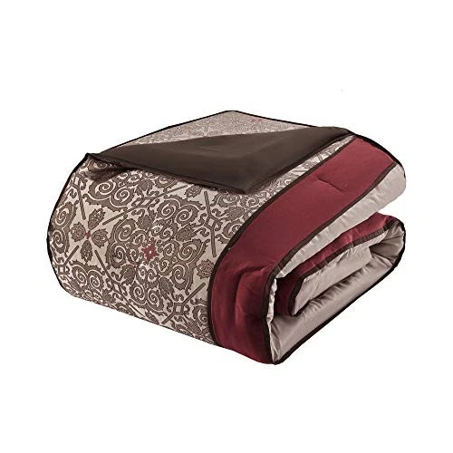 The Essentials Delaney 24 Piece Room in a Bag offers a refined traditional update to your bedroom decor. The jacquard details flaunted on the pieced faux silk comforter, shams, and window valances deliver an elegant statement, in rich red and natural hues. Large medallion embroidery is displayed off-center on the luxurious comforter, adding charm and dimension to the bedding set, while matching shams echo the motif seen on top of the bed to create an elegant look in your space. An included microfiber sheet set and bed skirt complements the bedding collection and offers exceptional comfort and style. Euro shams and four decorative pillows help to complete the bedding set, giving it a finished look. Accompanying this bedroom set are four window panels with four tie backs to keep curtains drawn open, while jacquard valances provide the finishing touches to your bedroom. This bedding set may come in rolled or compressed packing and will need to be fluffed up. Use a steam iron to help remove wrinkles easier. Jacquard Embroidered Pieced Microfiber sheet set Embroidered pillows 15" drop bedskirt Fitted sheet fits up to 16" mattress Set includes: comforter, 2 shams, bedskirt, 2 euro shams, 4 decorative pillows, flat sheet, fitted sheet, 2 pillowcases, 4 window panels, 2 valances, 4 tie backs Jacquard, pieced faux silk, embroidered, 8 oz/sq yard polyester filling, microfiber sheet set 1 Comforter:90"W x 90"L 2 Standard Shams:20"W x 26"L (2) 1 Bedskirt:60"W x 80"L plus 15"D 2 Euro Shams:26"W x 26"L plus 2"D (2) 4 Decorative Pillows:18"W x 18"L/16"W x 16"L/12"W x 18"L/12"W x 16"L 1 Flat Sheet:90"W x 102"L 2 Standard Pillowcases:20"W x 30"L (2) 1 Fitted Sheet:60"W x 80"L plus 14"D 4 Window Panels:42"W x 84"L (4) 4 Tie Backs:4"W x 23"L (4) 2 Valances:18"W x 54"L (2) Machine washable, spot clean pillows