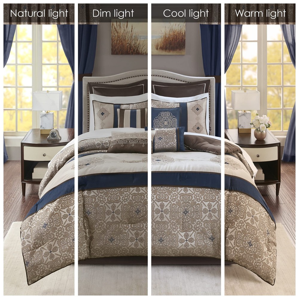 Glam luxury satin medallion jacquard pattern pieced in solid contrast and creates a serene bedroom bedding set Top of the bed includes BONUS 4 embroidered square and oblong decorative pillows for a finishing touch Luxurious jacquard and satin on top of the bed, coordinating window valance and curtains including 4 tiebacks Set includes: 1 Comforter: 104"W x 92"L, 2 King Shams: 20"W x 36"L, 1 Bedskirt: 78"W x 80"L + 15"D, 2 Euro Shams: 26"W x 26"L + 2"D, 4 Decorative Pillows: 18"W x 18"L/16"W x 16"L/12"W x 18"L/12"W x 16"L, 1 Flat Sheet: 108"W x 102"L, 2 King Pillowcases: 20"W x 40"L, 1 Fitted Sheet: 78"W x 80"L + 14"D, 4 Window Panels: 42"W x 84"L, 4 Tie Backs: 4"W x 23"L, 2 Valances: 18"W x 54"L Care instructions: machine washable, spot clean pillows