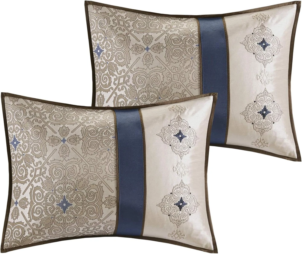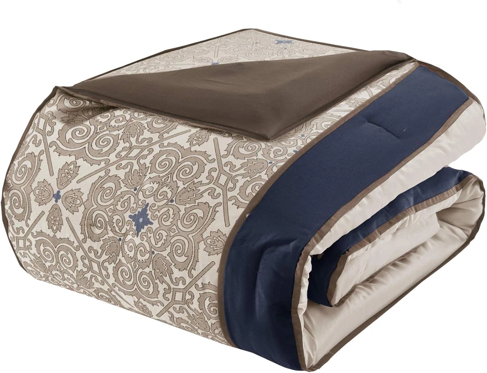 Store New Arrivals Add to Favorite View Feedback Contact Essentials Delaney 24-Piece Room in a Bag Comforter Set-Satin Jacquard All Season Luxury Bedding, Sheets, Decorative Pillows and Curtains, Valance, King (104 in X 92 In), Medallion Navy Description Item model number MPE10-813 Style Delaney, Medallion Navy Assembly required No Color Navy Pattern Geometric Fabric Type 100% Polyester Material Polyester Country of Origin China Item dimensions L x W x H 92 x 104 x 1.5 inches Item Weight 17.6 pounds Batteries required No Theme Medallion Size King (104 in x 92 in) Seasons All Number of Pieces 24 Product Dimensions 92 x 104 x 1.5 inches Product Care Instructions Machine Wash Included Components function(f) {var _np=(window.P._namespace("DetailPageProductOverviewTemplatesJava"));if(_np.guardFatal){_np.guardFatal(f)(_np);}else{f(_np);}}(function(P) { P.when('A').execute(function(A){ A.on('a:truncate:po-attribute-truncate-1:updated', function(data) { var isTruncated = !data.truncateInstance.getIfTextFits(); var seeMoreElement = document.getElementById('po-attribute-see-more-id-1'); if(seeMoreElement) { seeMoreElement.style.display = isTruncated ? '' : 'none'; } }) }); })); 1 Comforter, 2 King Shams, 1 Bedskirt, 2 Euro Shams, 4 Decorative Pillows, 1 Flat Sheet, 2 King Pillowcases, 1 Fitted Sheet, 4 Window Panels, 4 Tie Backs, 2 Valances See more 100% Polyester Glam luxury satin medallion jacquard pattern pieced in solid contrast and creates a serene bedroom bedding set Top of the bed includes BONUS 4 embroidered square and oblong decorative pillows for a finishing touch Luxurious jacquard and satin on top of the bed, coordinating window valance and curtains including 4 tiebacks Set includes: 1 Comforter: 104"W x 92"L, 2 King Shams: 20"W x 36"L, 1 Bedskirt: 78"W x 80"L + 15"D, 2 Euro Shams: 26"W x 26"L + 2"D, 4 Decorative Pillows: 18"W x 18"L/16"W x 16"L/12"W x 18"L/12"W x 16"L, 1 Flat Sheet: 108"W x 102"L, 2 King Pillowcases: 20"W x 40"L, 1 Fitted Sheet: 78"W x 80"L + 14"D, 4 Window Panels: 42"W x 84"L, 4 Tie Backs: 4"W x 23"L, 2 Valances: 18"W x 54"L Care instructions: machine washable, spot clean pillows The Madison Park Essentials Delaney 24 Piece Room in a Bag offers a refined traditional update to your bedroom decor. The jacquard details flaunted on the pieced faux silk comforter, shams, and window valances deliver an elegant statement, in rich navy and natural hues. Large medallion embroidery is displayed off-center on the luxurious comforter, adding charm and dimension to the bedding set, while matching shams echo the motif seen on top of the bed to create an elegant look in your space. An included microfiber sheet set and bed skirt complements the bedding collection and offers exceptional comfort and style. Two Euro shams and four decorative pillows help to complete the bedding set, giving it a finished look. Accompanying this bedroom set are four window panels with four tie backs to keep curtains drawn open, while two jacquard valances provide the finishing touches to your bedroom. ABOUT US We offer the best prices around on high quality products. Our E-store includes media such as books, movies, music and games while offering electronics, toys, sporting apparel, clothing, tools, general home, garden items and more. SHIPPING We are always working hard to ensure your package arrives as soon as possible. Please understand that some factors like weather, high postal traffic, and the performance of shipping companies are outside of our control. We offer free shipping to the lower 48 states and ship within 2 business days of payment, usually sooner. We do not accept P.O. Boxes. Please provide a physical address. For shipping outside of the continental USA, we only use eBay's Global Shipping Program.The item is shipped to KY and then sent to the rest of the world. International customers are responsible for all duties and taxes. Continue to check out in order to calculate costs for shipping the item to your country. Messages regarding eBay's Global Shipping Program MUST be directed at eBay EXCLUSIVELY. RETURNS We offer a 30-Day Return Policy on items which you are not completely satisfied with. You have the option for a full-refund or an exchange of the item. No returns are available on items shipped outside of the USA. PAYMENT We accept PayPal. CONTACT US This page content is yet to come Please ad us to your favorite seller and visit again later Thank You CUSTOMER SATISFACTION We try our very best to make sure every customer is completely satisfied. If there's a problem, message us! We're happy to help.