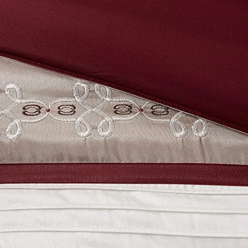Update your entire space instantly with the Essentials Jelena 24 Piece Room in a Bag. The bold red base on this comforter works beautifully with the soft white and red piecing. Decorative embroidery adorns the bottom portion of this comforter and the center of each sham creating a rich look in your space. Four solid red window panels, four taupe tie backs and two embroidered valances accompany your new bedding for a whole room makeover. Four embroidered decorative pillows, two euro shams and a bedskirt put the finishing touches on this complete look. The faux silk bed in a bag comforter set features multi-color piecing and decorative embroidery creating a rich look in your space. Classic luxurious 24 piece bed in a bag offers everything you need to update your room décor. This set is made from polyoni cover creating natural sheen for a lustrous and luxurious design. Set includes: 1 Comforter: 90"W x 90"L, 2 Standard Shams: 20"W x 26"L, 1 Bedskirt: 60"W x 80"L plus 15"D, 4 Decorative Pillows: 16"W x 16"L/12"W x 18"L/18"W x 18"L/12"W x 16"L, 2 Euro Shams: 26"W x 26"L plus 2"D, 1 Flat Sheet: 90"W x 102"L, 1 Fitted Sheet: 60"W x 80"L plus 14"D, 2 Pillowcases: 20"W x 30"L, 4 Window Curtains: 42"W x 84"L, 2 Window Valances: 18"W x 54"L, 4 Tiebacks: 4"W x 23"L Care instructions: machine washable