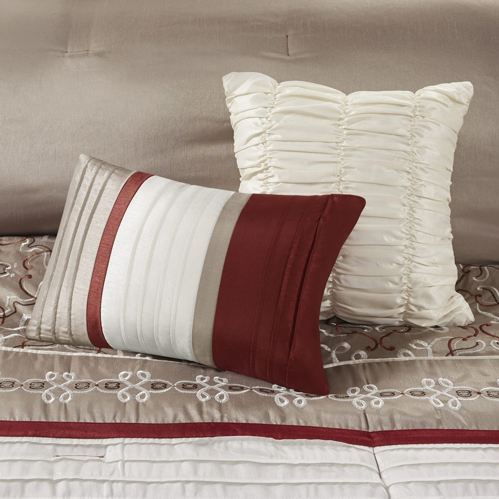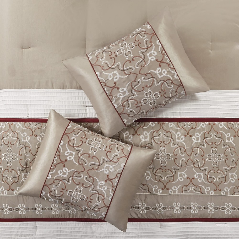 The faux silk bed in a bag comforter set features multi-color piecing and decorative embroidery creating a rich look in your space. Classic luxurious 24 piece bed in a bag offers everything you need to update your room dΓ©cor. This set is made from polyoni cover creating natural sheen for a lustrous and luxurious design. Set includes: 1 Comforter: 90"W x 90"L, 2 Standard Shams: 20"W x 26"L, 1 Bedskirt: 60"W x 80"L plus 15"D, 4 Decorative Pillows: 16"W x 16"L/12"W x 18"L/18"W x 18"L/12"W x 16"L, 2 Euro Shams: 26"W x 26"L plus 2"D, 1 Flat Sheet: 90"W x 102"L, 1 Fitted Sheet: 60"W x 80"L plus 14"D, 2 Pillowcases: 20"W x 30"L, 4 Window Curtains: 42"W x 84"L, 2 Window Valances: 18"W x 54"L, 4 Tiebacks: 4"W x 23"L Care instructions: machine washable