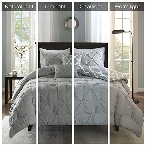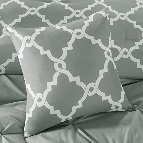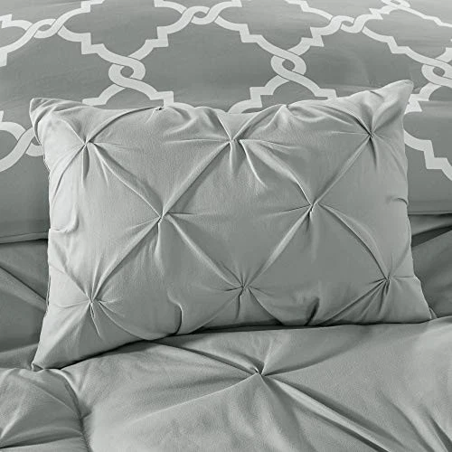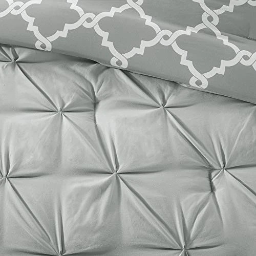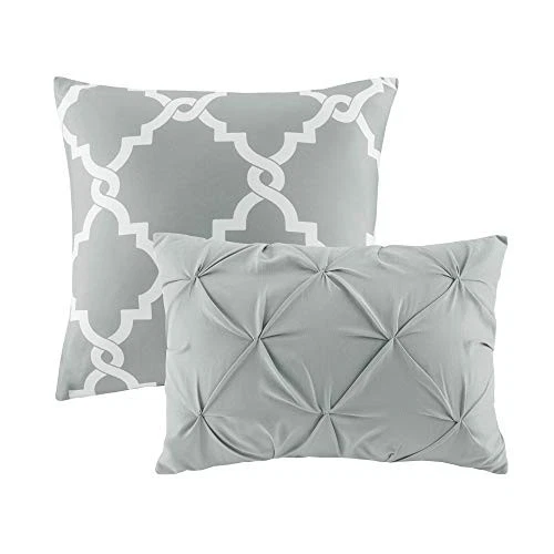 The Essentials Kasey 5 Piece Reversible Comforter Set gives you the option to dress up your room depending on your mood! One side features a grey with a cast of green tufted look while the reverse is a grey and white printed fretwork design. Shams are fully reversible as well and two decorative pillows feature solid fabric manipulation and printing to match back to both options. Included in the set is one comforter, two shams, and two decorative pillows. Machine washable, items in the set may come in a rolled or compressed packaging, which will need to be fluffed up or steam ironed before use to remove wrinkles. Reversible Fretwork design Tufted Comforter/Sham: 85gsm microfiber solid tufted and 85gsm microfiber printed back , 250g/m2 polyester filling Pillow: 100% polyester cover, polyester filling 1 Comforter:90x90" 2 Standard Shams:20x26" (2) 2 Decorative Pillows:12x18"/18x18" MACHINE WASH COLD, GENTLE CYCLE, AND SEPARATELY. DO NOT BLEACH. TUMBLE DRY LOW, REMOVE PROMPTLY, DO NOT IRON. IF THERE IS NO FREE MOVEMENT IN THE WASHER OR DRYER, USE LARGE CAPACITY COMMERCIAL WASHER/DRYER.