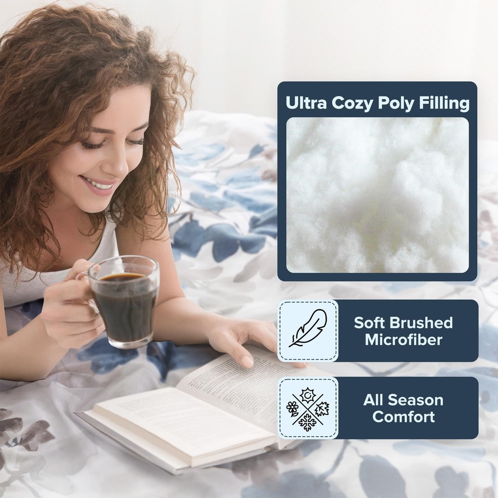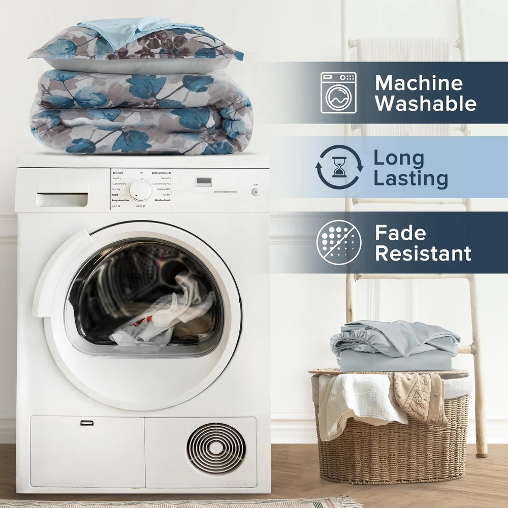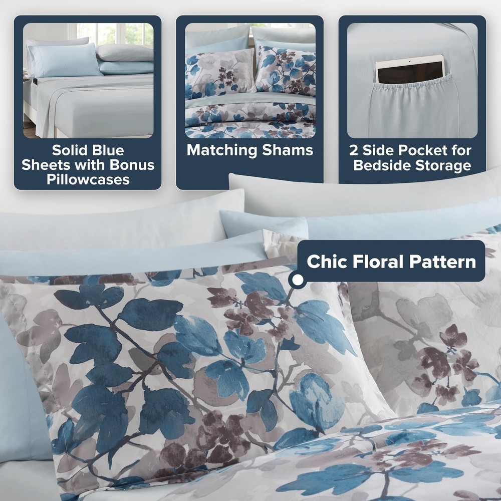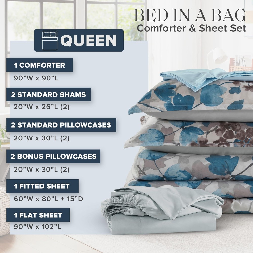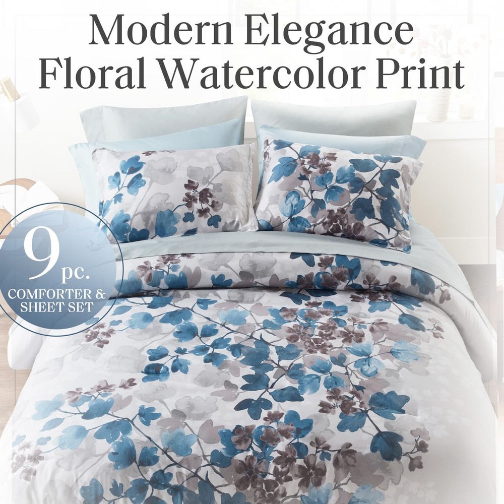 Transform your bedroom into a sanctuary of modern elegance with our Floral Watercolor Print Bed in a Bag 9-piece Comforter & Sheet Set. Featuring a stunning floral design that captures nature's beauty in soft, flowing watercolor hues Lightweight & Fluffy Comforter - This soft and fluffy brushed microfiber bed set features bartack design ensuring even fill distribution, preventing shifting & clumping for consistent warm and comfort. Includes microfiber sheet set for a complete refresh All Season - Enjoy year-round comfort with our comforter set. The ultra-soft brushed microfiber provides a smooth touch, while the plush poly filling delivers cloud-like warmth. Features 2 sheet side pockets for convenient bedside storage Set includes: 1 Comforter: 90"W x 90"L, 2 Standard Sham: 20"W x 26"L, 1 Flat Sheet: 90"W x 102"L, 1 Fitted Sheet: 60"W x 80"L + 15"D, 2 Standard Pillowcase: 20"W x 30"L, 2 Bonus Pillow Case: 20"W x 30"L Care instructions: Machine wash cold on gentle cycle, tumble dry on low heat, wash alone USING LARGE CAPACITY COMMERCIAL WASHER/DRYER, do not bleach.
