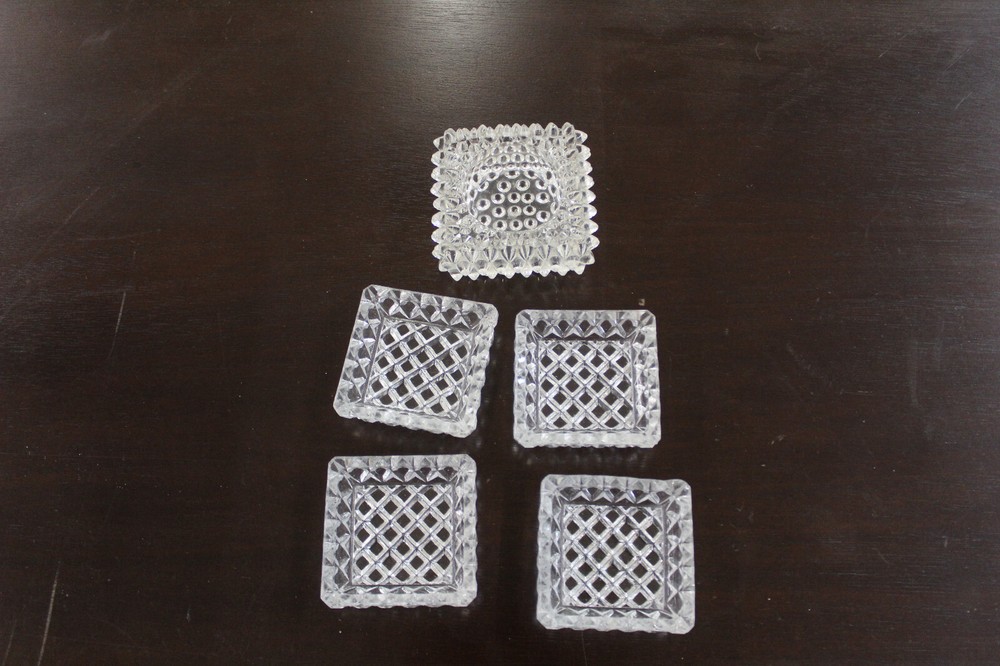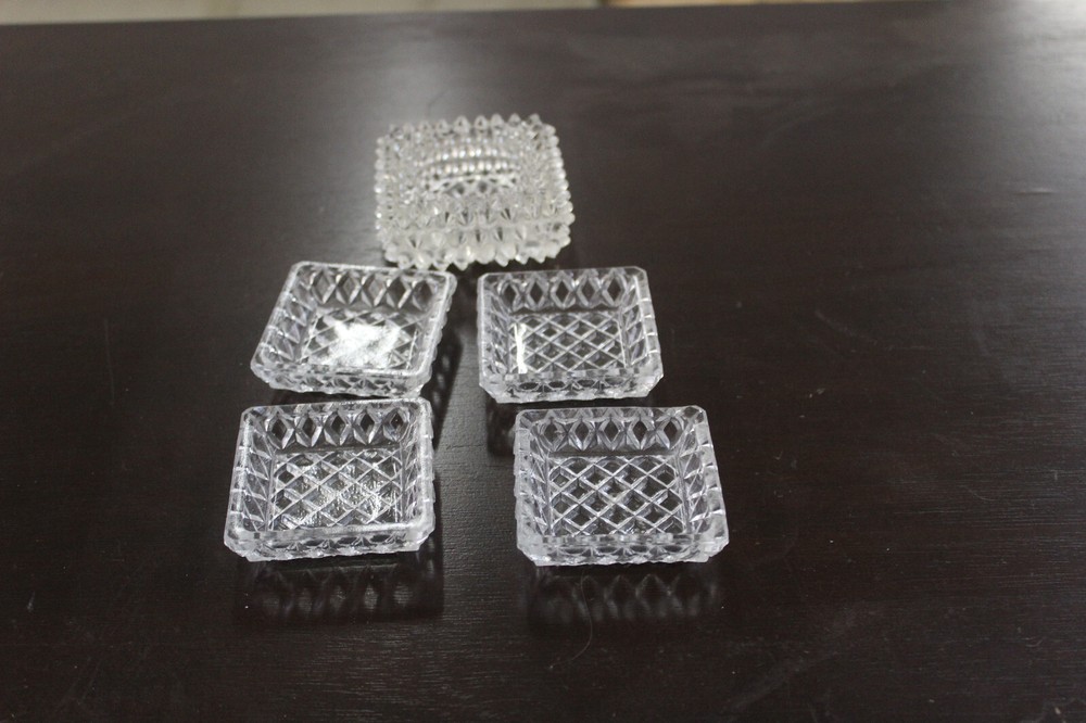 Offered is a lot of 5 antique Large Glass Salt Cellars, 4 matched and one larger , 4 matched measure 2 3/8 inch square and larger is 2 3/4 x 2 3/4 and 1 1/4 high, all in good condition fresh from estate liquidation