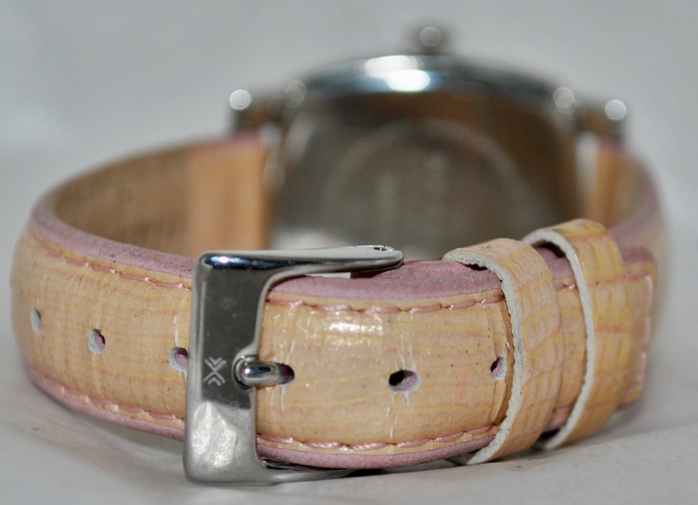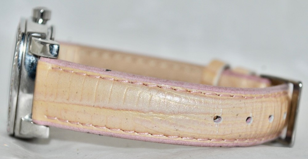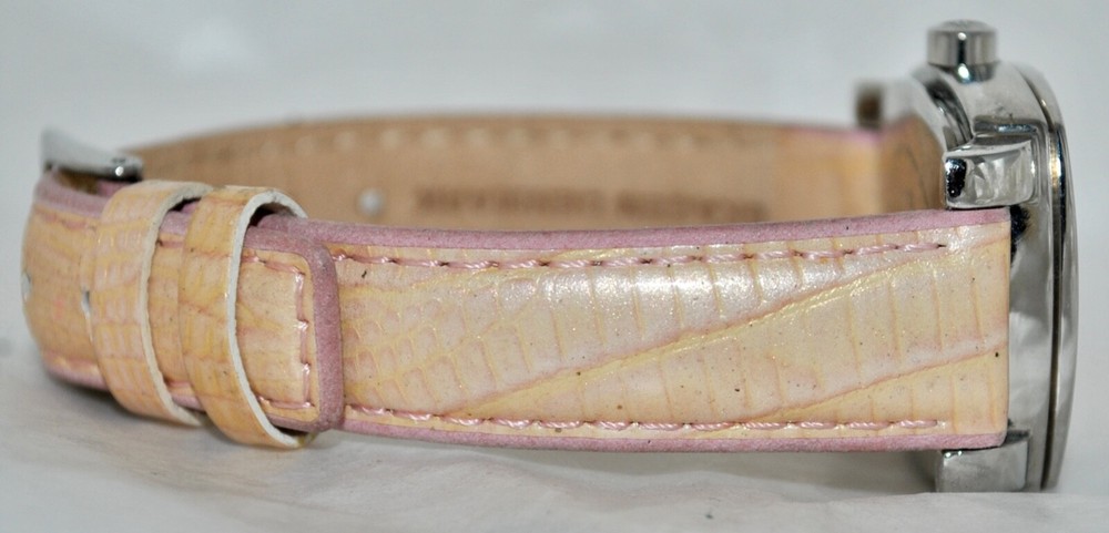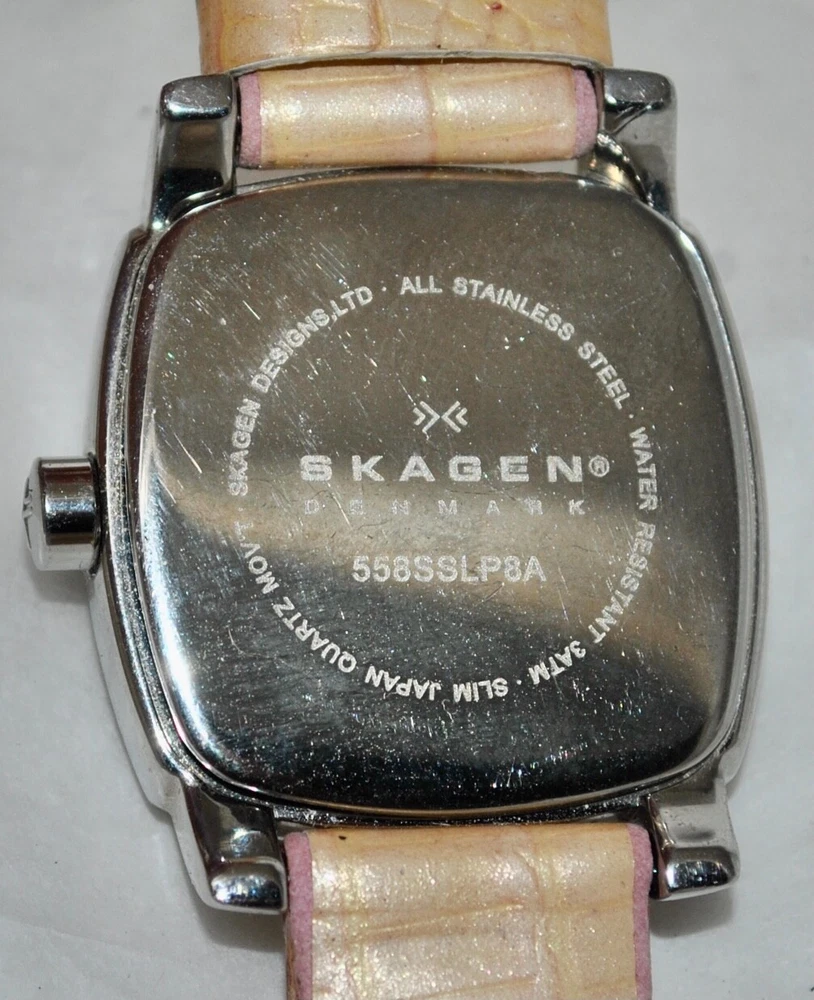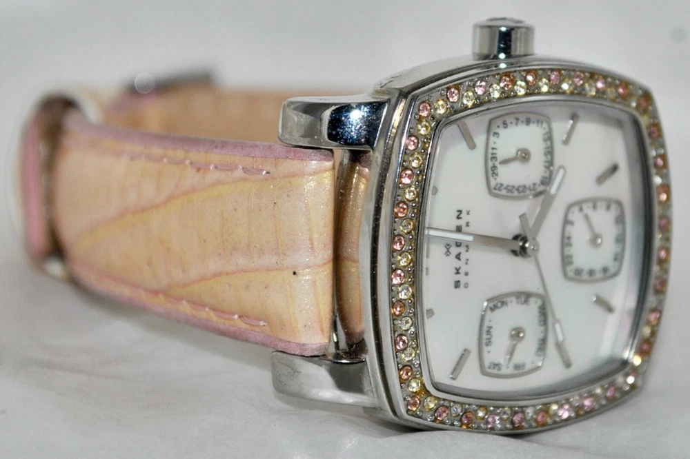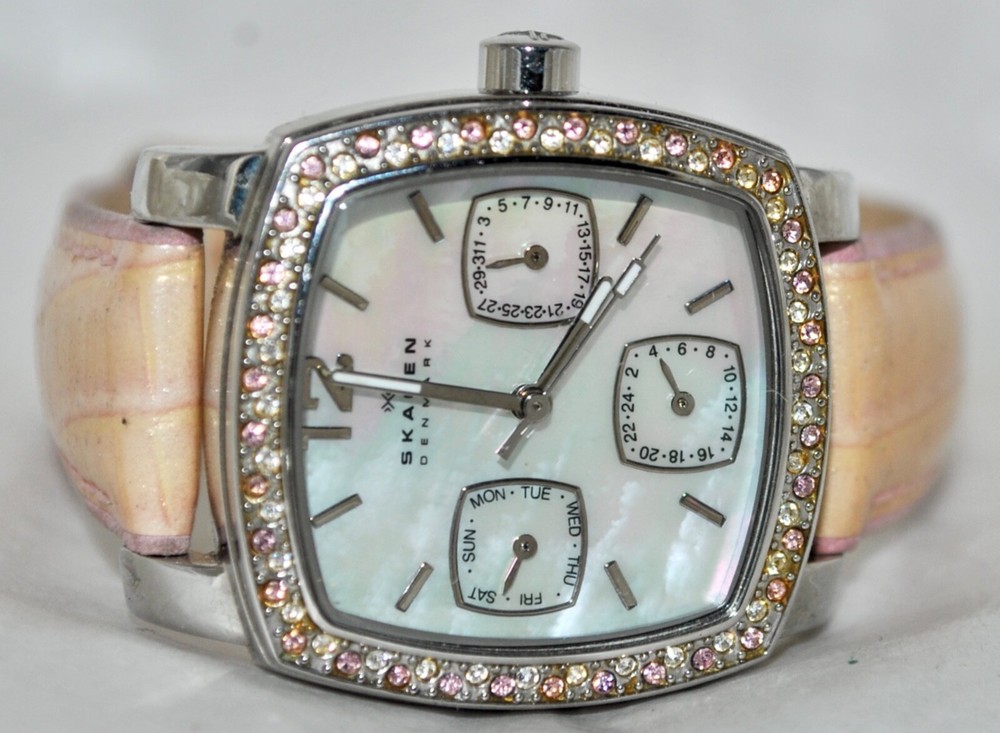 SEE AUCTION SALE NOTE BELOW-PAYMENT DUE WITHIN THREE (3) DAYS AFTER END OF AUCTION UNLESS BUY-IT-NOW! I DO NOT CHARGE FOR POSTAL INSURANCE NOR INSURE THE PURCHASE-ADVISE IF ITEM TO BE INSURED BEFORE MAILLING Overseas Buyers: You (the buyer) are responsible for any taxes, fees, duties or other charges which may be imposed by your post office or other government agency in your country. Any such charges are NOT included in the purchase price or shipping charge. If in doubt, please check with your own post office before placing a bid or buying. Thank you! Description FABULOUS ESTATE FIND! SKAGEN WOMEN’S STUDIO WATCH CRYSTAL BEZEL, MOTHER-OF-PEARL DIAL, WITH DATE DIALS PINK/PEACH IRRIDESCENT LEATHER BAND PRE-OWNED CONDITION MODEL 558SSLP8A NEW BATTERY-RUNNING AND KEEPING TIME This is truly a great looking Skagen women’s Studio watch. The square all stainless steel watch case houses a mother-of-pearl dial. Embedded around the entire border of the square bezel are beautiful crystals in pink and white, that cate the light and draw attention. The hour markers are represented with “12” and raised silver batons. The watch hands are silver with luminous tips for easy ready day or night. The three square sub-dips offer handy day, date, and 24 hour time conversation information. The watch is on a pink iridescent leather band with a buckle closure. When listed, a new battery was placed in the watch and is running and working properly. This watch really stands out when worn Watch Face /Case Size: 30mm x 31mm Watchband Width: 15mm Watchband Length: 8 7/8” (Includes Buckle Measurement; Adjustable) Crystal: Shows No Wear Movement- Quartz Movement Hallmarks- As Seen In Pictures Condition: Great Wearable Condition Shipping There is combined shipping on all purchases made within a 24 hour period. Shipments are made to verified paypal addresses. There is international shipping to some locations. All packages will be sent first class, unless otherwise stated. Items are shipped within 24 hours of receipt of payment, unless otherwise noted.