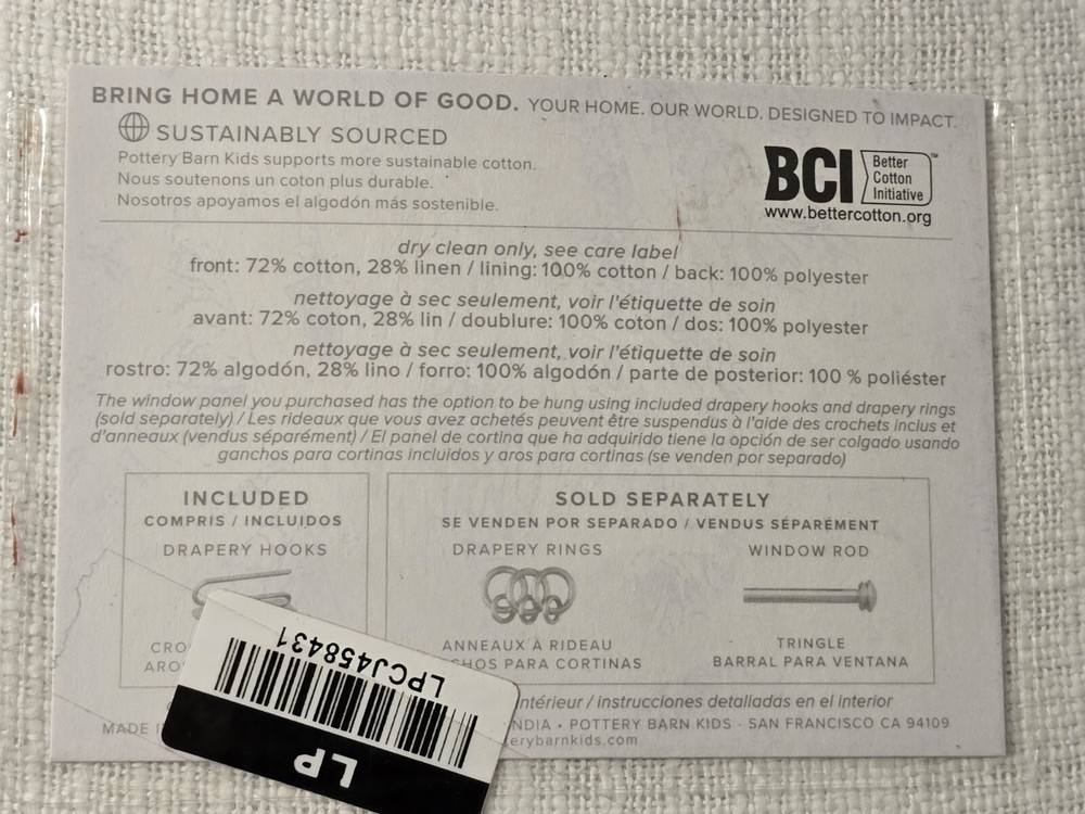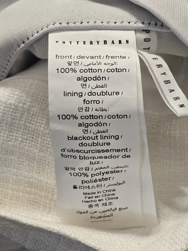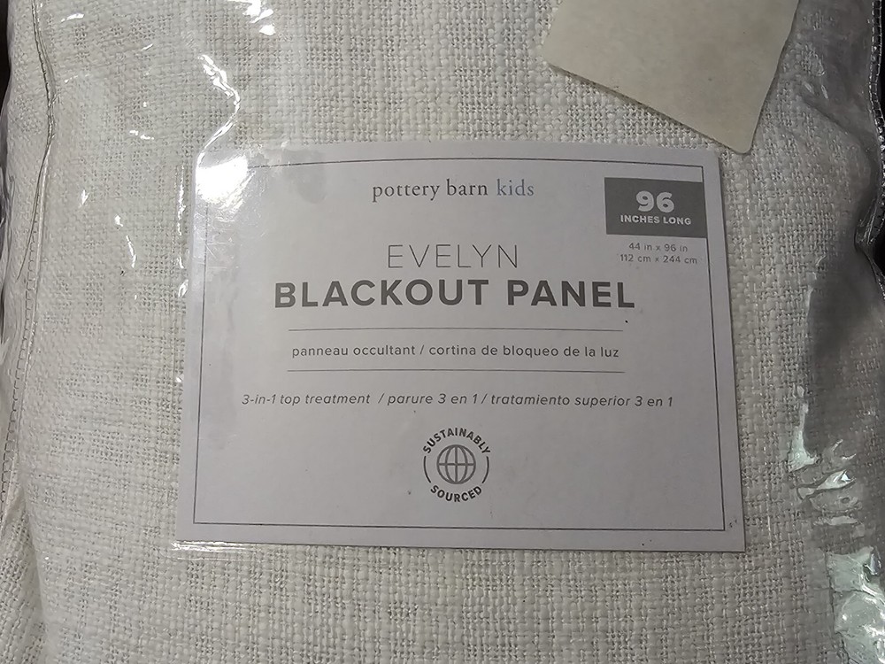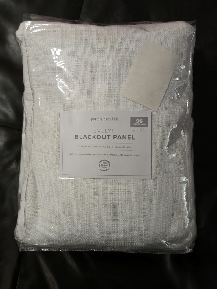 Evelyn Blackout Panel Seaton White Pottery Barn Kids 50 x 96 in Reframe a room. Crafted of cotton, Seaton’s textural weave adds soft dimension to any space. Weft with ivory threads, this midweight curtain has a subtle heathered look that’s casual and relaxed. CONSTRUCTION Made of 100% Cotton. Blackout liner: Crafted from 100% polyester, it prevents most light from entering windows to help darken the room. Our curtain’s 3-in-1 construction offers three hanging options: pole pocket, hanging loops, ring top. Detailed with blind-stitched hems. 50" wide panels have a visible seam where the panels are sewn together. Every additional 50" will add a visible seam. Length includes height of rod pocket. Imported. CARE Machine wash cold; gentle cycle. Only use non-chlorine bleach, if needed. Tumble dry on low heat; remove promptly. Warm iron, as needed.