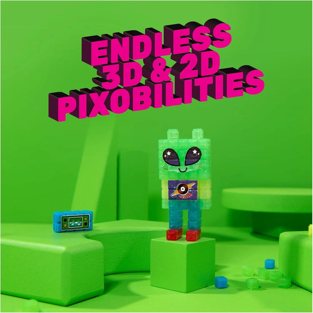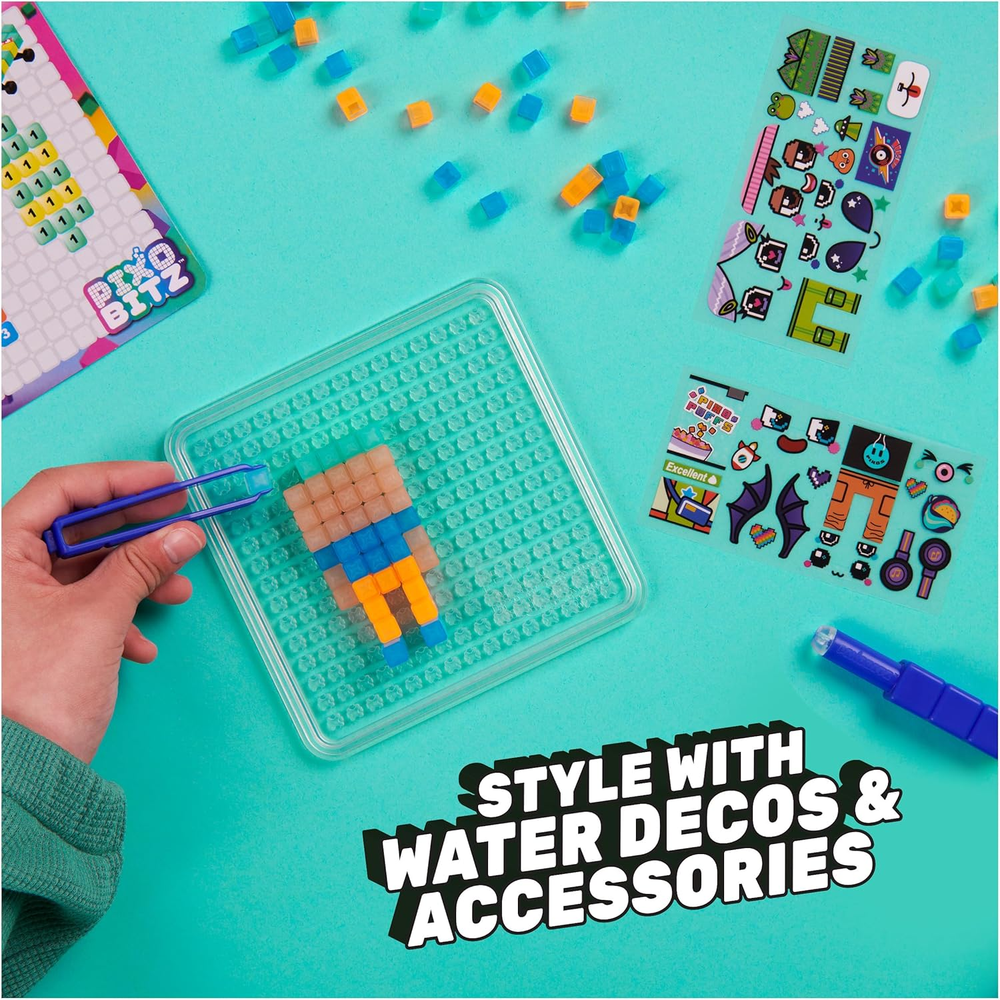 NO HEAT NEEDED: Mess-free Bitz (cube-shaped beads) stick with water! Stack on the tray, spray each layer and style with unique Pixobitz accessories and water transfer decos! STYLE YOUR WAY: Customize with 11 exclusive accessories like a tail, ears, keychains and more; add decos like eyes, outfits and icons! Follow the templates to make an alien, pizza and more or make your own creations! EXCLUSIVE NEON WATER FUSE BEADS CRAFT KIT: Make 3D and 2D creations you won’t find anywhere else with 600 Bitz in 10 colors, 4 tools, 3 templates (12 designs), 11 accessories and over 150 water decos! EASY STORAGE: The studio becomes a carrying case – store it with your crafts and art supplies or take it on-the-go! Pixobitz crafts for kids are great birthday gifts, Christmas gifts or gifts for kids for any occasion. FUN ARTS & CRAFTS TOYS FOR 6 YEAR OLD GIRLS AND BOYS: Discover endless ways to create with Pixobitz! Perfect toys for creative kids who enjoy DIY, self-expression, craft kits, building toys and more. Includes: 1 Pixobitz Neon Studio, 600 Bitz (Cube-Shaped Water Fuse Beads) in 10 Colors, 11 Accessories, 1 Water Transfer Deco Sheet, 4 Tools, 2 Trays, 3 Templates, 1 Instruction Guide Covered by the Spin Master Care Commitment. See below for full details Make exclusive neon creations with the Pixobitz Neon Studio! This neon-themed DIY studio toy can’t be found anywhere else and has everything you need to make your own 3D and 2D pixel art creations that stick with water. It features 600 Bitz (cube-shaped water fuse beads) in 10 vibrant colors, 11 accessories, over 150 water transfer decos, four easy-to-use tools, two trays and three template cards. Following the templates in this bead kit, make 12 amazing end results, including a cool neon green alien, a pizza box, skateboard, fox and more, or design your own unique creations. Creating with Pixobitz is as easy as stack, spray, and style! Slide a template under a tray and use the tools to help you build. Lay out your neon Bitz on the tray – the cube design makes them easy to stack, preventing them from rolling away. Mist each layer, then style your creation! Choose from different water deco eyes and facial expressions, letters, graphics, and more, and accessories including ears, wheels, a tail, keychains and more. With so many neon Bitz, water decos and accessories, there are endless ways to create! For best results, wait 20 minutes after each layer and 45 minutes for your Pixobitz bead art to fully set before play. Use your creations in imaginative pretend play or display them as creative kids room decor! For easy organization and storage, the Pixobitz Neon Studio closes into a carrying case and fits everything inside – take it with you on-the-go! The Pixobitz Neon Studio and Clear and Metallic Bead Packs (sold separately) are fun kids crafts, perfect toys for girls and boys who like arts and crafts projects, DIY kits and toy building sets. They’re great gifts for 6 year old girls and boys. Experience a new dimension of creativity with the all-in-one exclusive Pixobitz Neon Studio!