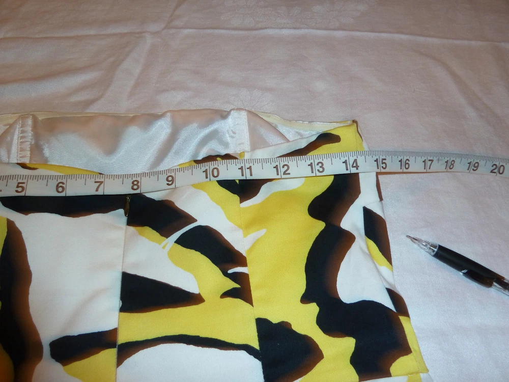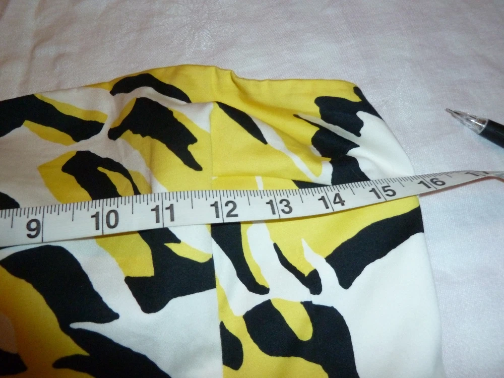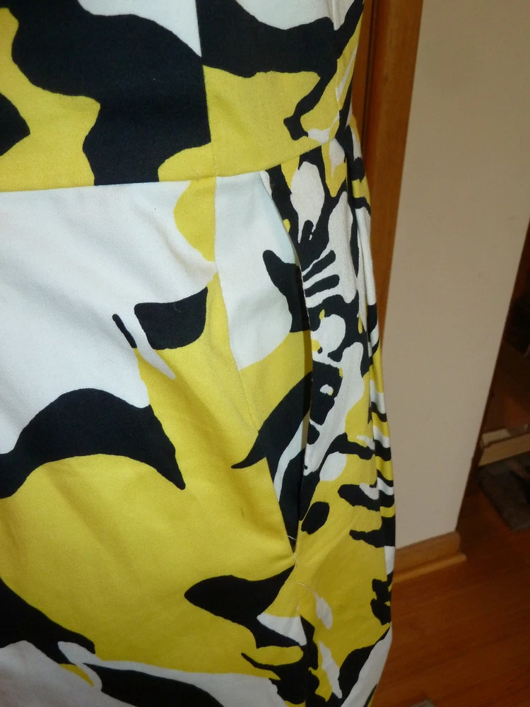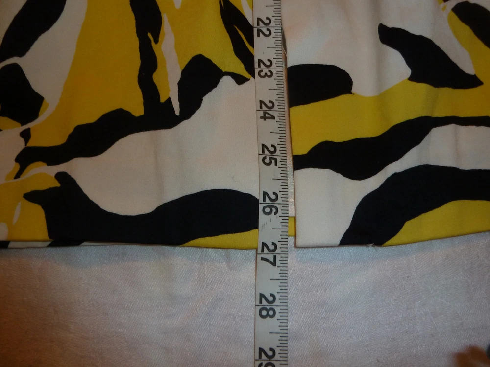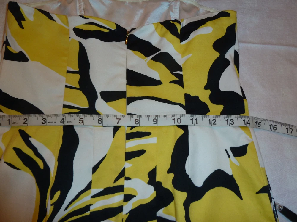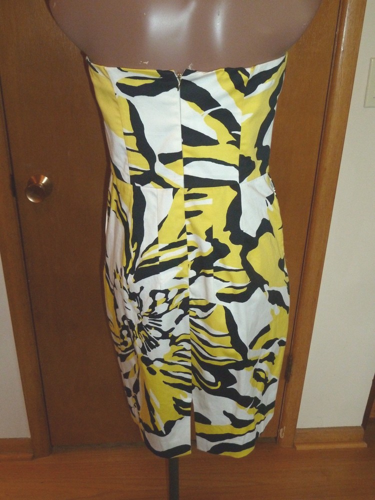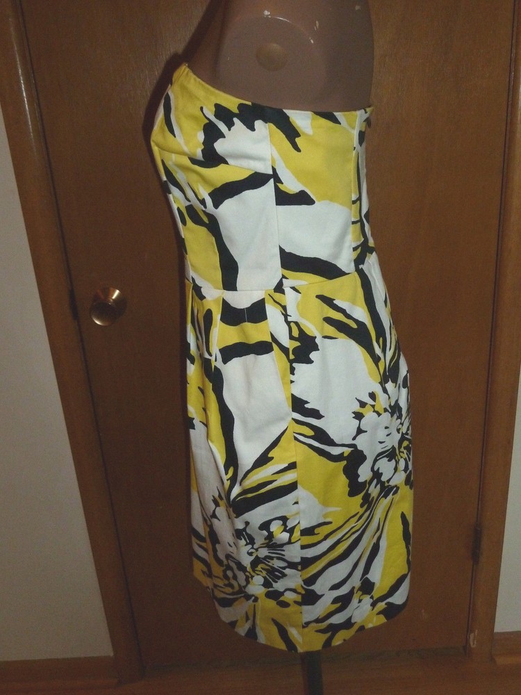 Express Design Studio-Womens-Dress-S Cotton Stretch-FormFitted Sheath-Strapless Size: S Color: Yellow, Black, White Design: Strapless Back Zipper and Hem Slit Sleeves: Sleeveless Materials: 99% Cotton-1% Spandex Measurements (approximate) Please review pictures This dress does have stretch Length: 27" Underarm to underarm (laying flat): 32' Bust Waist (laying flat):28" This Strapless dress has boned bustier yellow white black. Fully lined with 2 pockets, The Spandex gives some flexibility and the design does also from daytime to evening. Condition: Excellent B0837