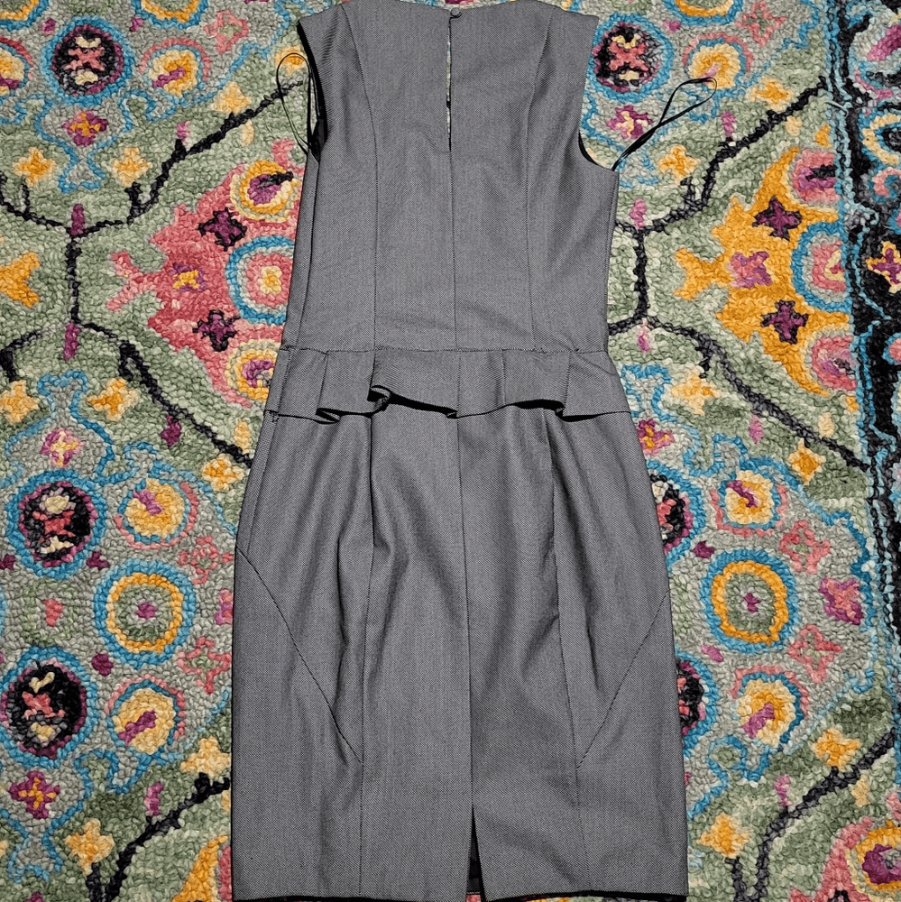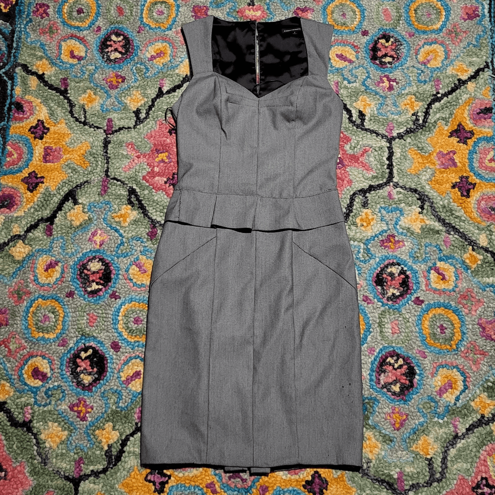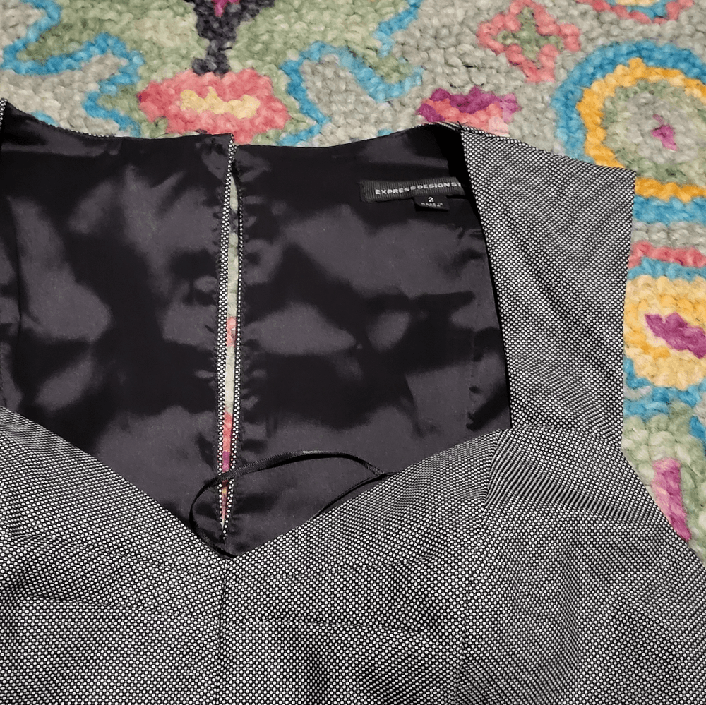 Express Design Studio Dress: - business casual style, sweetheart neckline with peplum waist - grey/white Birdseye pattern - zipper side closure, keyhole back buttom closure - measures nearly 16" ptp, almost 13.5" across waist, 36.5" long - in excellent condition with no apparent flaws