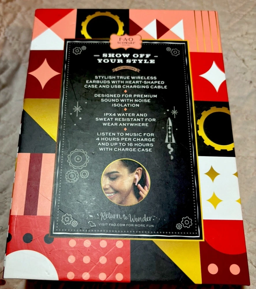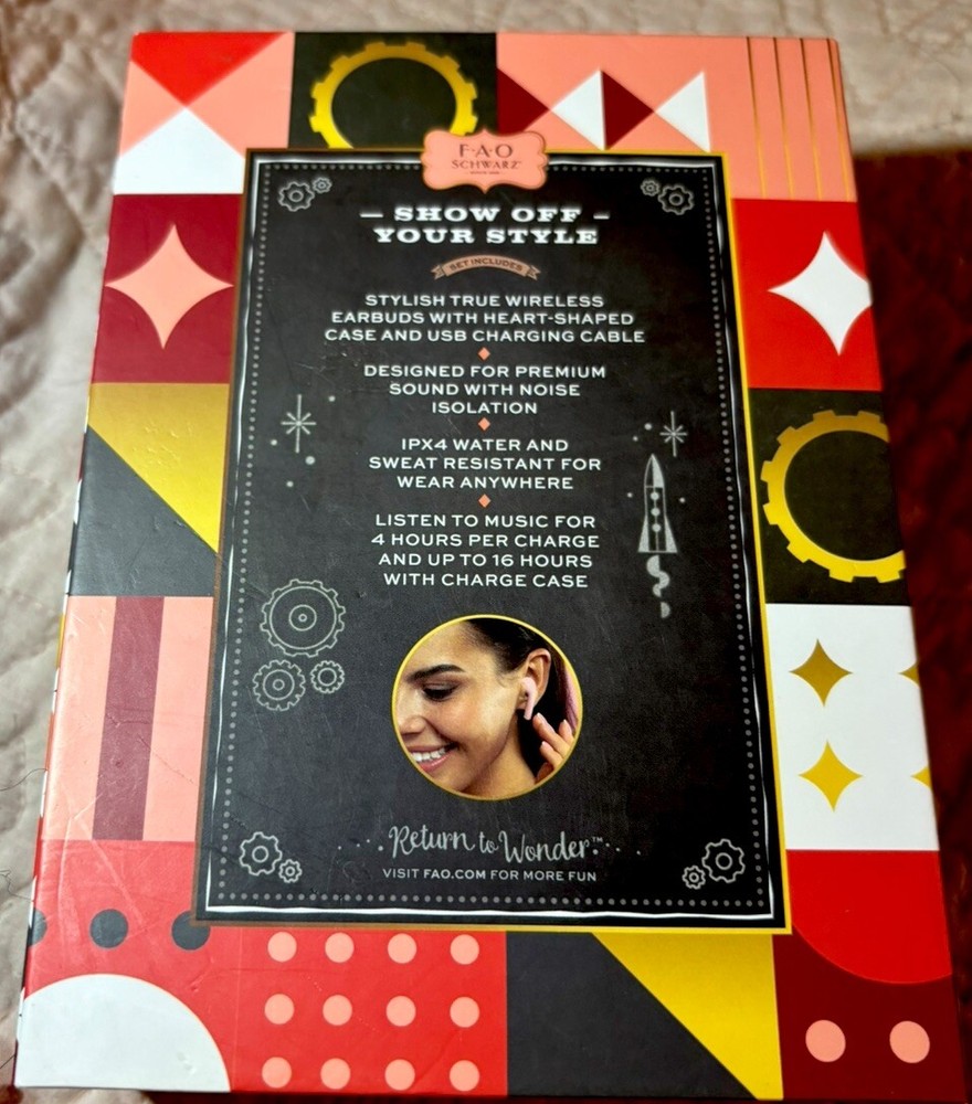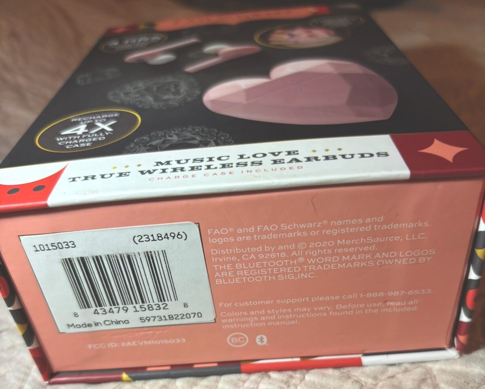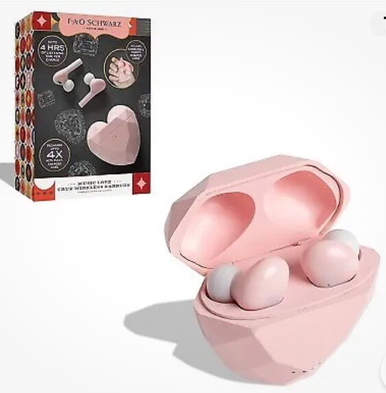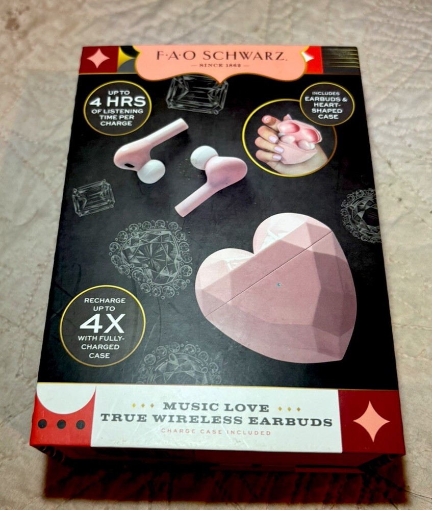 The item in pics 1, 2, 3, 5, & 6 are pics of the actual item the buyer will receive. Pic 4 is from FAO site to show the earbuds in the heart shaped charging/ carrying case. Features: Designed for premium sound with noise isolation. IPX4 water and sweat resistant for wear anywhere. Liston to music for 4 hours per charge and up to 16 hours with charge case. Comes with USB cable and 4 different sized silicone ear tips to fit a wide range of ear openings and user/instruction guide. Show Off Your Style with these "Music Love" Pink Wireless EarBuds with a heart-shaped USB charging / carrying case by FAO Schwarz. This stylish and functional earbuds are perfect for all your audio needs. Designed to provide the best listening experience, these earbuds come with built-in wireless technology for seamless connectivity. With a double-earpiece design, these earbuds fit comfortably in your ear and provide crystal-clear sound quality. The earbuds come in a beautiful pink color that adds a touch of elegance to your audio accessories. The heart-shaped USB charging / carrying case not only looks cute but also protects your earbuds from dust, dirt, water and scratches. Enjoy your favorite tunes with the "Music Love" Pink Wireless EarBuds Earphone. These earbuds come in a heart-shaped case from the renowned FAO Schwarz brand. With Bluetooth wireless technology, you can listen to music on the go without any hassle. The earbuds feature a double earpiece and are designed to fit comfortably in your ears. They come in a vibrant pink color and have a built-in microphone for easy hands-free calling. These earbuds are perfect for anyone who loves to listen to music while on the move.