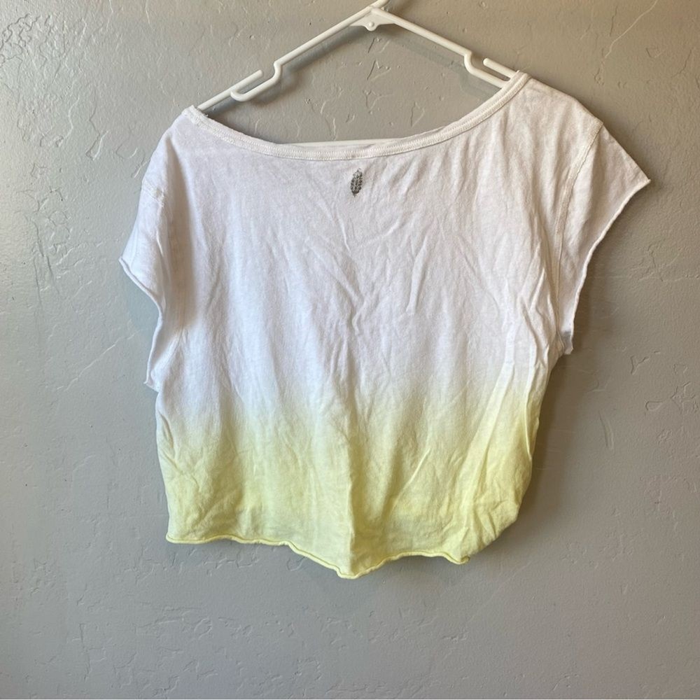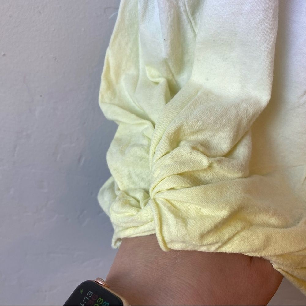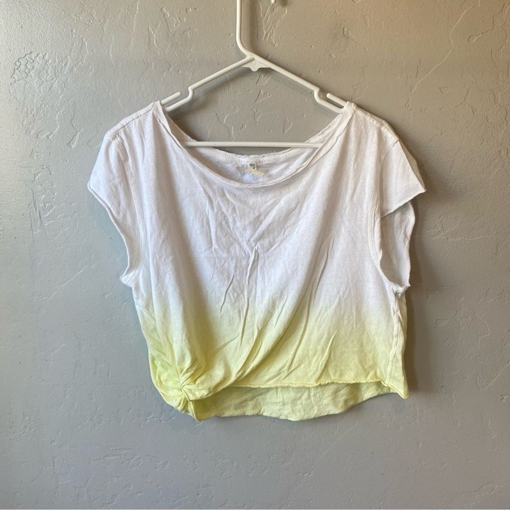 Find balance in this so soft and lightweight tee featured in a slouchy silhouette with a wide neckline and knotted side detail in a bold dip-dyed design. Condition: Excellent - Slight pilling, but no other flaws FP Movement Hold It Down Dip Dye Tee Size: Large | L Color: Yellow & White 100% Cotton Lightweight Oversized loose cropped fit Wide Neckline Cap Sleeves Semi-Sheer Slightly Cropped Knotted Hem A95