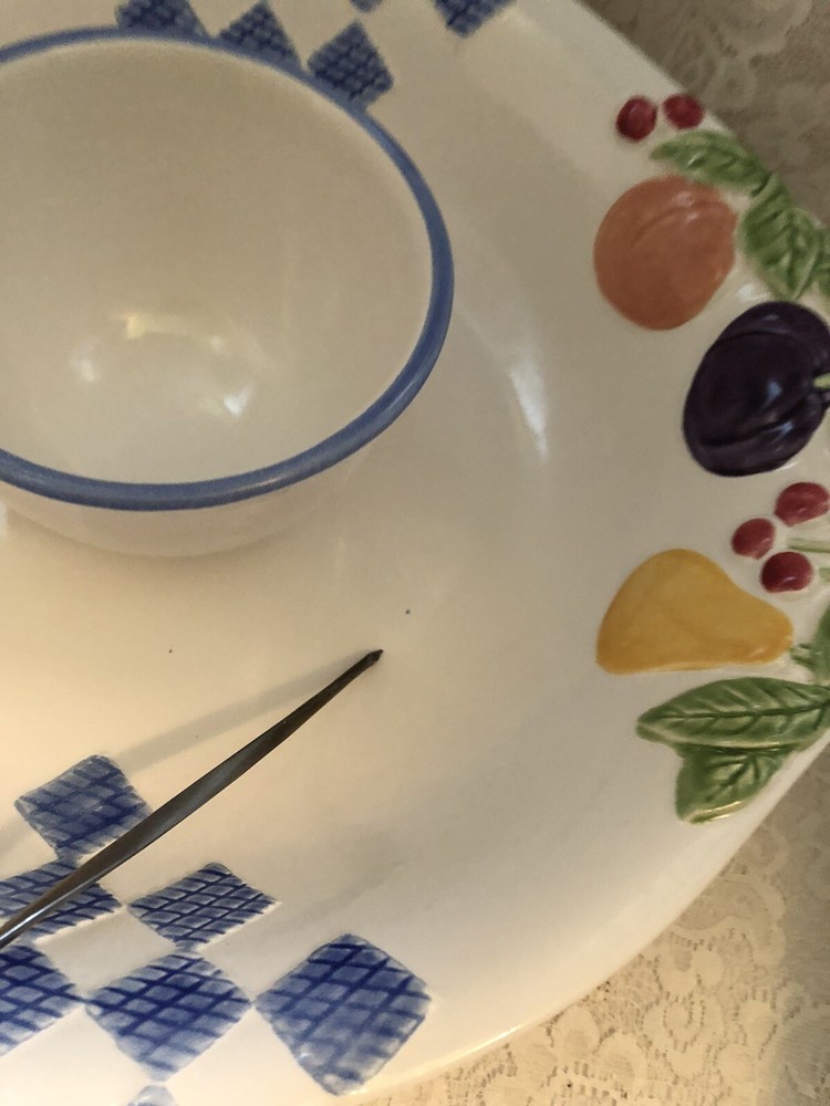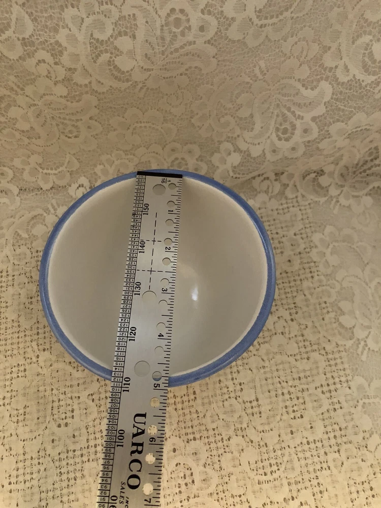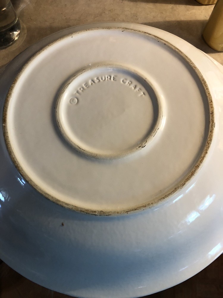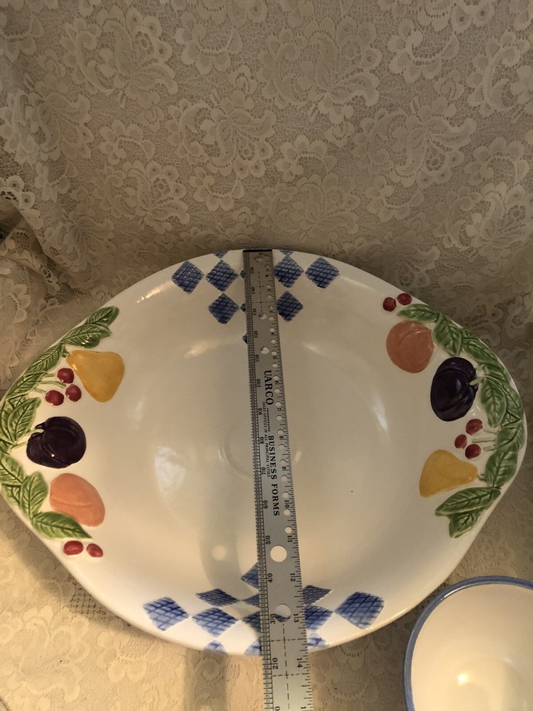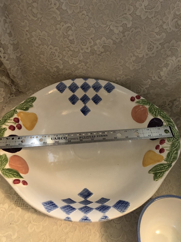 Up for consideration..a fabulous large chip & dip by Treasure craft, a company of Pfaltzgraff. The pattern name is Hopscotch. Excellent, like new condition however there is a tiny factory blue speck of paint on the front. (see pic) The chip bowl measures approx. 17" wide x 14" across & stands 3-1/4" high. The dip bowl measures approx 3-1/3" high x 5" across . Buy multiple items & save on shipping. Local pick up available.