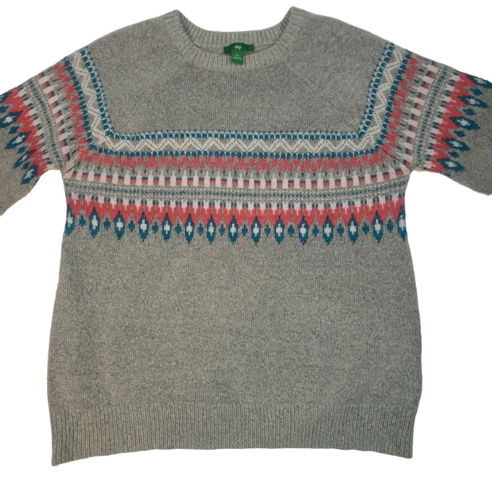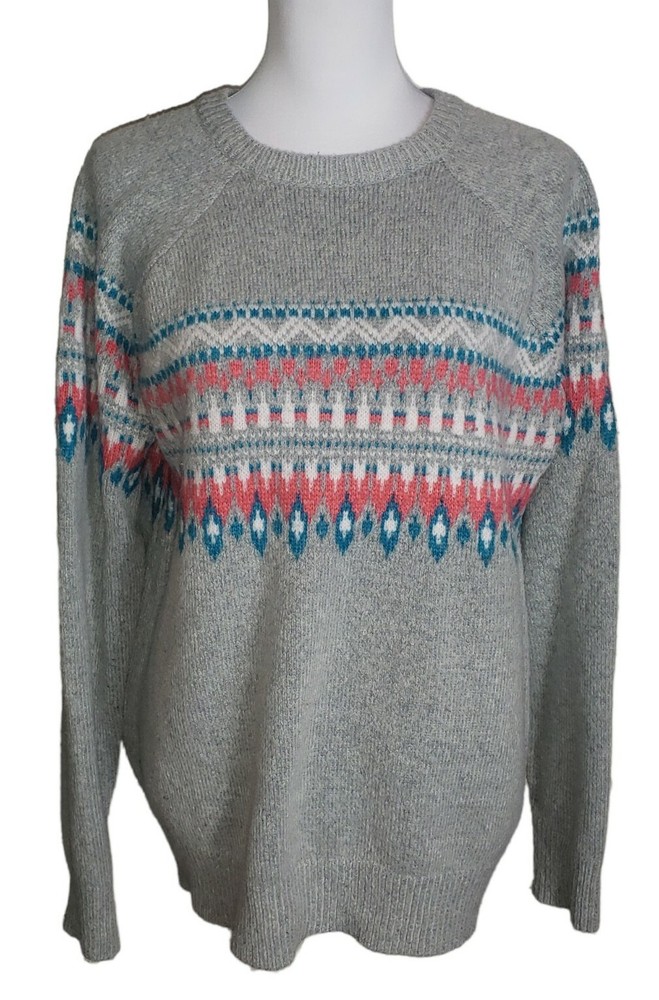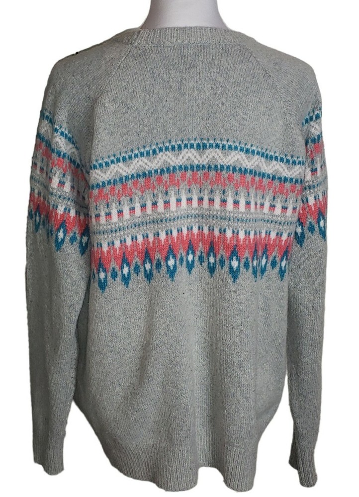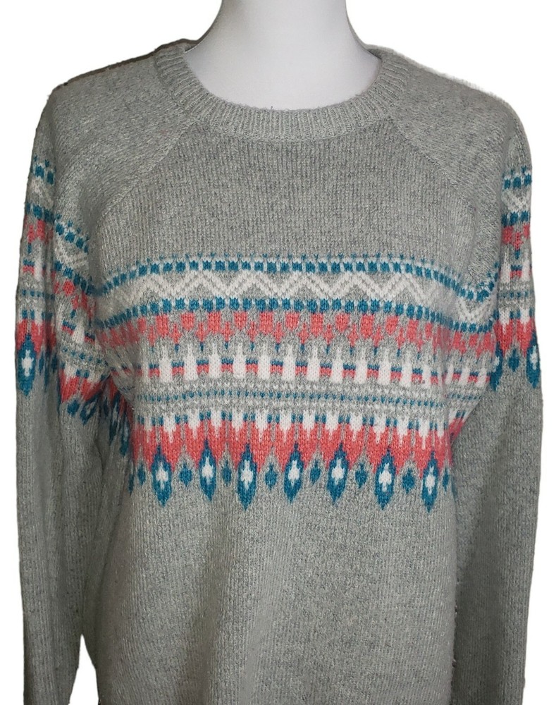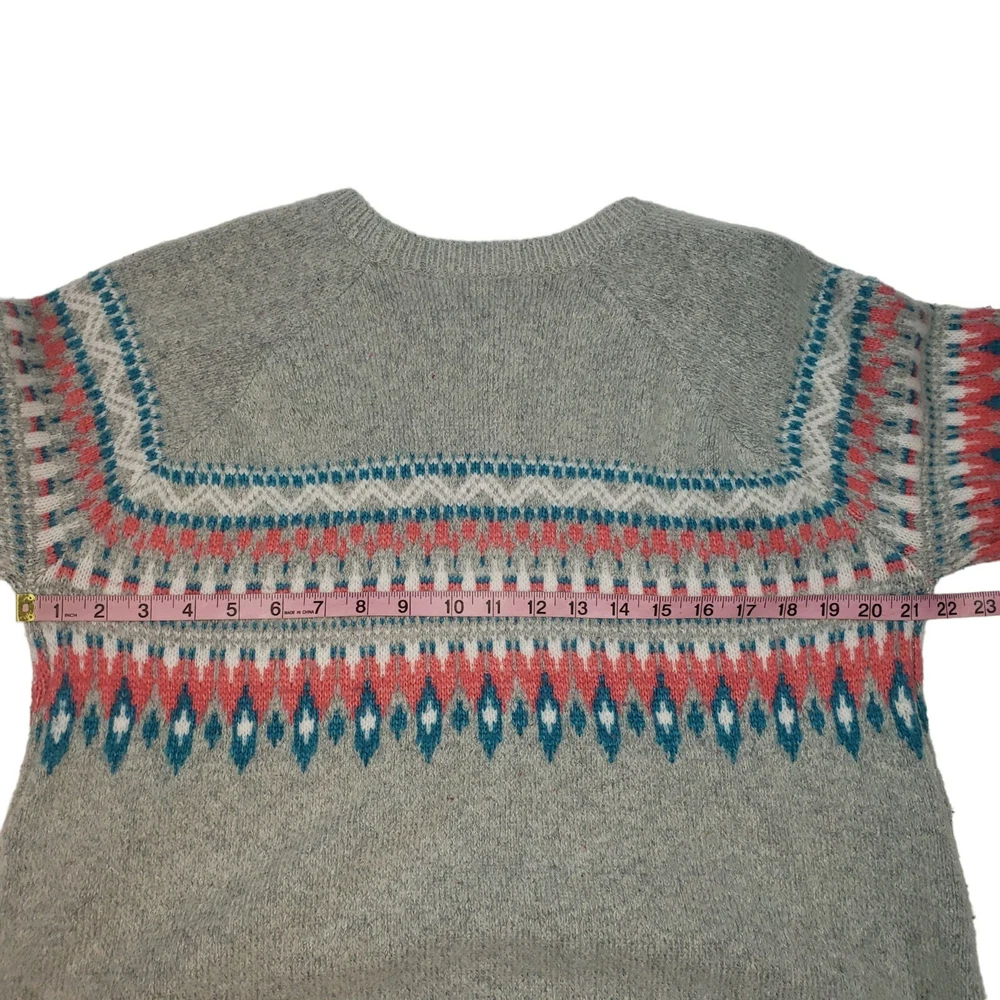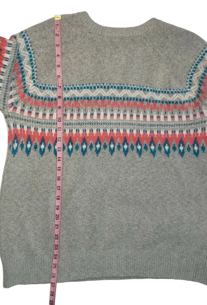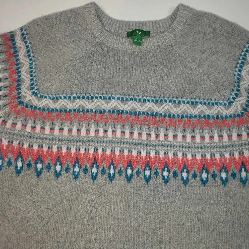 Fair Isle Knit Wool Alpaca Blend Crewneck Sweater Size XL Gray Pink Blue Preppy Dip Sweater Gray in color with a white, blue & pink fair isle pattern Crewneck Long raglan sleeves 56% Acrylic 35% Nylon 7% Wool 2% Alpaca MAY RUN SMALL SO PLEASE REVIEW MEASUREMENTS CLOSELY FOR ACCURATE FIT Size XL Approximate measurements (laying flat) Length 27" Armpit to armpit 21.5" In great pre-owned condition with no stains or flaws noted