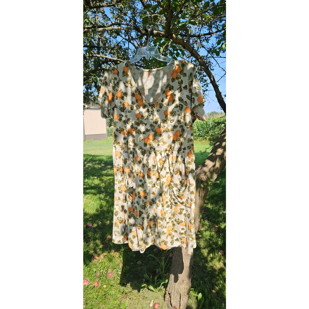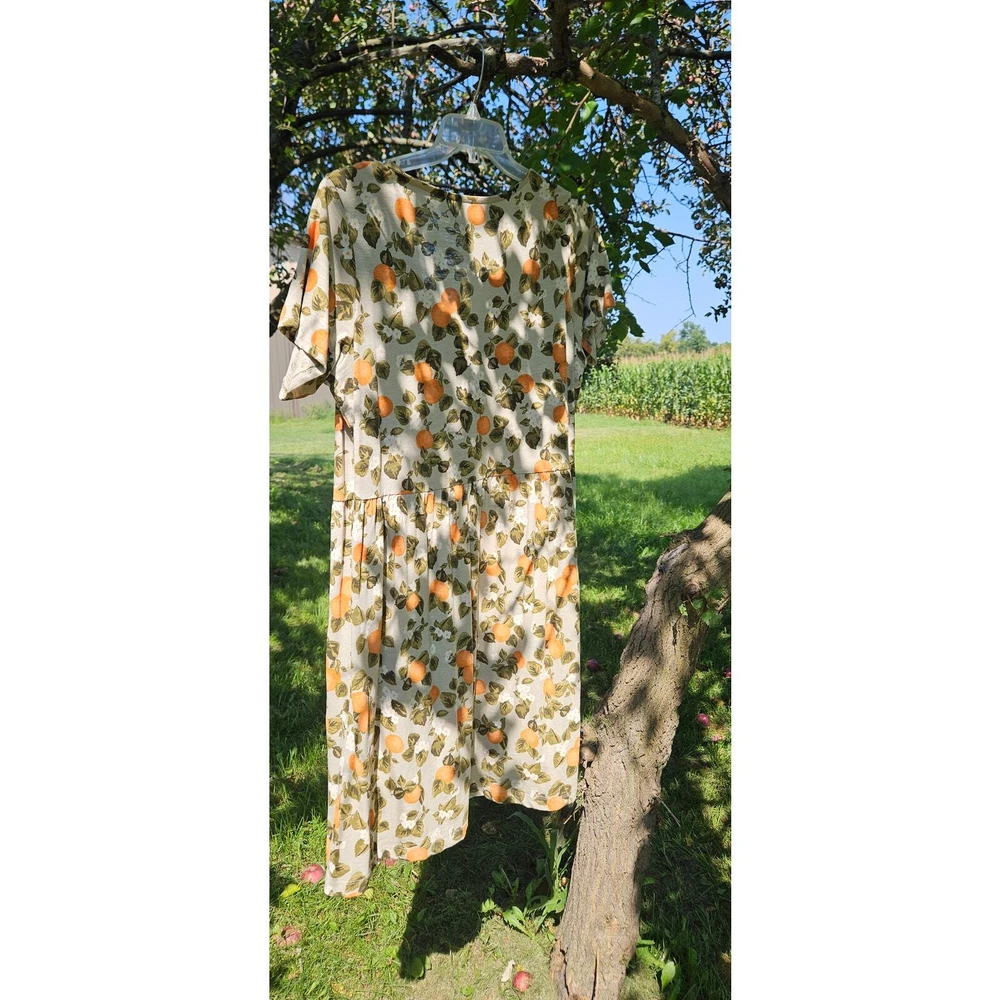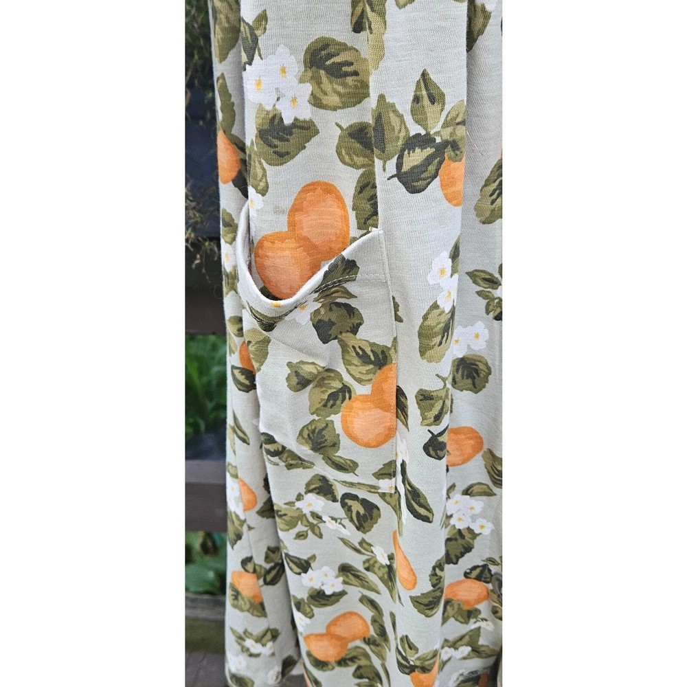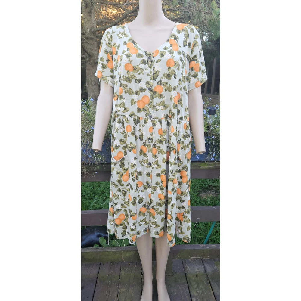 Introducing our Organic Cotton Button-Down Dress, a timeless addition to your wardrobe that effortlessly bridges the seasons. Crafted from soft, breathable organic cotton, this dress promises unparalleled comfort and a gentle touch against your skin. Its classic button-down design is enhanced with a charming front pocket, perfect for stashing small essentials. Adorned with a vibrant pattern of orange oranges and lush green leaves, this dress brings a burst of cheer and freshness to any outfit. Whether you’re basking in summer sunshine or layering up for cooler fall evenings, the eye-catching fruit and foliage design adds a playful touch while keeping you stylish. Pair this versatile dress with your favorite cozy sweater and a pair of boots for a chic autumn look. Its breathable fabric makes it suitable for year-round wear, ensuring you stay comfortable and fashionable from one season to the next. Embrace the beauty of organic cotton and seasonal versatility with a dress that’s as delightful as it is practical. Would make a very comfortable maternity dress.