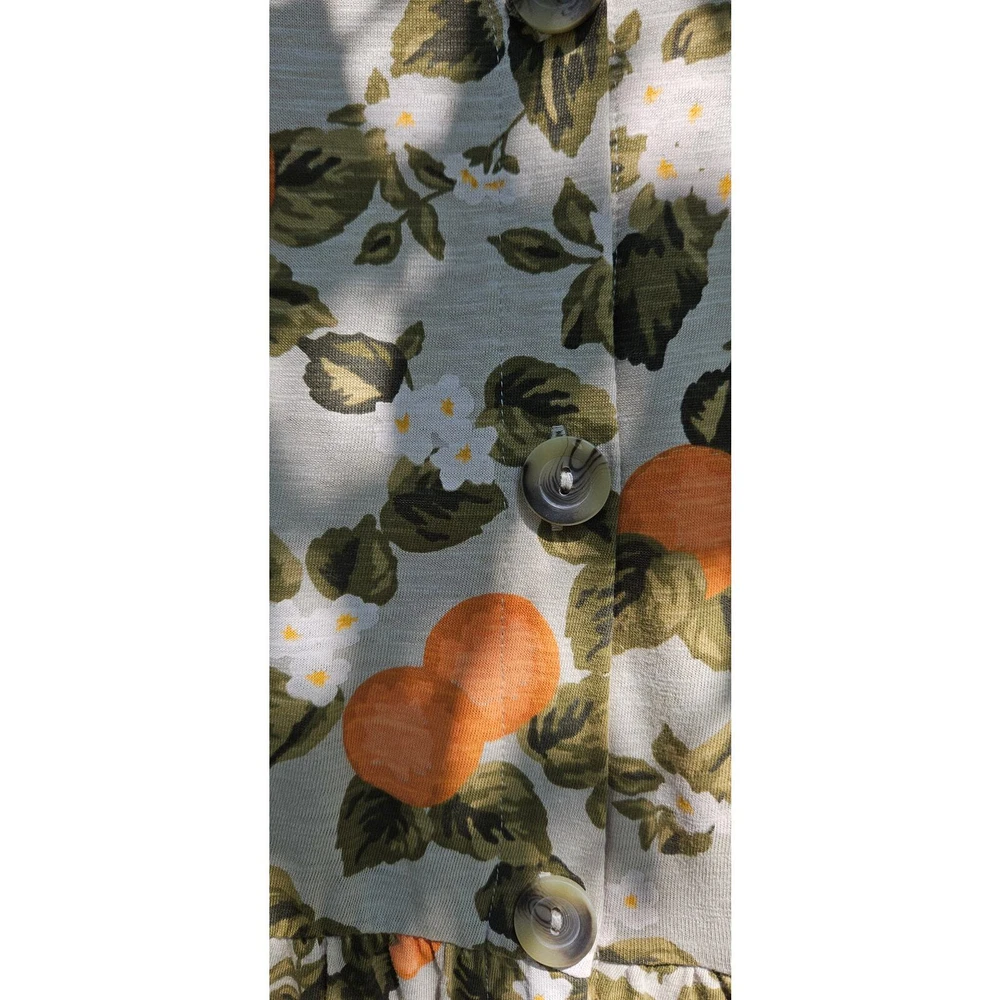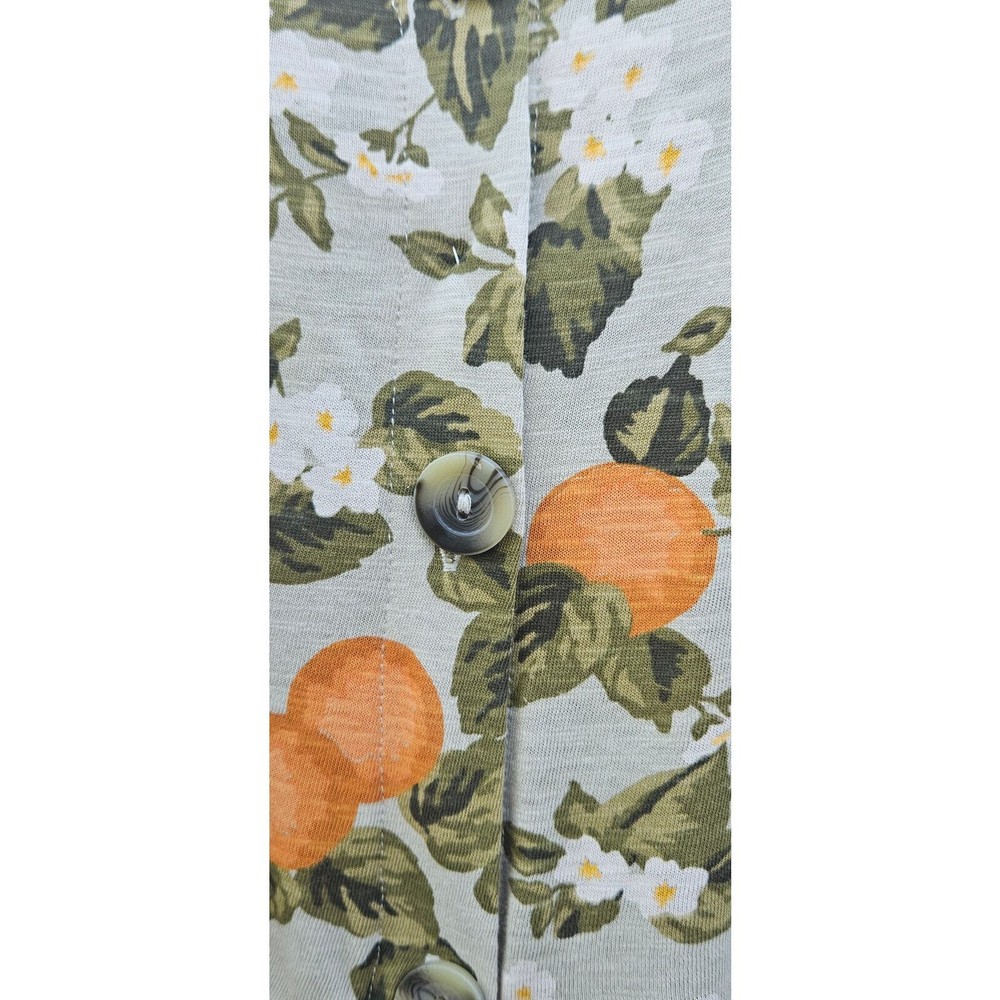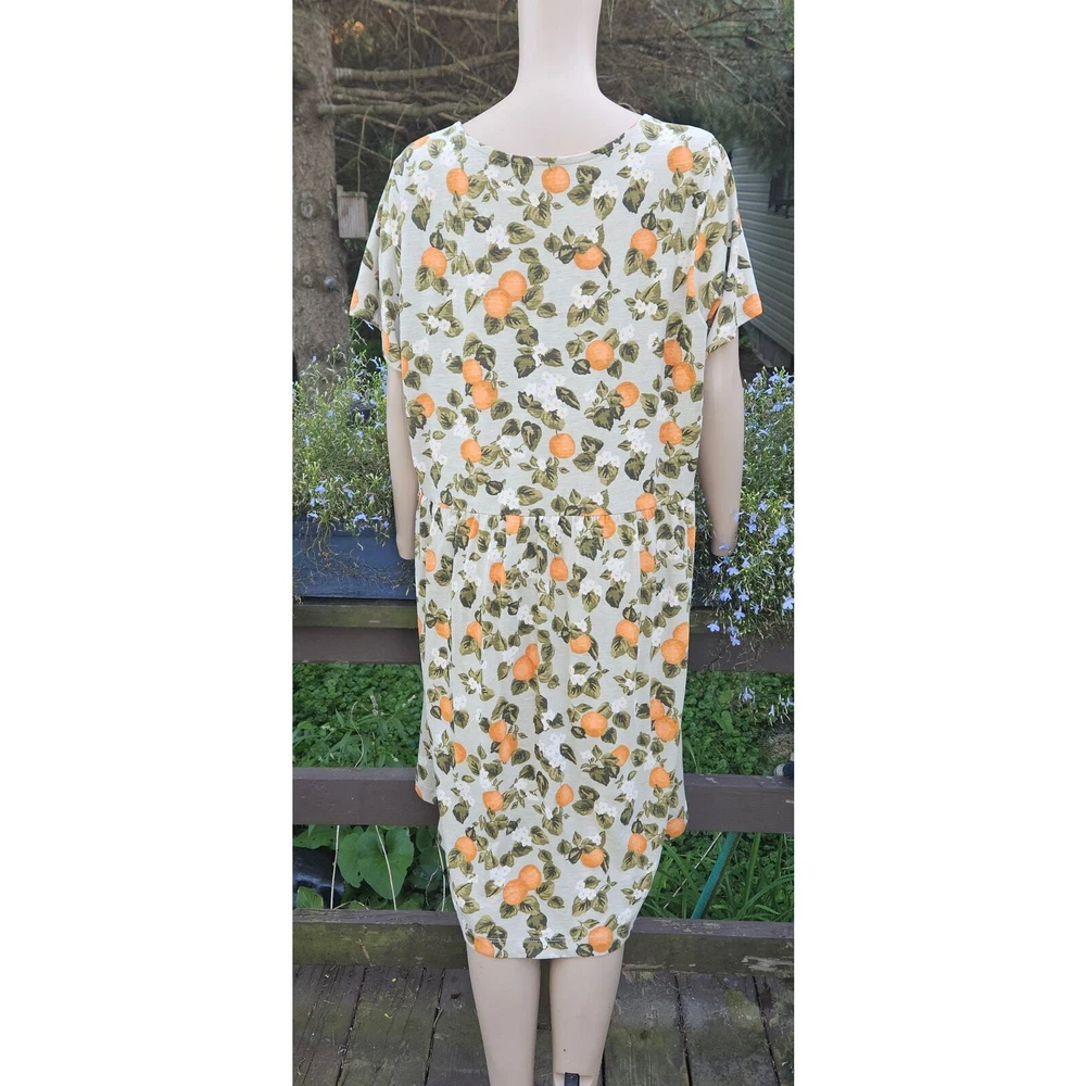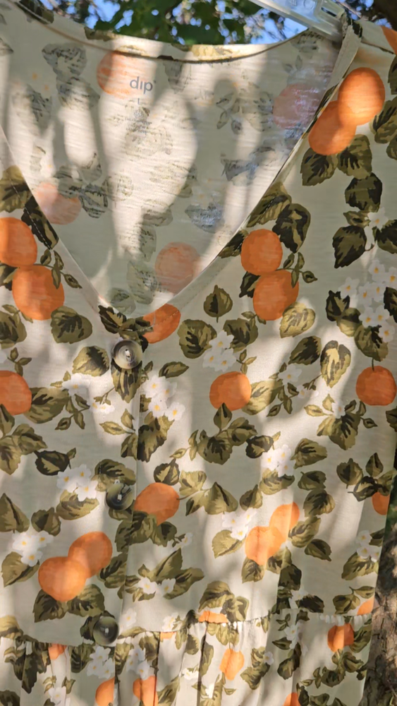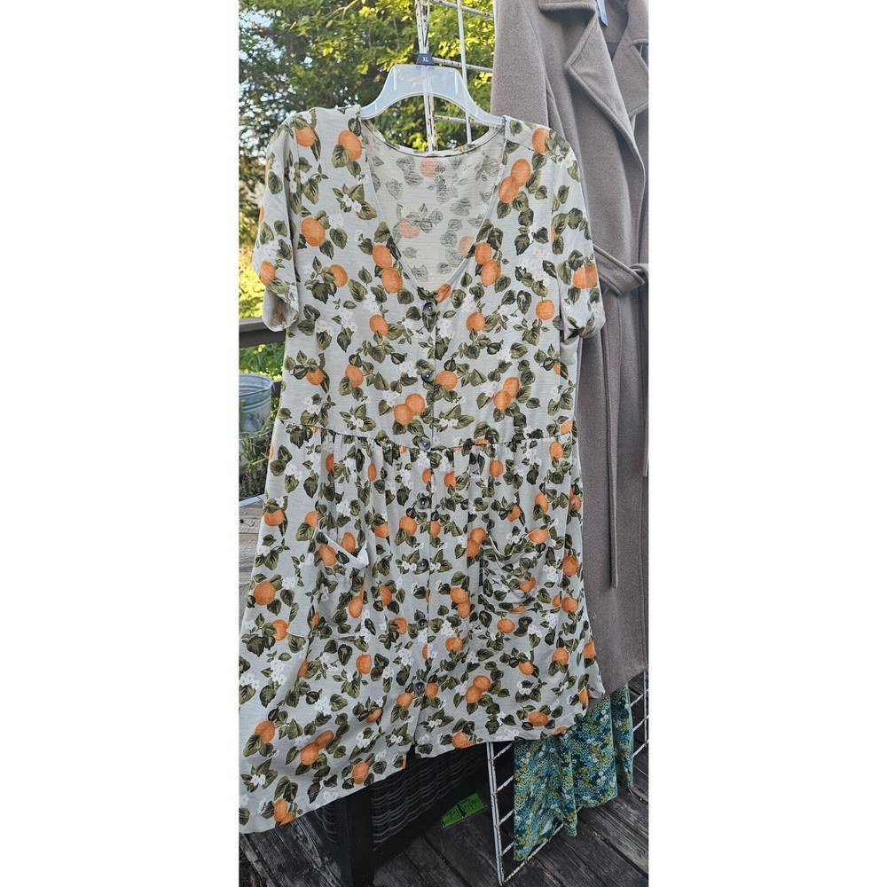 Introducing our Organic Cotton Button-Down Dress, a timeless addition to your wardrobe that effortlessly bridges the seasons. Crafted from soft, breathable organic cotton, this dress promises unparalleled comfort and a gentle touch against your skin. Its classic button-down design is enhanced with a charming front pocket, perfect for stashing small essentials. Adorned with a vibrant pattern of orange oranges and lush green leaves, this dress brings a burst of cheer and freshness to any outfit. Whether you’re basking in summer sunshine or layering up for cooler fall evenings, the eye-catching fruit and foliage design adds a playful touch while keeping you stylish. Pair this versatile dress with your favorite cozy sweater and a pair of boots for a chic autumn look. Its breathable fabric makes it suitable for year-round wear, ensuring you stay comfortable and fashionable from one season to the next. Embrace the beauty of organic cotton and seasonal versatility with a dress that’s as delightful as it is practical. Would make a very comfortable maternity dress.