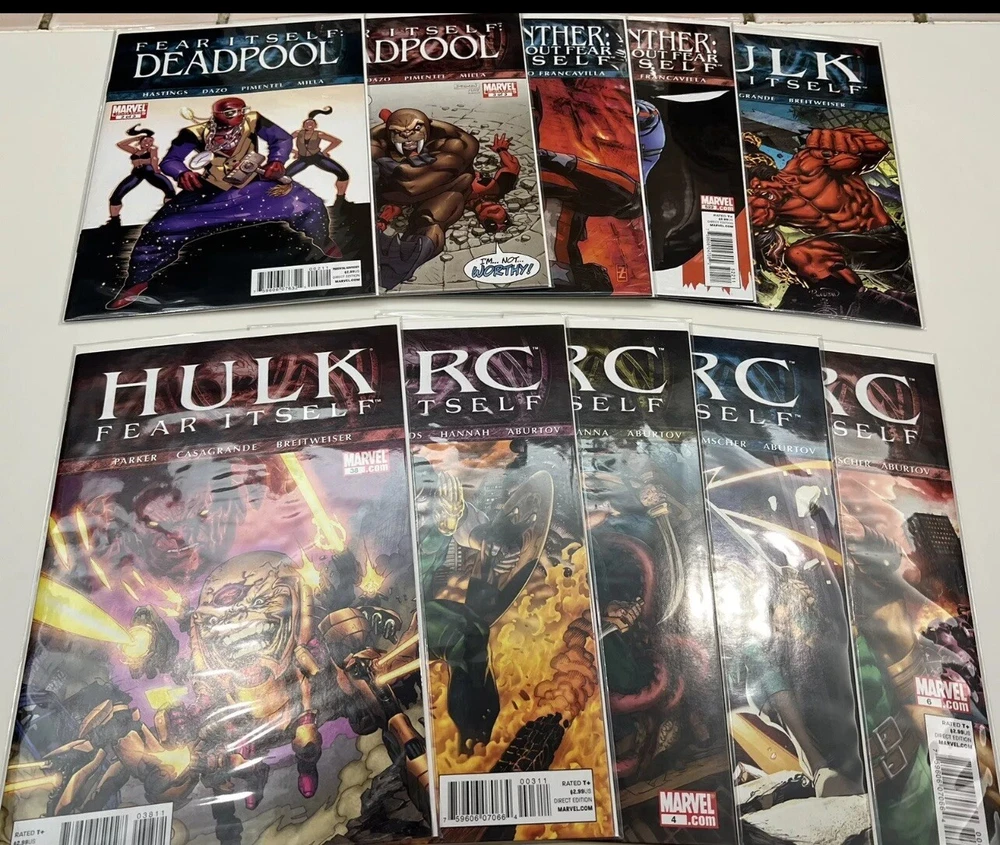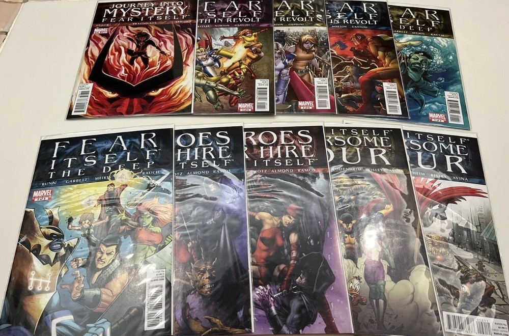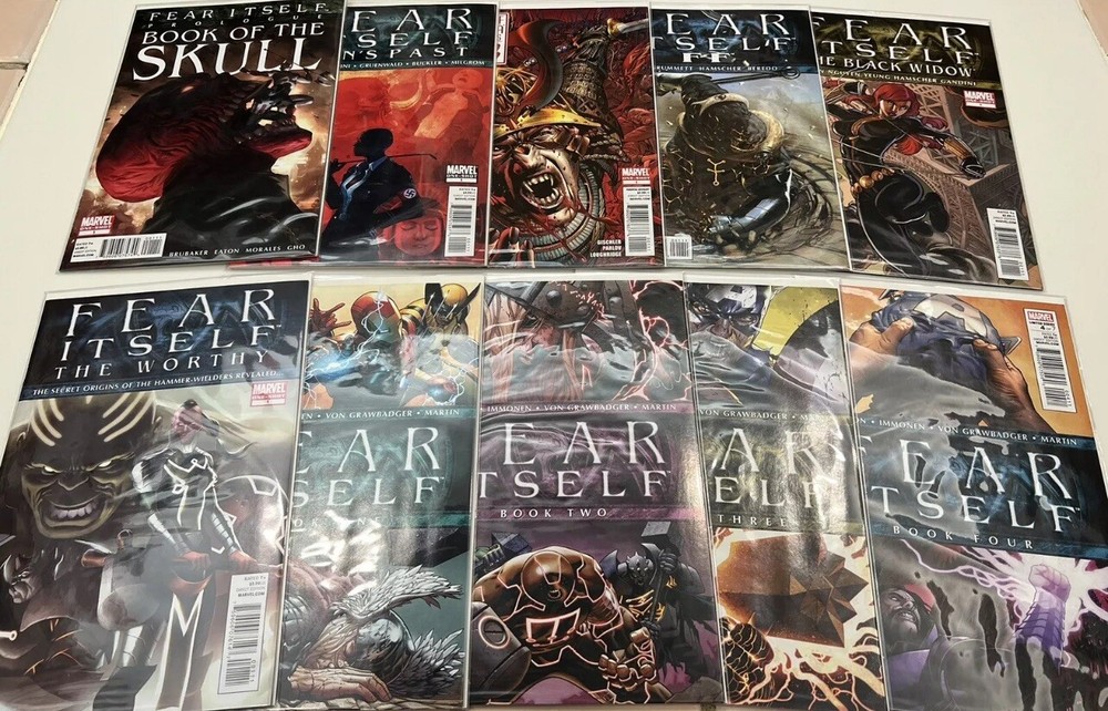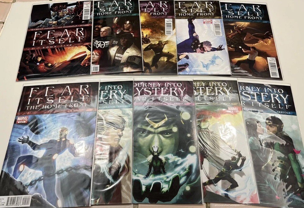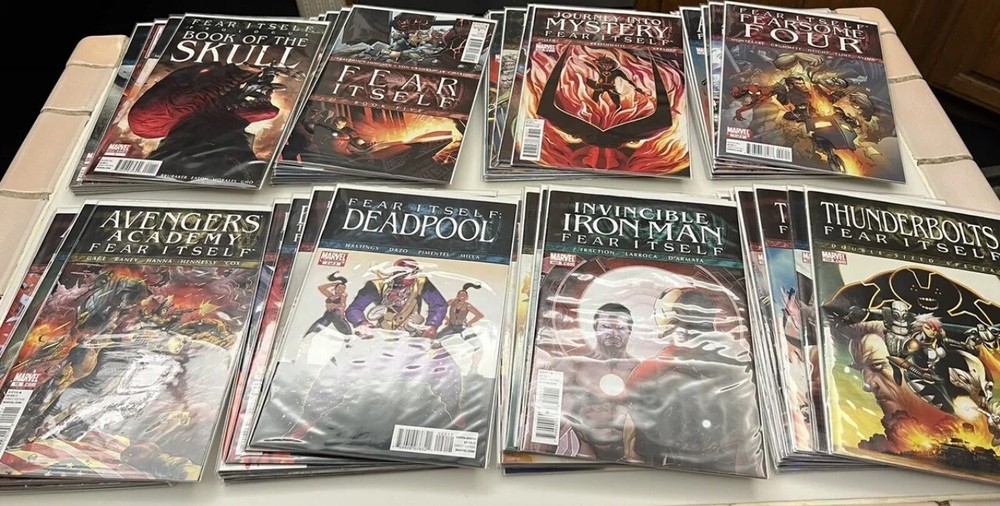 This listing is for a bulk lot of Marvel’s Fear Itself Comic books produced in 2011. It is an incomplete run but there are 80 issues present in total. Several of the sub - series are 1 or 2 issues away from being complete. I am not a grader in any way but these were only read once at time of purchase and then bagged and boarded and stored in a dark closet for several years. I feel that these are all near mint to mint condition. The following issues are included: One Shots: Book of the Skull Sin’s Past Tomb of Dracula: Throne of Blood FF - Future Foundation Black Widow The Worthy Series: Fear Itself 1 - 5 The Home Front 1 - 5 Journey Into Mystery 622 - 626 Youth in Revolt 1 - 3 The Deep 1 - 2 Heroes for Hire 9 - 10 Fearsome Four 1 - 3 Avengers 13 - 16 Secret Avengers 13 - 15 New Avengers 14 - 15 Avengers Academy 15 - 18 New Mutants 29 Uncanny X-Force 1 - 2 Uncanny X-Men 540 - 542 Wolverine 1 - 2 Deadpool 1 - 3 Black Panther 521 - 522 Hulk 37 - 38 Herc 3 - 6 Invincible Iron Man 503 - 507 Iron Man 2.0 5 - 7.1 Thunderbolts 158 - 162 Spider-man 1 - 3 Alpha Flight 1 - 3 The items are pictured are what you will receive and come from an adult collector in a smoke free home. Please feel free to contact me with any questions you may have. Thanks for looking.